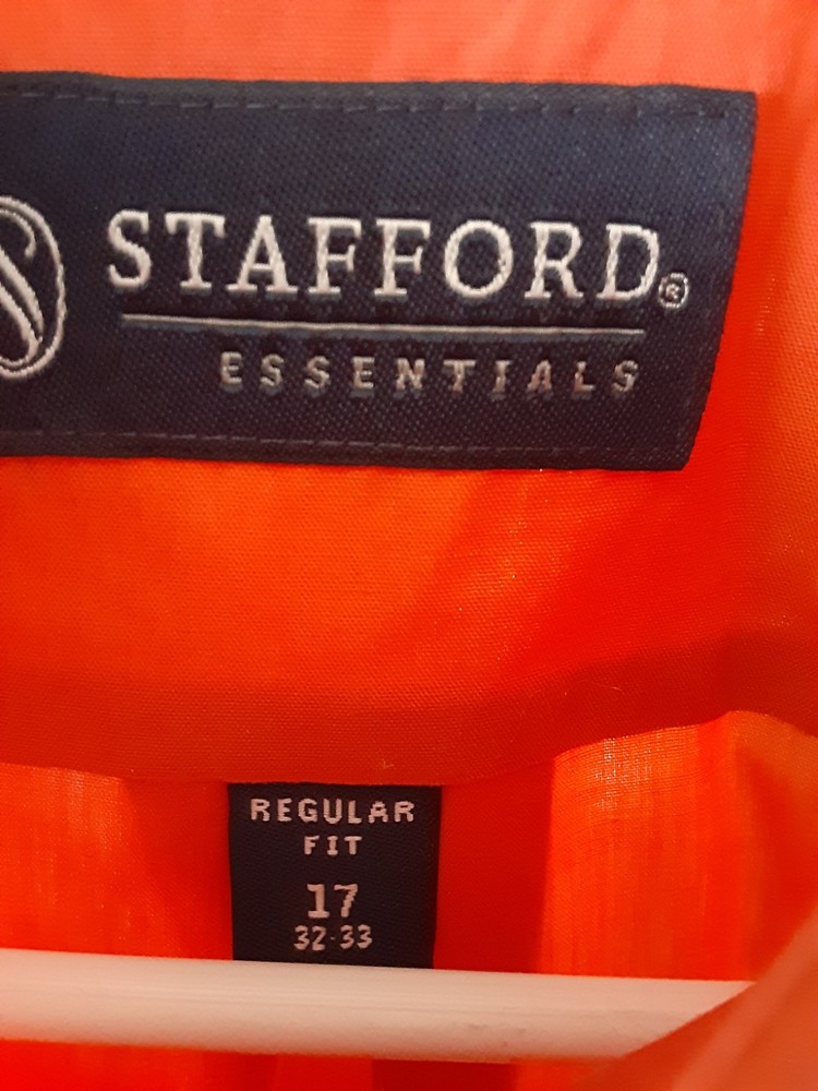 The Stafford Essentials Large dress shirt is a classic and stylish option for men looking for a sophisticated wardrobe staple. Made from a blend of polyester and cotton, this shirt offers a comfortable and durable feel. The salmon color and collared neckline with a button closure give it a polished and timeless look. With a regular fit and a 32/33 sleeve length, this shirt is perfect for any man's dress shirt collection, especially with its brand reputation and quality construction. The 17-inch neck size ensures a proper fit for a smart and tailored appearance.