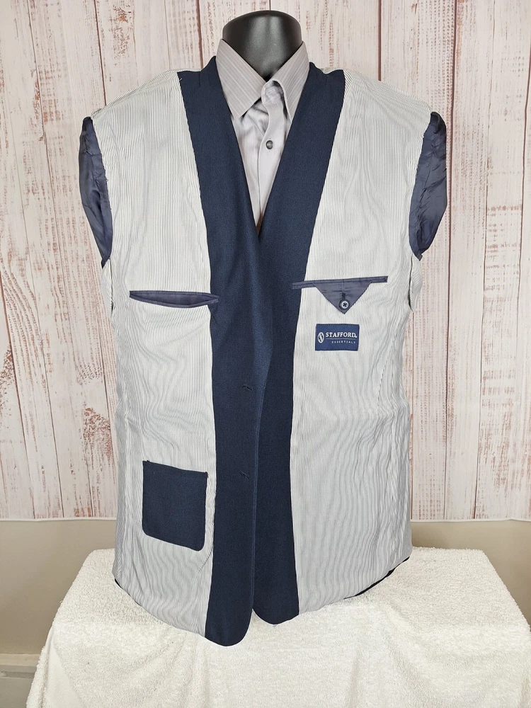 Stafford Jacket Blazer Mens 44R Navy Blue Double Vented Quality used condition. Please check out the measurements before buying to ensure a perfect fit.Vents have not been opened still sewn Shirt Size on Label 44R Shoulder- Hem 32.00'' Shoulder- Shoulder 20.00'' Shoulder- Wrist 25.00'' Armpit- Armpit 23.00'' Top button 22.00'' Everything ships within a day. Feel free to message me with any questions. Thank you very much. 10/1/24