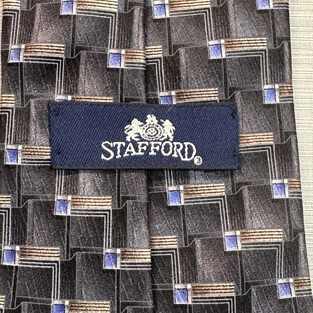 Stafford Mens Tie Black Geometric Pattern Traditional 100% Silk USA NeckTie Gender: Men's Brand: Stafford Color: Black, Blue, Bronze Black with Blue and Bronze Geometric Pattern Versatile, Traditional and Stylish Design 100% Silk Made in USA Approximate Measurements Not Exact: Width: 4" Length: 57" Pre-Owned in Excellent Condition (EUC) *Colors may vary depending on lighting and individual viewing devices Offers Welcomed Bundle Discounts Available Fast Shipping 5 Star Seller Thank you for shopping my closet! Location 1 - 0718 Mens, Men's, Silk, United States, USA, Neck Tie, Suit, Business, Sunday Best, Corporate, CorpCore, Classic, Classy, ClassicCore, Office, Formal, Semi-Formal, Traditional, Geometrical, Geometric, Workwear, Career, Pastor, Lawyer, Academia