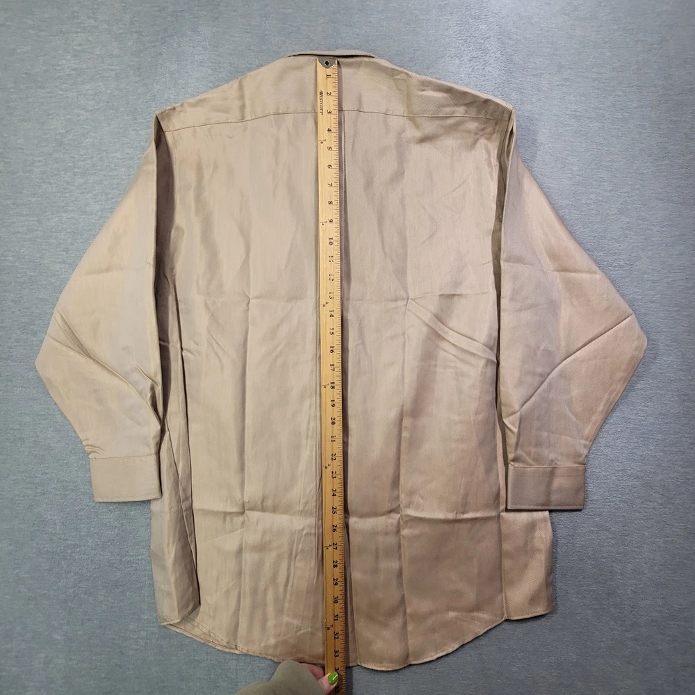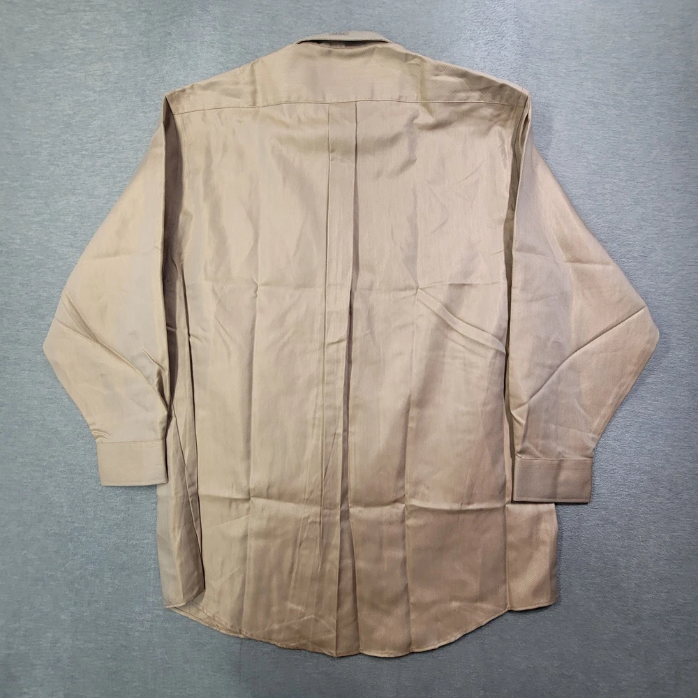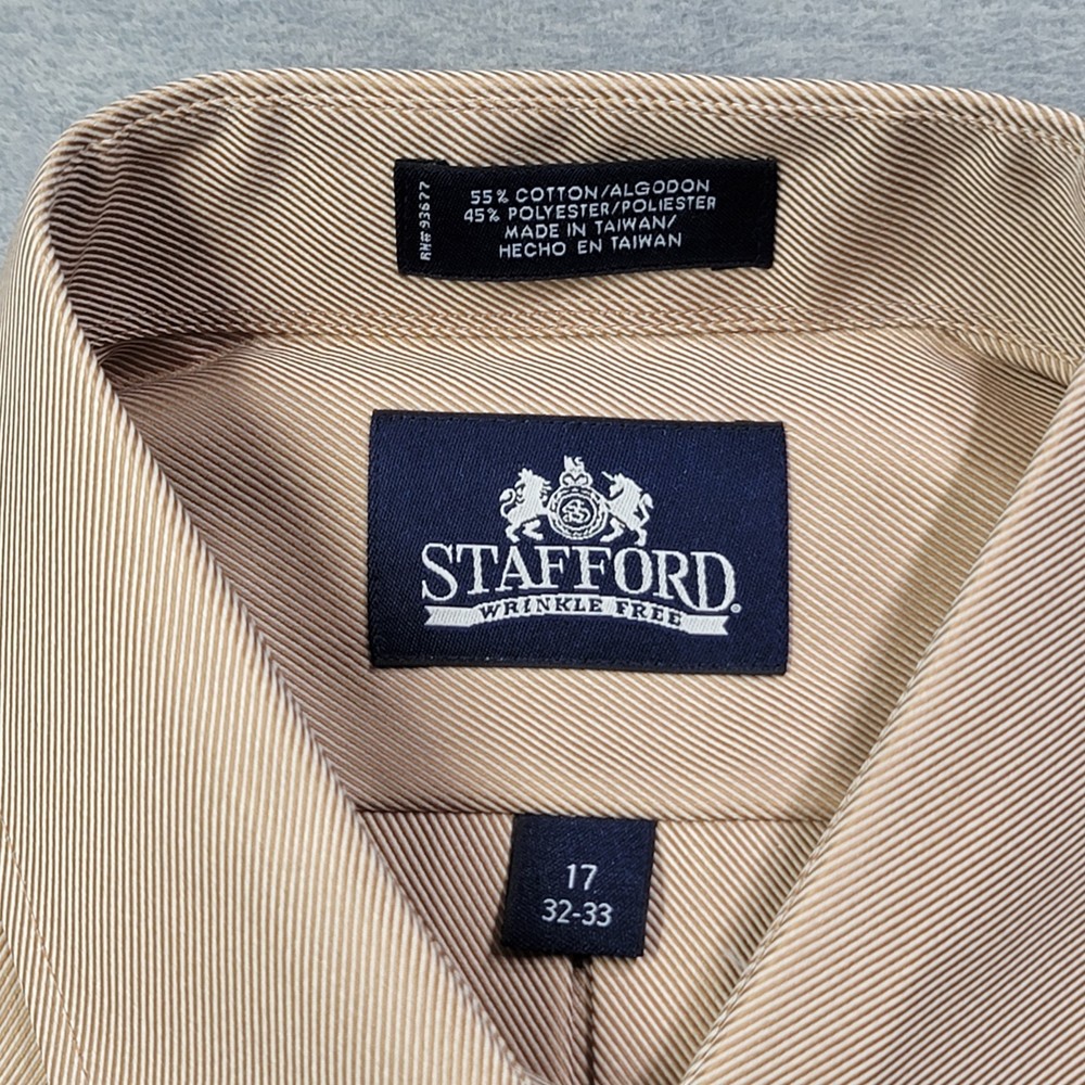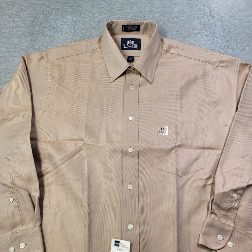 The Stafford Shirt is a classic men's dress shirt in a solid tan color, featuring a collared neckline, button closure, and long sleeves with a 32/33 sleeve length. Made from a blend of polyester and cotton, this wrinkle-free shirt is designed for a classic fit and includes a chest pocket for added functionality. The spread collar and barrel cuff add a touch of sophistication to this timeless piece, perfect for any formal or professional occasion.