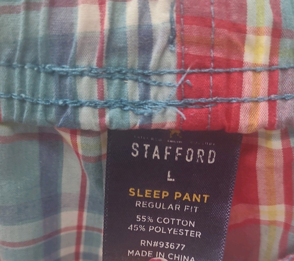 The Stafford Sleepwear Men’s Pajama Pants in size L offer a comfortable and stylish loungewear option for men. Made from a blend of polyester and cotton, these plaid pants feature a drawstring closure for a customizable fit. The classic multicolor design is perfect for any season, with a lightweight feel for added comfort while sleeping or lounging. Easy to care for with machine washable material, these pajama pants are a practical and timeless addition to any man's sleepwear collection.