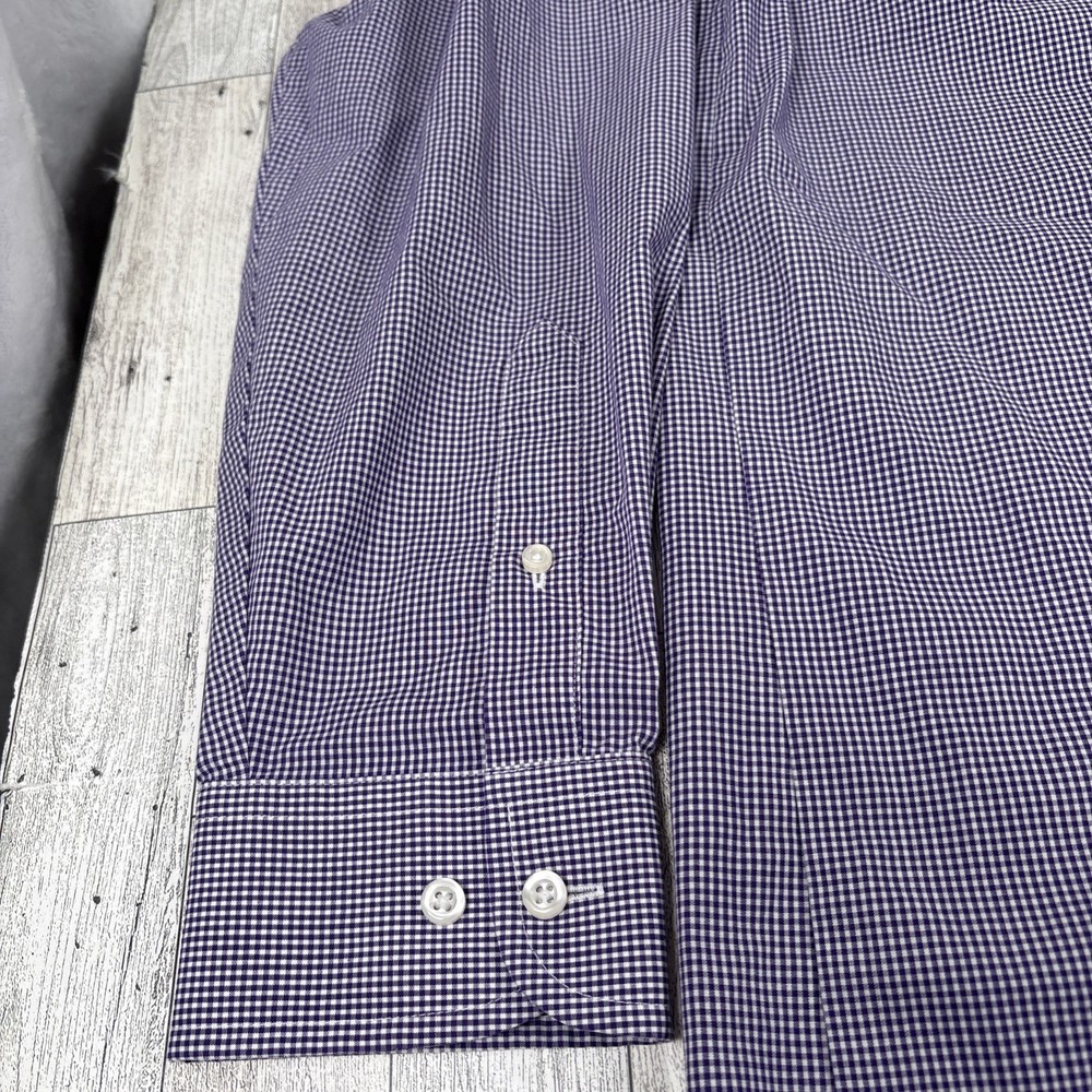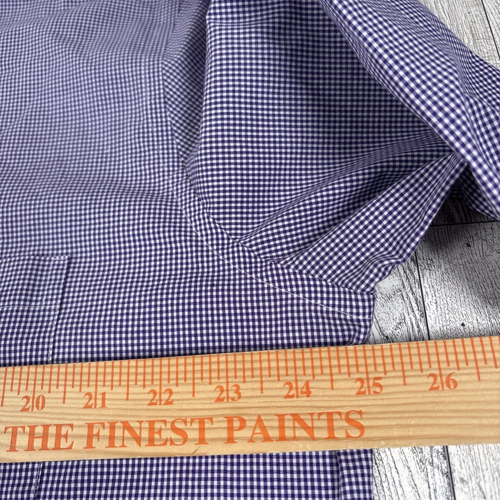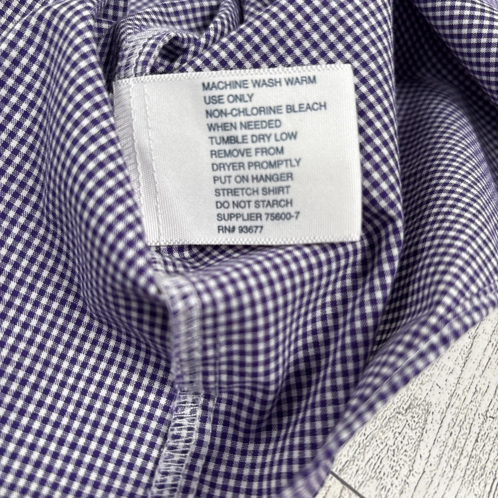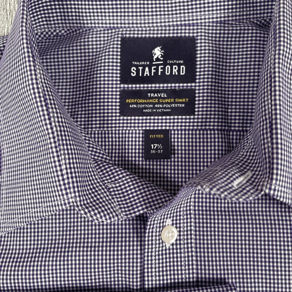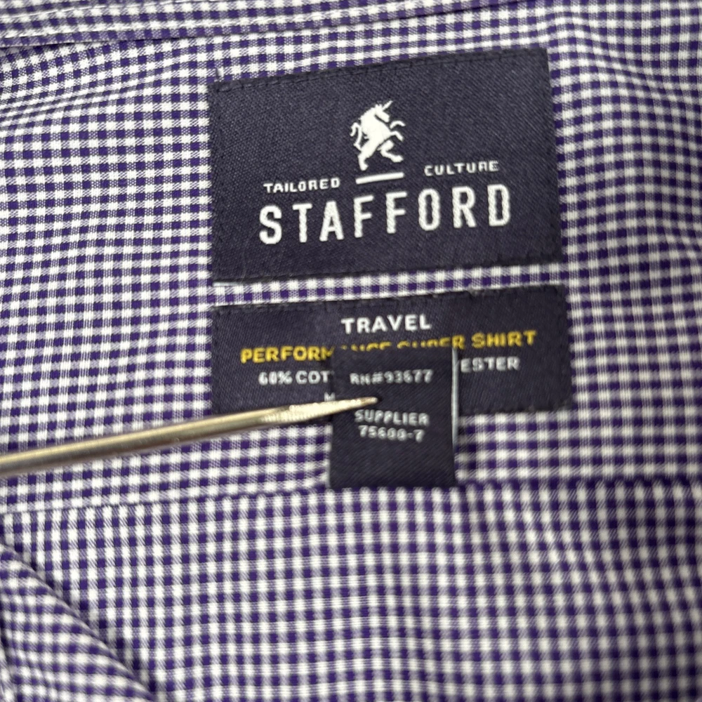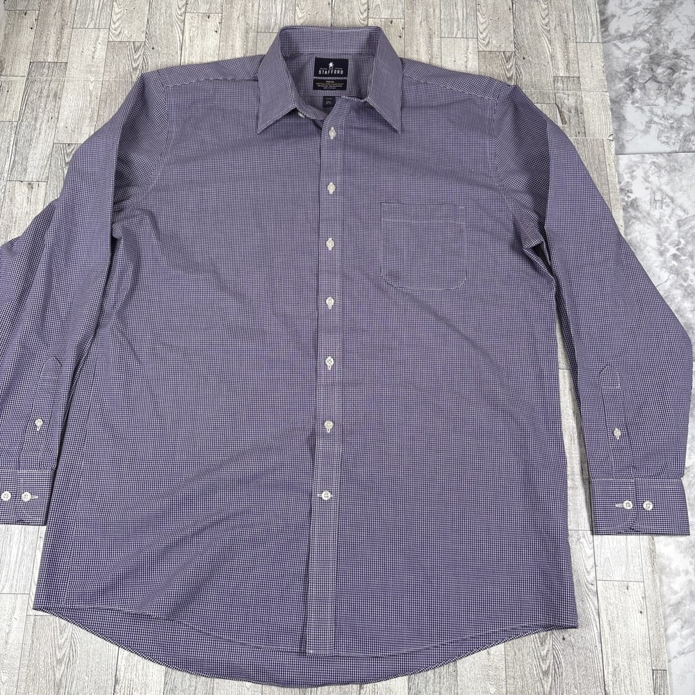 See photos for condition and measurements. Classic Stafford Travel Performance men’s dress shirt in a purple gingham check pattern. Preowned and in excellent condition with no stains, holes, or fabric wear. Features wrinkle‑resistant fabric, and a comfortable performance stretch blend. Perfect for office, business casual, or travel.