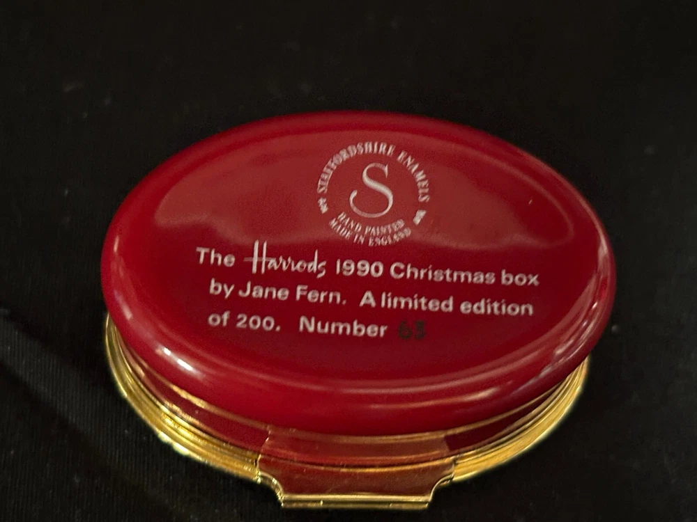 Staffordshire Enamel Trinket Box "1990 CHRISTMAS BOX ~ HARRODS" ~ LE 63/200 L & M Landing Store Terms We make every attempt to show our listings as they truly are. If the pictures or descriptions are not clear, please contact me. Positive Feedback is very important to us. We strive to always have repeat customers that have a great experience shopping at our store. If for any reason you are not completely satisfied with your purchase, please contact me and we can resolve the issue together. Buy Now – Payment is due immediately ***PLEASE BE SURE YOUR SHIPPING ADDRESS IS UPDATED*** Auctions – Payment due within 3 Days We do offer combined shipping for multiple purchases. All overpaid shipping costs will be refunded at the time of shipping. We are a member of the Global Shipping Program in order to accommodate customers in other countries. SHIPPING TIME: Your item will be shipped the next business day after cleared payment has been received. You will receive shipping notification through eBay shipping or through PayPal shipping when your item is mailed. PLEASE be sure your shipping address is correct. Most of the items listed come from estate sales, auctions, garage sales, consignments and/or private sales. As such, I normally don't know the history of the item nor how it was stored.
