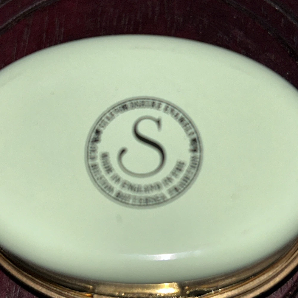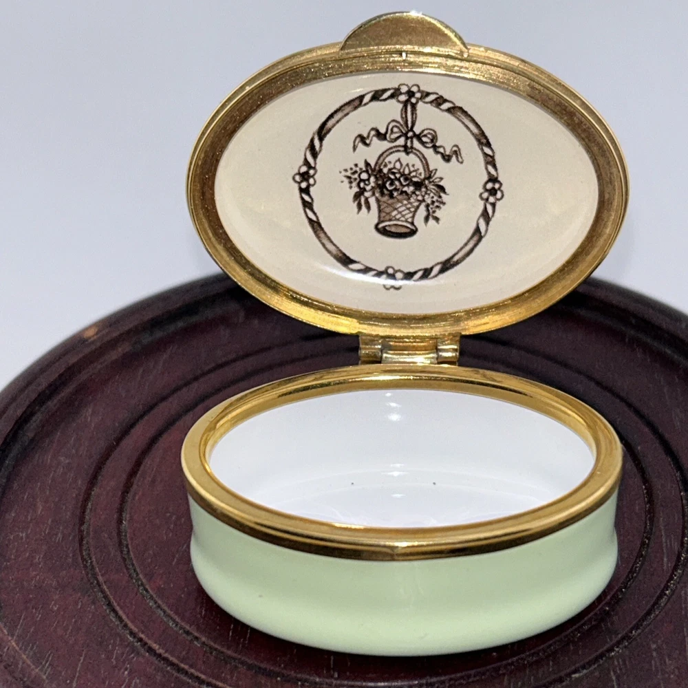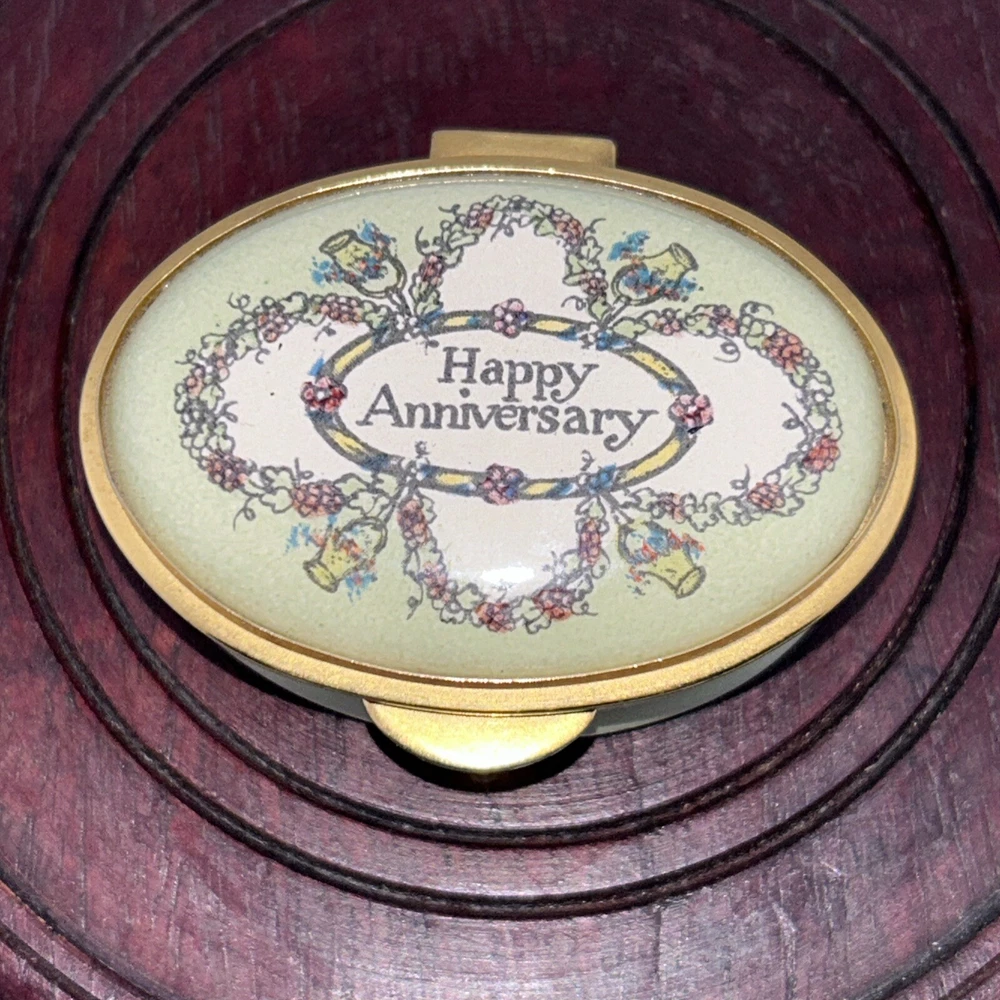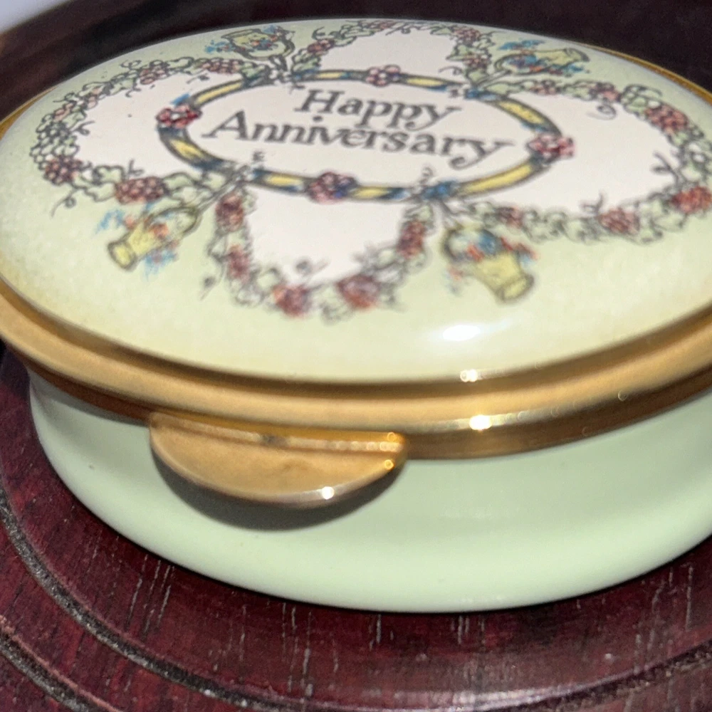 This beautiful Staffordshire enamel trinket box is the perfect gift for any happy anniversary. The oval shape and mint color make it a lovely addition to any collection. The box is made of high-quality enamel and features a happy anniversary subject, making it a thoughtful and romantic gift. The small size makes it ideal for storing jewelry, trinkets, or other small items. It comes boxed and is made in Staffordshire, England. This trinket box is a must-have for any collector or for anyone looking for a unique and meaningful gift.