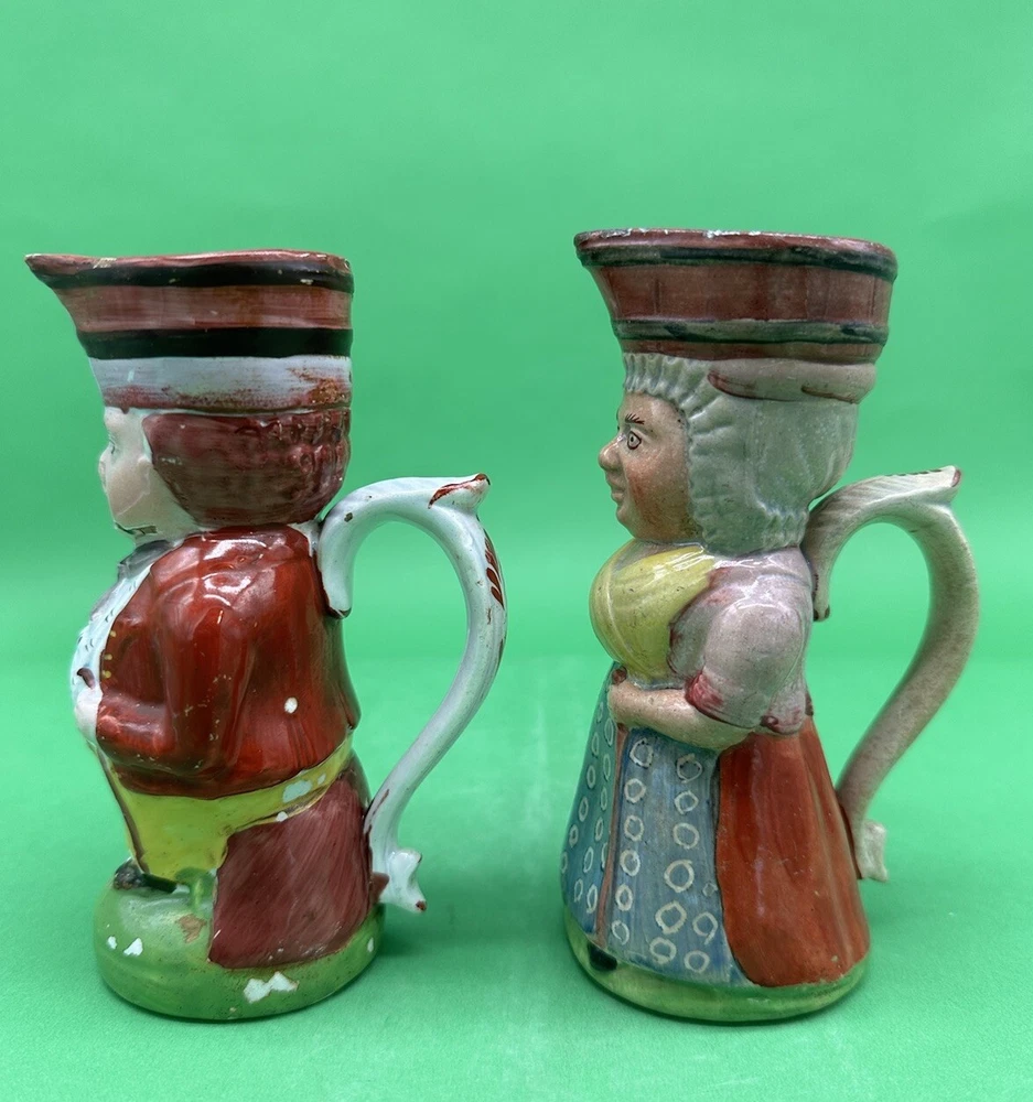 Staffordshire Covent Garden Oyster Sellers Pair of Toby Jugs c.1830 Height: 5.5" Darling Male & Female Pair of Oyster Seller toby jugs produced in Staffordshire England circa 1830. The Oyster Seller was one of the many street vendors common throughout England in the 1800s especially Covent Garden. She is dress in the common garb of the day and is carrying a basket on her head with the oysters. We offer combined shipping discounts on multiple purchases. Your new favorite tiny Tobies will be securely wrapped and packed, and a full guarantee is given on all sales. *British Collectibles is owned and operated by The American Toby Jug Museum Curator Kevin Pearson of Kevin Francis Ceramics . Please check out the rest of our shop's Toby & Character Jugs, Majolica Pitchers, Royal Bayreuth, Banksy Street Art and Kevin Francis Face Pots. If you have any further questions please do not hesitate to ask. Cheers!