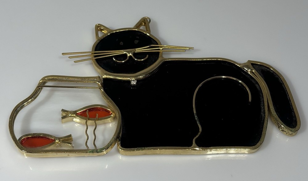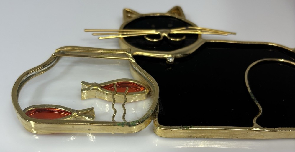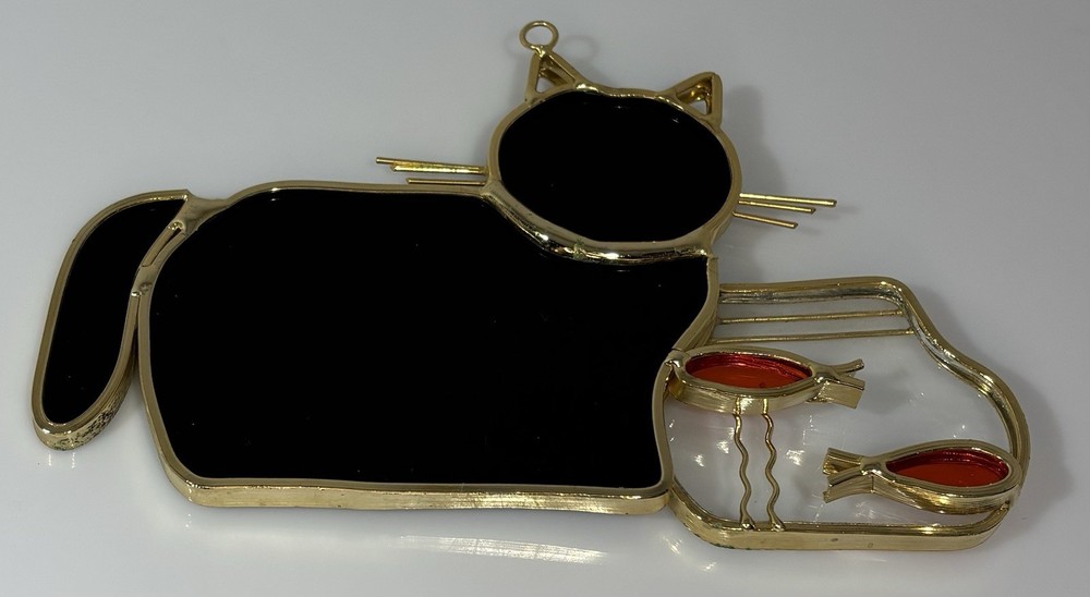 This Stained Glass Art Cat with Goldfish Bowl Decoration Sun Catcher is a small, multicolored piece made from glass that adds a touch of whimsy to any room. The glossy finish and intricate design featuring a cat and goldfish bowl make it a charming decoration for teens, adults, and kids alike. To clean, simply wipe with a damp cloth. Perfect for hanging in any room, this suncatcher brings a unique and artistic flair to your home décor. This has some corrosion see pictures.