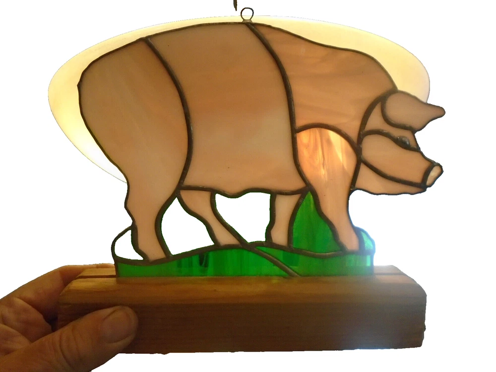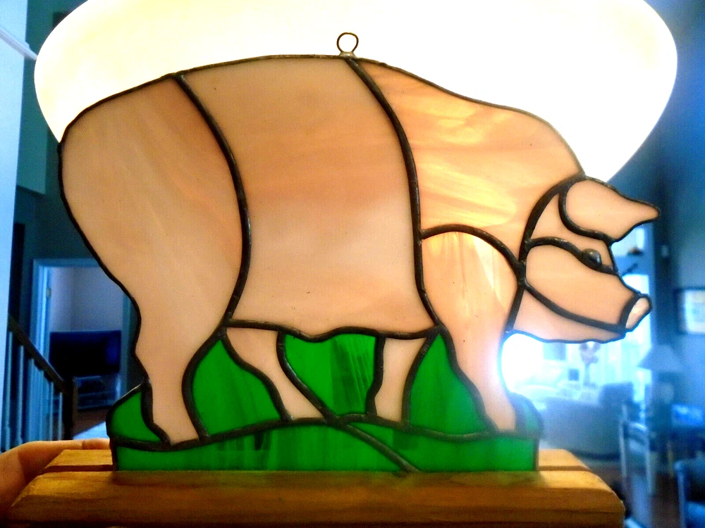 Here is a cute fellow! A pink leaded glass " PIG " on a wooden stand, but can be made to catch the sunlight as he has a ring attached to the top of the piece to hang. The stained glass Pig is 8" long, 5.5" tall. Perhaps you have a spot in your home decor for such a charming piece. Thanks for looking !