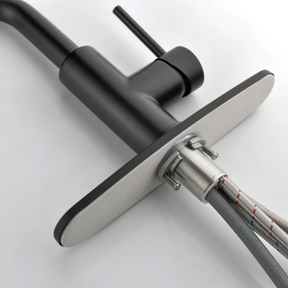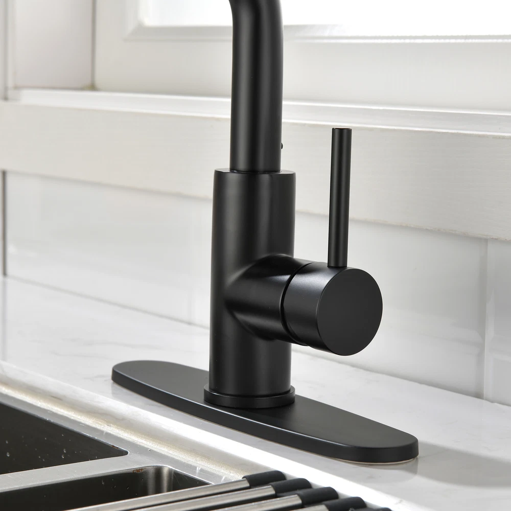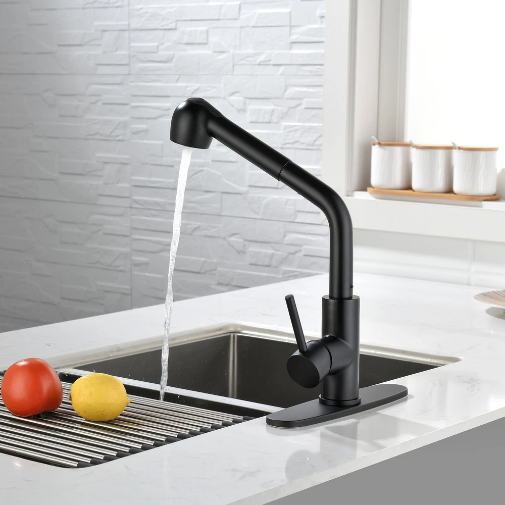 Single-Handle Pull-Out Sprayer Kitchen Faucet in Stainless is loaded with user-friendly features and has a look that matches any kitchen decor. This faucet is equipped with Seal Technology that reduces the chance of water coming in contact with potential metal contaminants once inside the faucet. This results in cleaner water-Clean soft rubber nubbins enable you to easily wipe away calcium and lime buildup with just the of a finger. The construction and functionality give you a faucet that's built to last up to five million uses. The included escutcheon completes the ensemble for a finished look. Stainless, a neutral, low-gloss finish Fits 1- or 3-hole 8 in. installations with optional matching escutcheon (included) lever handle to easily adjust the water volume and temperature Pull-out that swivels 120 degree for added convenience Switch for easy toggling between a spray and stream Limited lifetime manufacturer warranty covering the parts and finish defects Faucet can be installed with or without included deck plate (escutcheon)