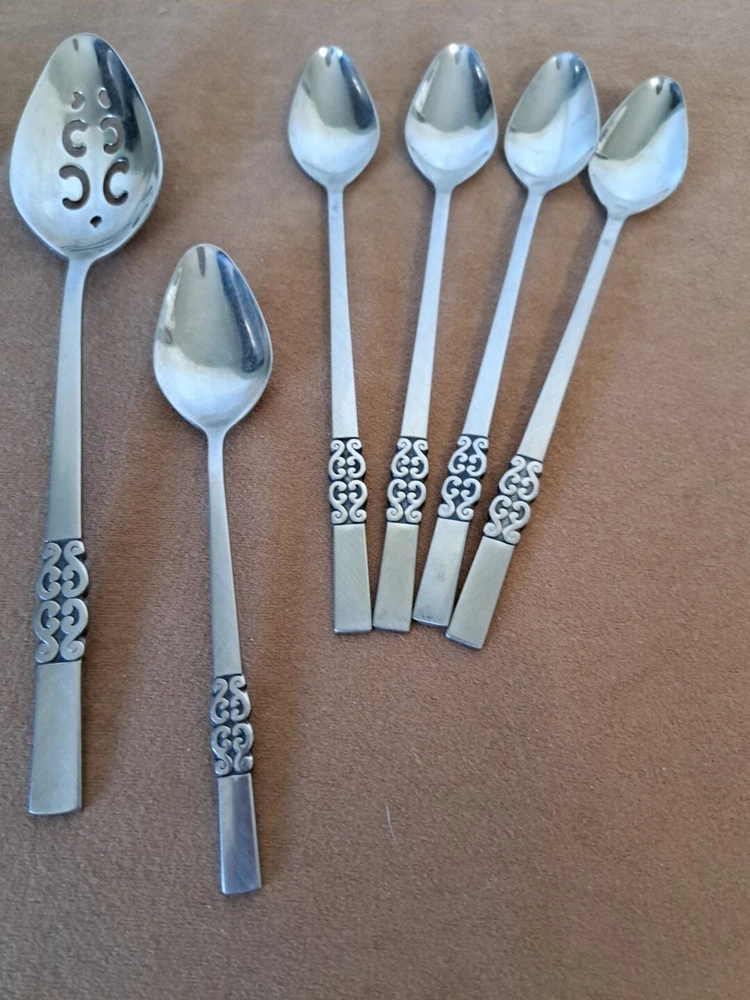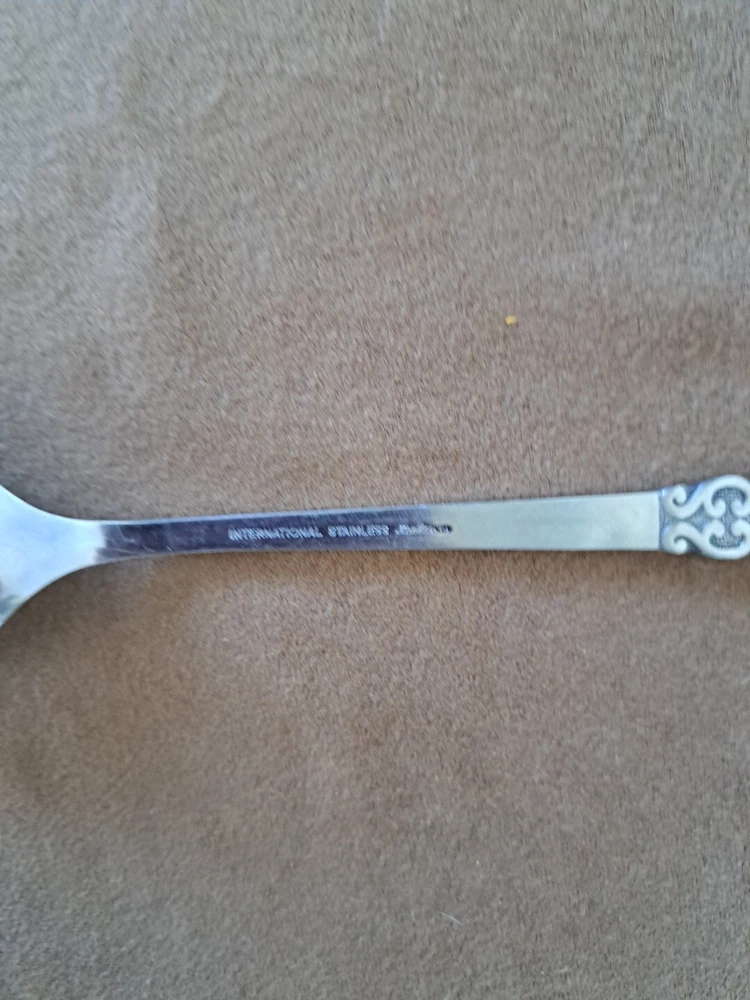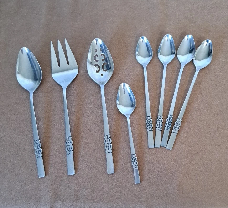 International Deluxe Stainless Serving Ware Silverware Serving spoon 9 inch, slotted serving spoon 9 inch, serving fork 9 inch, 4 parfait spoons 7.5 inch, 1 spoon 6.5 inch. Scroll design, see pics.