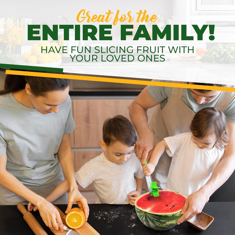 Innovative Windmill Blade Design: Revolutionize your watermelon slicing experience with our unique windmill-like automatic cutter blade. Simply insert the slicer into the watermelon, and let the device do the work effortlessly. Food Grade Safe Design: Crafted from top-notch stainless steel and food-grade PP material, our watermelon slicer guarantees a secure experience, suitable even for children. Easy to Use, Easy to Clean: With just a single-handed operation, our windmill slicer provides ease like never before. Cleaning is a breeze too – a quick rinse with water or a touch of detergent does the job effectively. Space-Saving Kitchen Accessory: Featuring a compact design and a convenient delta hanging hole, our rolling watermelon slicer ensures minimal storage space requirement when not in use. Melon Scooper Included: In addition to the watermelon windmill slicer, each package also includes a handy melon baller scoop. Effortlessly create bite-sized melon or ice-cream balls with this bonus tool. Product Description