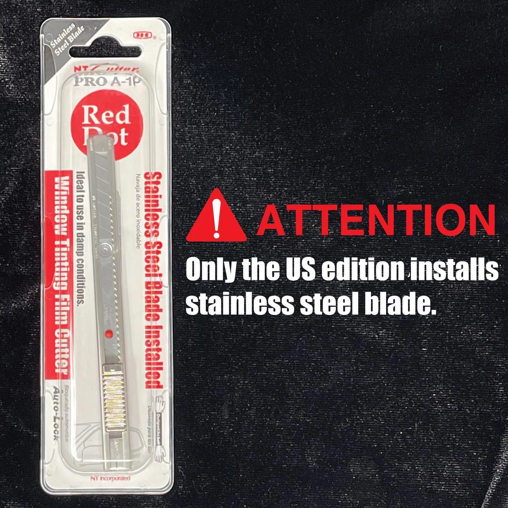 NT's Pro-line stainless steel knife is often referred to as the "Red Dot" knife in the professional window tinting business. This slim knife is ideal for free hand precision trimming jobs. For precision tinting, this window tint cutter is the premier choice amongst the professionals in the graphics industry. This rust resistant stainless steel holder now comes with NT's high-grade stainless steel blade which makes this the perfect tool for cutting damp window film, wallpaper, etc. Convenient snap off utility knife has an extra high quality stainless steel sliding track which allows the blade to glide in and out smoothly. Ratchet Auto-Lock slider will hold the blade secure for maximum cutting efficiency. End cap also functions as a blade snapper. Designed for right and left handed use with a simple reversal of blade. The blade used in this professional snap off knife is made of extra high quality stainless steel and produced through multiple stages of precise process to obtain the ultimate sharpness and optimum edge-retention. Made in Japan. Standard duty rust resistant stainless steel snap off blade knife with stainless steel blade Blade Size: 9mm Features an automatic blade lock With built-in blade snapper and pocket clip / Designed for right and left handed use Replacement blade: BA-50SS Stainless Steel Blade (BA-160, BA-50P, BA-51P, BA-53P and BA-40000-ON are also applicable) Cutting Material: Window film, paper, wallpaper, card stock, vinyl, etc. Made in Japan