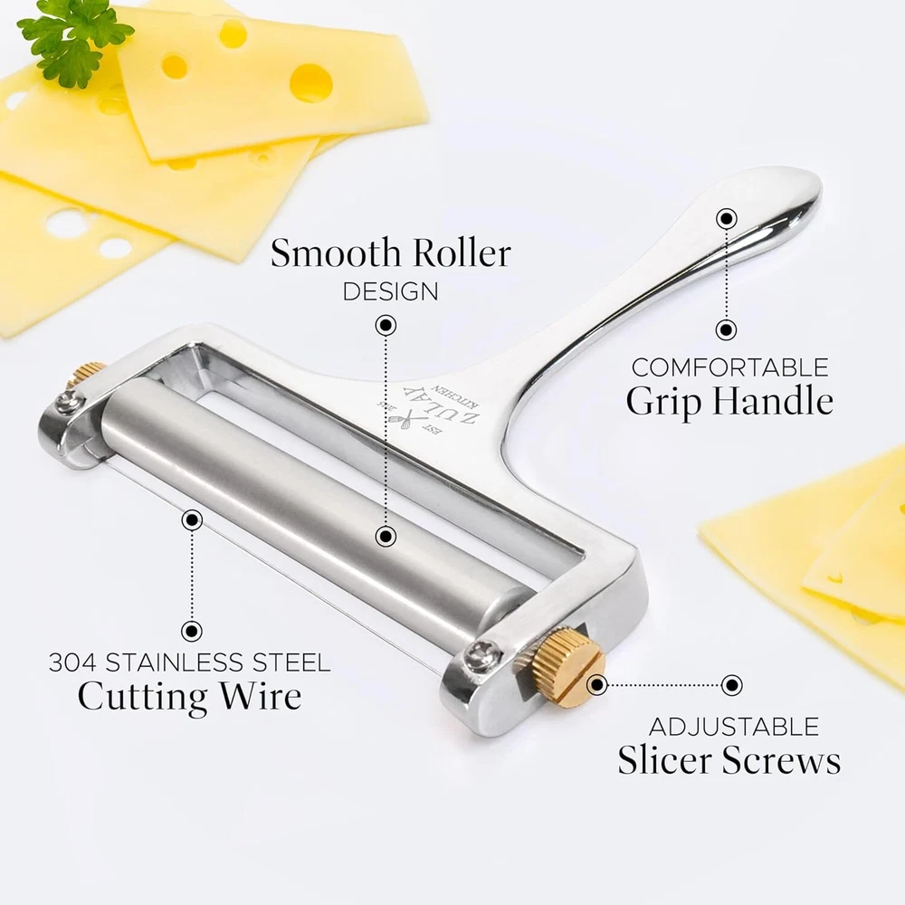 Zulay Kitchen Stainless Steel Wire Cheese Slicer - Adjustable Hand Silver Product Details Brand: Zulay Kitchen Product Dimensions: 5.12"L x 5"W x 0.63"H Material: Stainless Steel, Zinc Color: Silver Special Feature: Adjustable Wire Recommended Uses For Product: Cheese Product Care Instructions: Hand Wash Only Blade Material: Stainless Steel Item Weight: 220 Grams Blade Length: 5.2 Inches Blade Shape: Rectangular Operation Mode: Manual Manufacturer: Zulay Kitchen Item Weight: 7.8 ounces Item model number: Wire Cheese Slicer Is Discontinued By Manufacturer: No SLICE CHEESE LIKE A PRO: You no longer need to buy processed cheese slices, as this wire cheese slicer can cut cheese from paper-thin to ¼” thick slices and can also slice up cheese blocks up to 3.8” wide. Manually adjust the thickness of the wire slicer to get cheese just the way you prefer. HEAVY-DUTY BUILT: We have designed this one-piece cheese cutter with zinc-aluminum alloy and 304 stainless steel wire for extra sturdiness and durability that will last you through multiple slicing sessions. Slice cheddar, swiss, brie, pepper jack, mozzarella, or provolone like butter with this block cheese slicer. (Not suitable for extra hard cheeses like parmigiano reggiano, grana padano, and pecorino romano) MUST HAVE CHEESE LOVER’S TOOL: From slicing cheese for assembling a charcuterie board or making a gooey grilled cheese sandwich, this cheese slicer will make your recipes extra delicious. It also makes a great gift for your special ones who have immense love for evenly sliced cheese at home. ERGONOMICALLY DESIGNED: The large roller and the easy grip handle of this handheld cheese slicer makes slicing effortless. Lay the slicer flat and use your fingers to adjust the roller. It also comes with 2 replacement stainless wire slicers. After use, we recommended hand washing this slicer for cleaning.