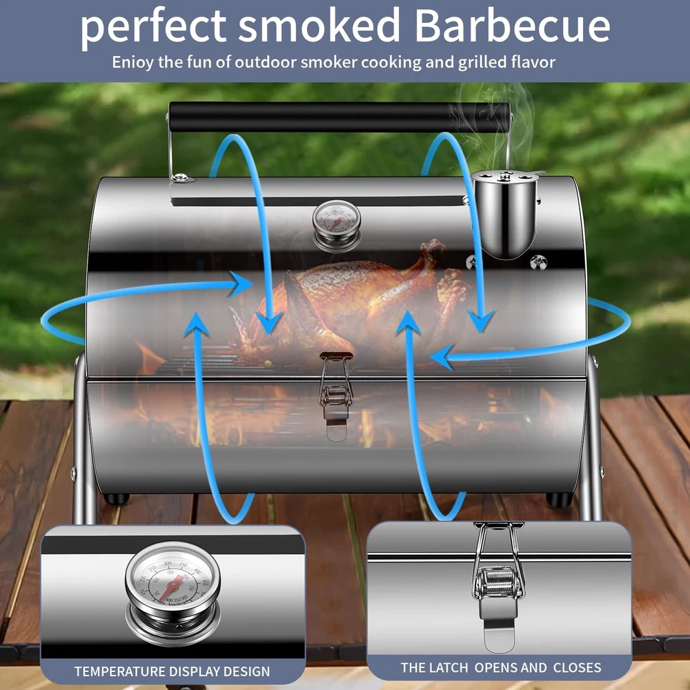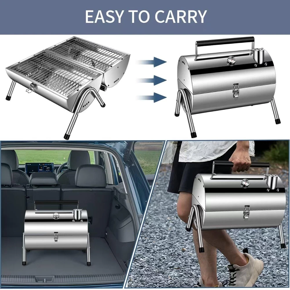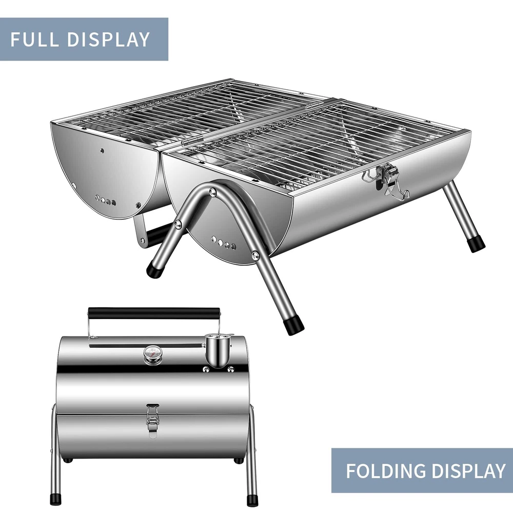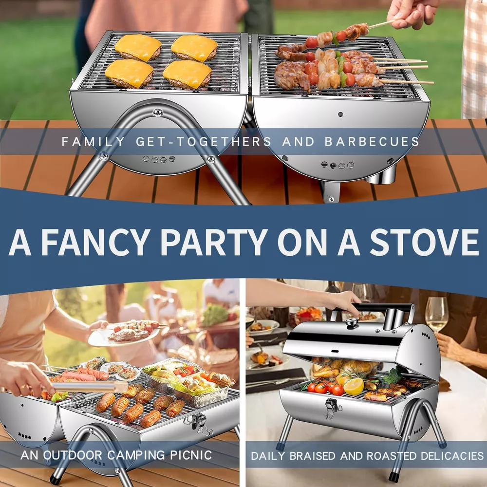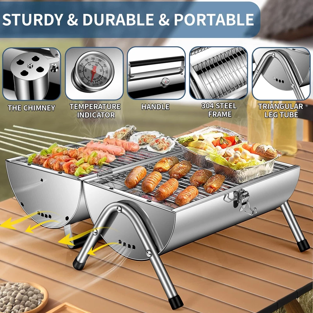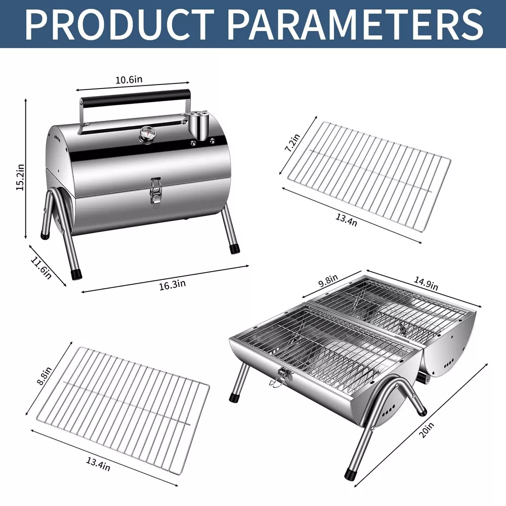 Stainless Steel Portable Foldable Charcoal Grill, the perfect companion for outdoor cooking enthusiasts. This innovative grill combines convenience, durability, and style, making it a must-have for any grill master. One of the standout features of the Stainless Steel Portable Foldable Charcoal Grill is its foldable design. This allows for easy transportation and storage, making it ideal for camping trips, picnics, tailgating, or simply enjoying a barbecue in your backyard. The compact size of the grill when folded makes it convenient to carry, fitting effortlessly into your car trunk or backpack. Setting up the grill is a breeze, thanks to its simple assembly process. Within minutes, you can have your grilling station ready to go, ensuring that you spend more time enjoying your food and less time setting up. The foldable legs provide stability and ensure that the grill stays securely in place throughout the cooking process. Cleaning up after a delicious meal is hassle-free with the Stainless Steel Portable Foldable Charcoal Grill. The grill grates are removable and dishwasher safe, making it a breeze to remove any residue or grease. This means you can spend less time scrubbing and more time relaxing with friends and family. Another noteworthy feature of this portable charcoal grill is its versatility. The double-sided design allows you to choose between a flat grilling surface and a griddle surface, providing you with the flexibility to cook a wide range of dishes. The flat side is perfect for traditional grilling, creating beautiful sear marks on your meats, while the griddle side is ideal for cooking pancakes, eggs, and delicate vegetables. 🔥 Precise cooking: The thermometer on the lid of the grill is designed to observe and regulate the temperature.A vent of the chimney could improve air circulation and well control the fire. That'll help you to precise cooking. 🔥 Safe use and easy to clean: It's made of Stainless Steel . It has the characteristics of rust-proof, scratch-resistant, heat-resistant, safe and hygienic, non-deformation, and non toxic. The grill rack is removable and easy to clean. 🔥 Your Funny Kitchen: You can easily take it by one hand and place it in the trunk of the cars. It’s suitable for beach, backyard, balcony BBQ party up to 8 people. 🔥 Rich in flavour: Adjustable smoker grill has 14x10 inch grill rack that you can cook 6 burgers, 16 hot dogs or sausages, 8 chicken breast, 4 steaks, or 2 pounds of fish. And give them smoked flavour by it’s unique design. 🔥 Quality service: Equipped with high-quality accessories, which can help you quickly complete the assembly of the charcoal grill. Be sure to try using the smoker feature, adds extra flavour to the food.