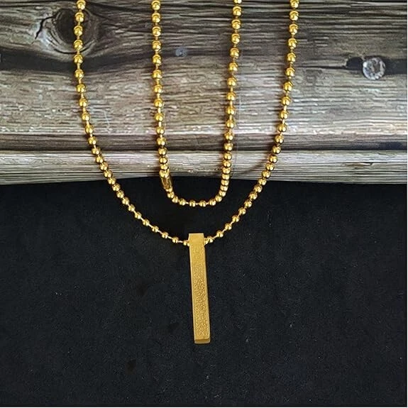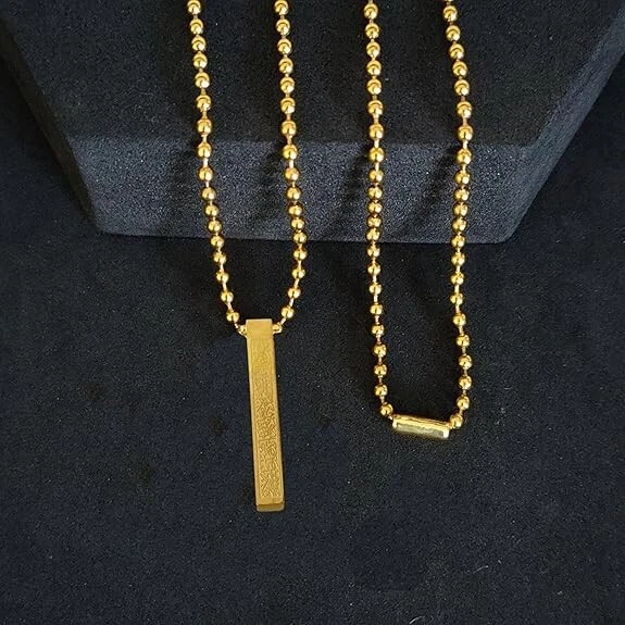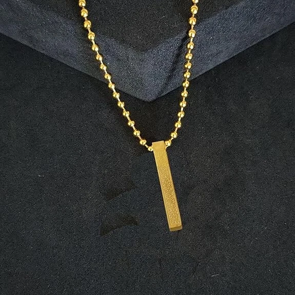 Sacred Ayatul Kursi Verse: Elevate your spiritual connection with this exquisite necklace featuring the powerful Ayatul Kursi verse from the Qur'an. Premium Craftsmanship: Meticulously crafted from durable stainless steel and adorned with an plating for a lustrous finish. Meaningful Accessory: Let this intricate piece serve as a constant reminder of divine protection and guidance. Timeless Elegance: The Ayatul Kursi Tag Necklace exudes resilience and elegance, making it a cherished addition to your jewellery collection.