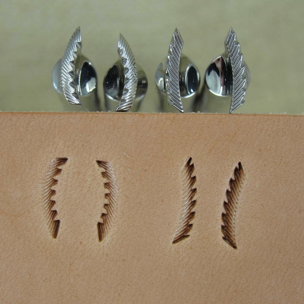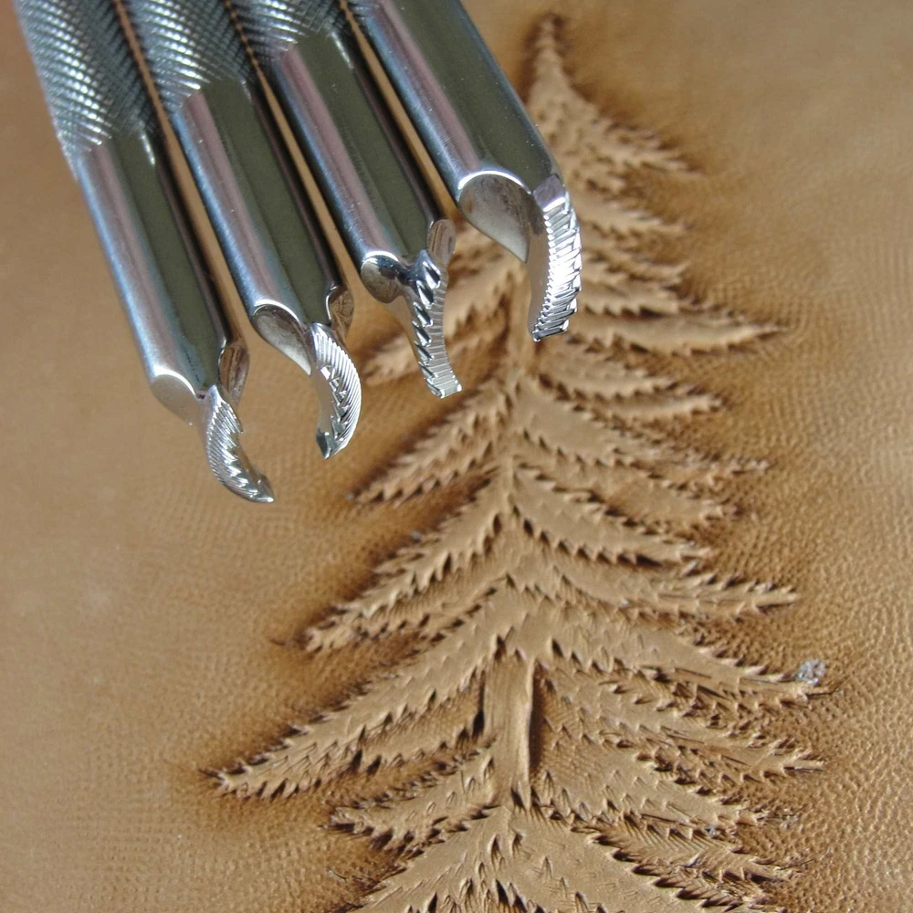 This is a 4-Piece Pine Tree Pictorial Stamp Set. It is a great stamp set that produces great impressions. These tools were designed to match the original F913L, F913R, F914L and F914R stamps. The impressions measure about 3/8" in length and 1/8" in width. If you want to make your work have a look of quality, this would be a great stamp set to add to your collection. Barry King Tools have gained a reputation for making quality tools for the serious leather craftsman. Barry is a master leather stamper, so he knows how a tool should be made and you can see that in each of his tools. Using only stainless steel in the making of these tools, you will see the precision grinding in every impression you make. If you have been wanting to take your leather carving to the next level, investing in stamps made by Barry King is a great first step.