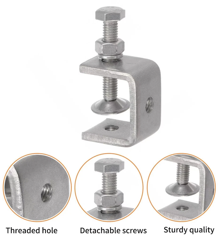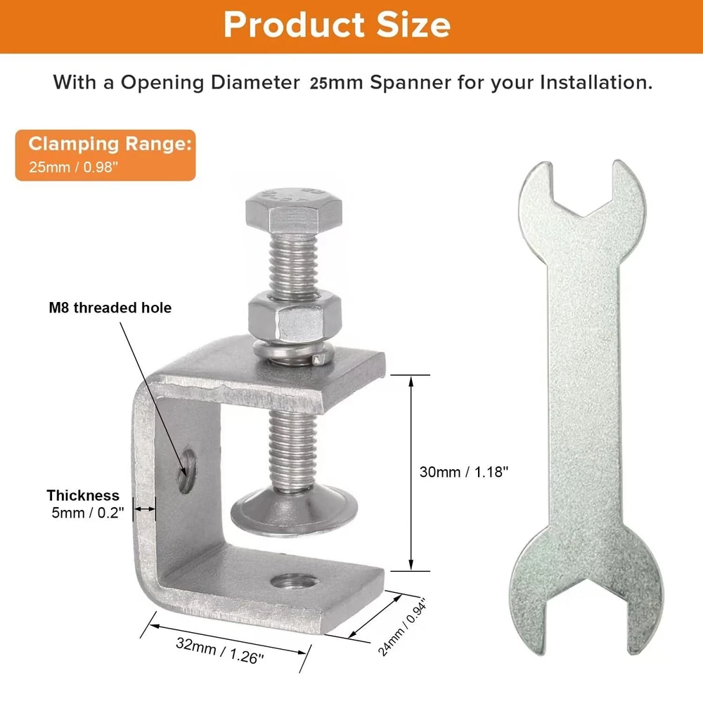 1. Made of 304 stainless steel, anti-rust and durable to use. 2. The I-beam design provides strength and stability. 3. Easy to use and can be adjusted as needed. 4. Used to hold together two workpieces by turning the screw, for assembly, fastening, gluing and welding. 5. Designed for woodworking, metalworking, assembly, construction and household clamping projects. Specification: Jaw Opening: 30mm / 1.18 inch Clamping Range: 0mm - 25mm / 0 inch - 0.98 inch Clamp Thickness: 5mm / 0.2 inch Thread Size: M8*1mm / 0.04 inch Clamp Size: 32mm x 24mm x 30mm / 1.26 inch x 0.94 inch x 1.18 inch (L*W*H) Package Content: 4 Pcs x C-Clamp 1 pc x Wrench Clamping Range - 0 ~ 25mm (0" ~ 0.98"). Durable to Use - Made of stainless steel, corrosion-resistant, rust-resistant, U clamps is 0.2 inches thick, strong and not easy to break. Easy installation - With adjustable positioning screws, the screws can be adjusted as needed, which is simple and convenient to use.(A matching wrench is provide for your convenience) Design - I-beam frame provides strength; Special clamping pads that apply pressure evenly and prevent damage when turning the screw. Widely Used - For general clamping needs, for assembly, fastening, bonding and welding in metalworking, designed for woodworker, welder, and construction worker.