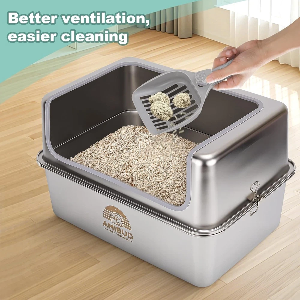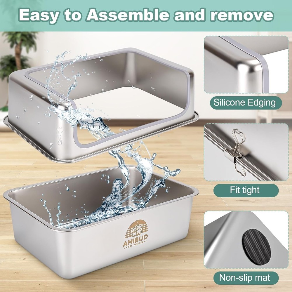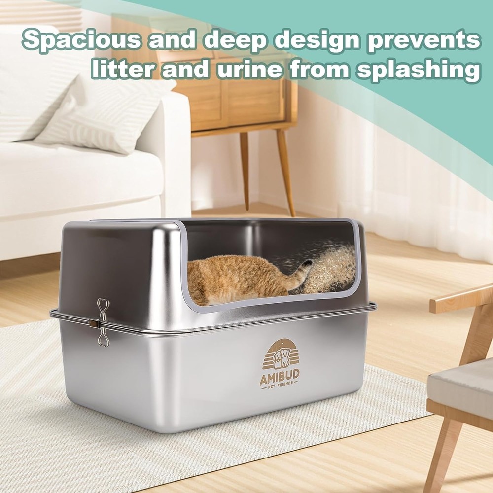 About this item Durable Stainless Steel Construction: Crafted from high-quality stainless steel, the Amibud Cat Litter Box is not only rust-proof but also designed to withstand daily use. Its robust material ensures longevity and resistance to dents, making it perfect for any playful kitty. Easy to Clean & Low Maintenance: Say goodbye to stubborn stains and odors! The smooth, non-stick surface allows for effortless cleaning – simply rinse with water or wipe with a cloth. Keep your cat's litter box fresh and hygienic with minimal effort Spacious Design for Maximum Comfort: Measuring 18x14x12 inches, this extra-large litter pan provides ample space for your cat to turn and dig comfortably. The high walls effectively prevent litter scatter, keeping your home clean and tidy