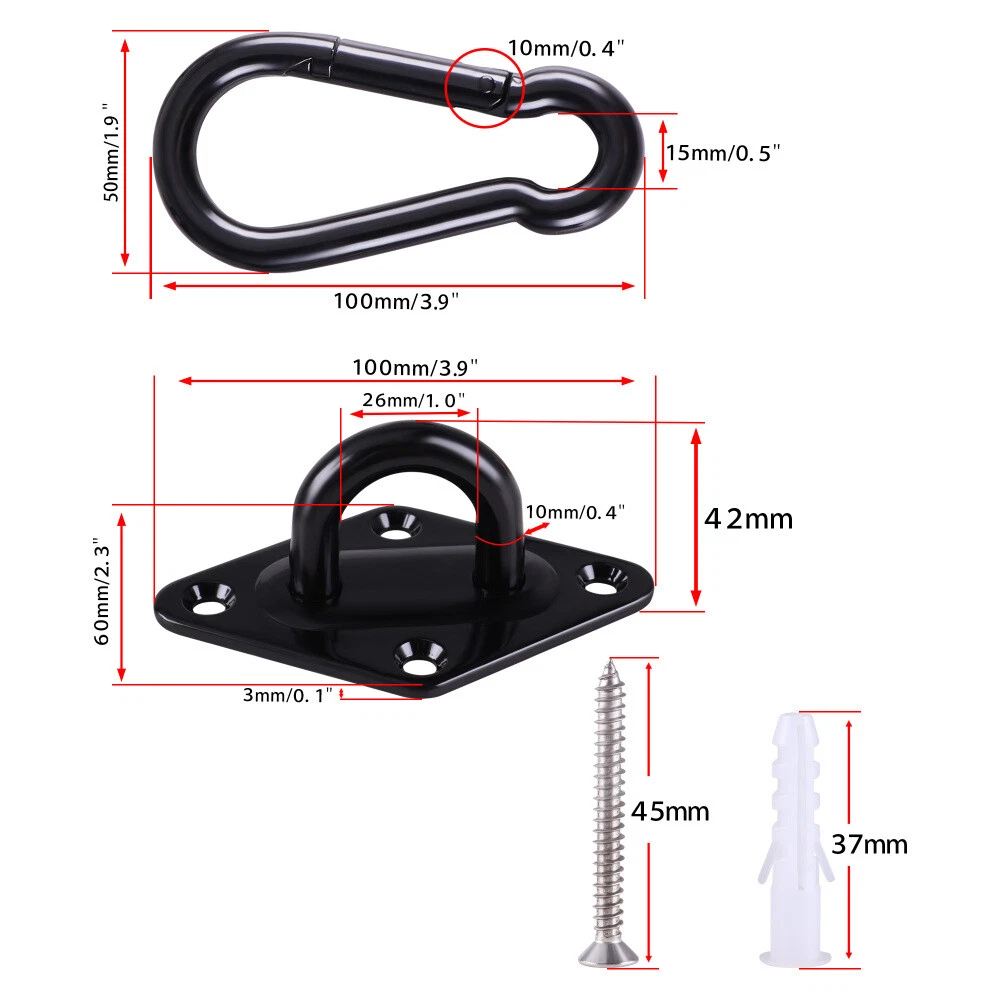 Stainless Steel Ceiling Hooks, Pad Eye Plate U Hooks Heavy Duty Wall Mount Ring Description Feature : [ 1700 Lbs Load-Carrying Capacity ] Our hammock hanging kit has a thickness of 10mm that boasts an impressive loading capacity, with the ability to bear weight up to 1700 Lbs ( 850 Lbs per hook). Furthermore, its durable construction ensures it can deliver dependable performance for many years. [ Premium Materials ] Our 304 stainless steel pad eye hooks are extremely strong, with increased hardness and bearing capacity, making them perfect for heavy-duty use. Protected by electrophoresis black, they are rust and corrosion-resistant, ensuring durability and reliability. [ Various Application ] Our wall anchors are perfect for hanging hammock chairs, porch swings, and punching bags both indoors and outdoors. The high-quality pad eye hooks and carabiners can be used on garage, room, porch, or veranda mounting hooks, and even small yachts and boats, roof beams, and ceiling plant hooks. Package include : 2PCS M10 Stainless Steel Pad Eye Hooks 2PCS 10MM Snap Hook 8PCS Screws 8Pcs Expansion Tube Payment Shipping Returns Contact Us ★We accept Paypal payment only. ★We will leave a positive feedback immediately after payment is received. We appreciate a positive feedback as much as you do. If for some reason there is any issue with the purchase, please contact us prior to leaving feedback, we will be glad to work together and provide a satisfying solution. Package handling only takes 1 business day at our US STOCK, so please make sure entering correct payment and shipping information before checking out.different Font Size, Font Color, Style and even graphics and icons are also accepted. ] 1.A full refund will be given if items are returned in thier original condition. 2 Merchandise which is damaged or missing component is not refundable 3.Buyer are responsible for return shipping with proper packaging 4.Before returning items, please make sure you get to our return address, Please inform us the tracking number after you return the items 5. Once receiving items, we will refund you inmmediately [ Contact Us: This is the contents of your Contact Us. You can add a banner for this Contact Us as header and add text descriptions here. The text descriptions can be different Font Size, Font Color, Style and even graphics and icons are also accepted. ]