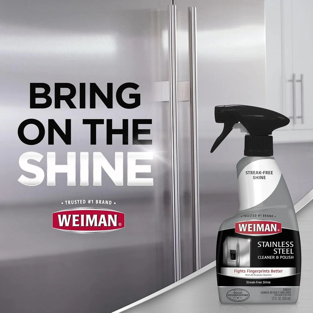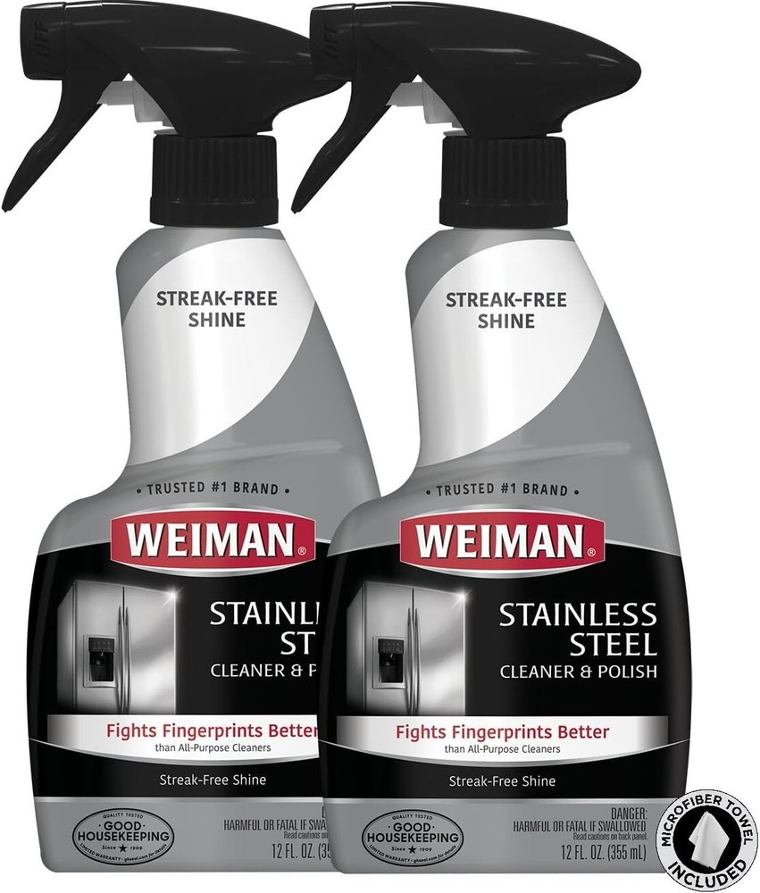 Stainless Steel Cleaner and Polish - Removes Fingerprints, Residue, Water Marks, Grease from Appliances, 2 Pack with Micro Towel #1 SELLING STAINLESS STEEL product: a trusted cleaning product for most of your home's delicate, difficult to care for surfaces. Clean, protect and enjoy your home with the best & most trusted stainless steel cleaning products CLEAN & POLISH: A pH neutral formula quickly cleans, shines & protects any stainless-steel surface. Our product works great for all types and colors of stainless steel NO MORE FINGERPRINTS: Effectively eliminates surface fingerprints, haze, smudges, grease, streaks & residue build up BRILLIANT STREAK-FREE SHINE: Polish leaves a protective barrier that repels dirt and dust. Our wipes are easy to use – simply wipe in the direction of the metal grain, and buff with a soft, dry cloth FOR USE ON: Stainless steel refrigerator, wine fridges, microwave, oven, stove, grill, sink, range-hood & trash cans VALUE BUNDLE: 2 (12 oz) Stainless Steel Cleaners, 1 Reusable Micro Fiber Buffing Towel