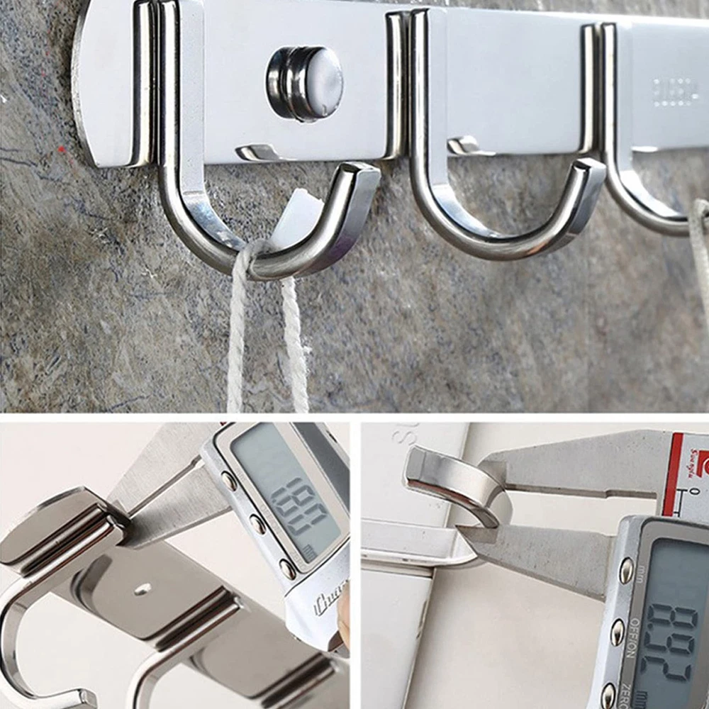 Dimension: 3 hooks: 21*4.8cm; 4 hooks: 29*4.8cm; 5 hooks: 37*4.8cm; 6 hooks: 45*4.8cm. Punching installation will screws accessories for the tile, marble, glass, metal, solid wood type walls. Size: 3 hooks: 21*4.8cm; 4 hooks: 29*4.8cm; 5 hooks: 37*4.8cm; 6 hooks: 45*4.8cm. The distance between two hooks is 8cm, the length of the bottom plate is 3cm, the thickness of the round hook is 7mm, the thickness of the flat hook is 7mm, and the thickness of the hook bottom plate is 1.8mm. Easy to load 11 kg/24 lbs. Exquisite polishing makes the rack bright as a mirror, and it is easy to clean. The back of the hook is welded to make it secure and not easy to fall. Thickened material solid hooks for strong bearing capacity. Screws installation: 1. Mark the installation position; 2. Use a 6mm drill bit to drill holes at the marked positions; 3. Drive in the expansion pipe; 4. Align the hole position and screw in the screws; 5. Cover the cap; 6. Completed. Package includes complete accessories and a modern stainless steel wall coat rack. And it comes with 2 screw caps, which cover the screws holes to a neat appearance. Applicable wall types: Tile, marble, glass, metal, solid wood. Applicable to: Indoor space as living room, bathroom, bedroom, kitchen. Can be used to hang: bags, keys, coats, towels, clothes, hats, scarves, belts, wallets, spoons, shovels, rags, etc.