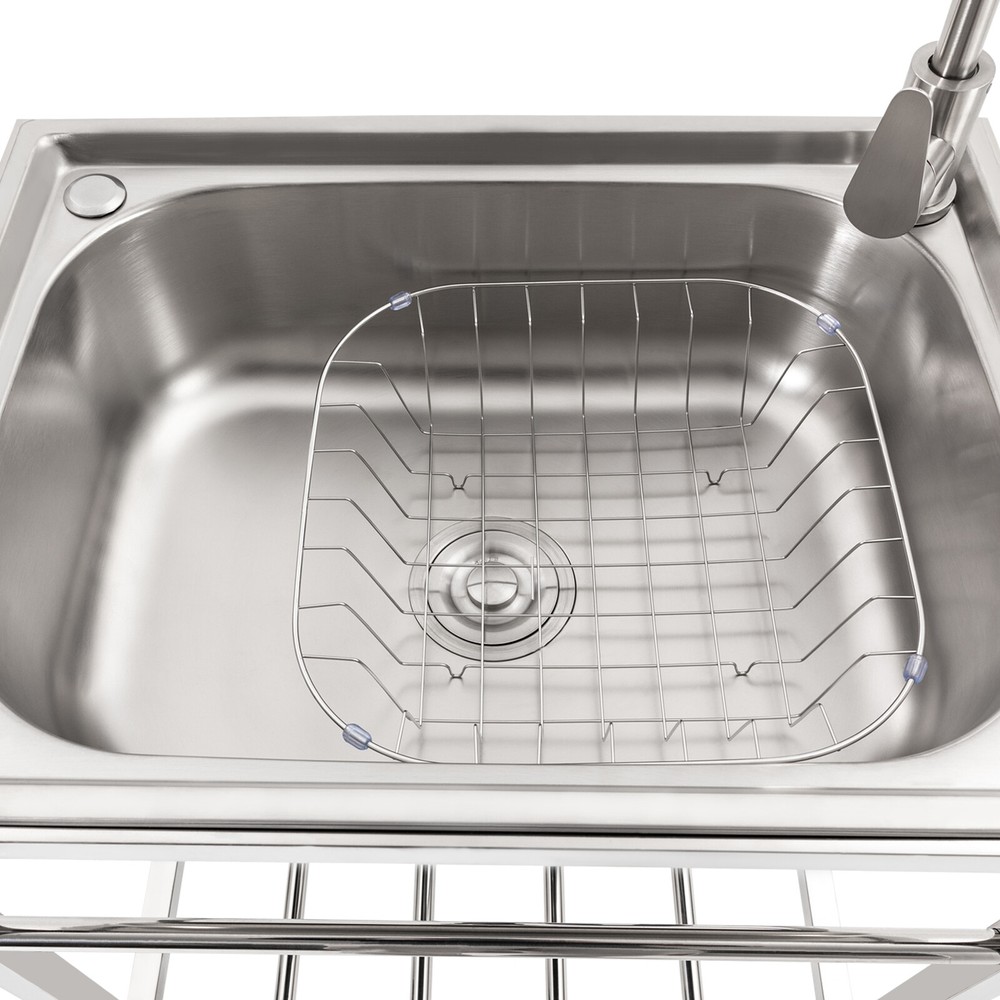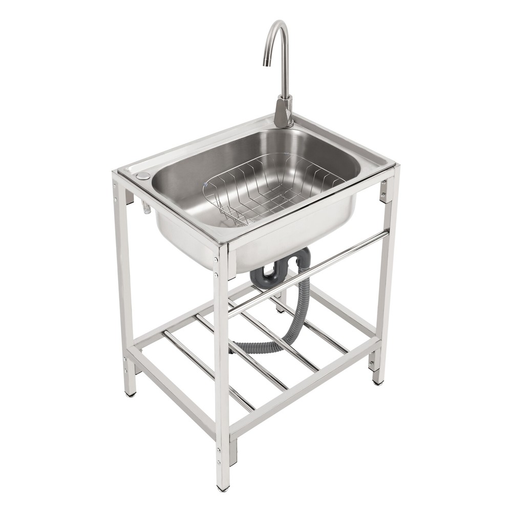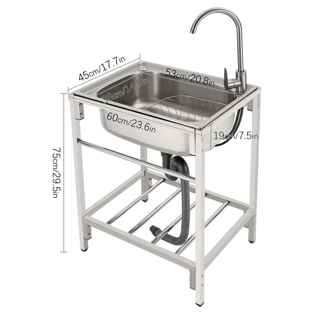 Commercial Single Bowl Stainless Steel Hand Wash Sink Basin Freestanding &Faucet Description This freestanding single basin sink is the ideal cleaning aid for washing fruits and vegetables, clothes, dishes, and cookware. It has a 7.5in deep sink for a large number of cleaning tasks at once. Its raised countertop design prevents spills from wetting your clothes. The silencing pad at the bottom of the sink can reduce the sound of water arialing the metal sink, providing you with a good cleaning environment! Application This freestanding single basin sink is suitable for cleaning food, fruits, and vegetables, and any kitchen, bar, restaurant, dessert shop, clean room, cafeteria, garage, or any other business place. This will be a very useful piece of equipment when you barbecue in the backyard or garden. Specification Color: Silver Style: Single Bowl Basin Sink Installation Method: Freestanding Material: 202 Stainless Steel Surface Treatment: Brushing Process Processing: Integrated Molding Sink Countertop Weight Capacity: 100kg/ 220.46lbs Shelf Weight Capacity: 20kg/ 44.09lbs Sink Size: 53*38*19cm/ 20.8*14.9*7.5in Product Size: 60*45*75cm/ 23.6*17.7*29.5in Package Size: 77*48*28cm/ 30.31*18.9*11.02in Net Weight: 9.5kg/ 20.94lbs Gross Weight: 11kg/ 24.25lbs Package Included 1* Sink 1* Cold & Hot Tap 1* Sewer Pipe 1* Filter Carrycot 1* Thickened Lower Outlet 1* Drain Bracket 1 Set* Bracket 1 Pair* Gloves 2* Water Pipes 2* Angle Valves Other Needed Accessories Key Features Large Capacity Sink : The size of the sink is 20.8*14.9*7.5in to allow you to complete a large number of cleaning tasks and accommodate many pots and pans at one time, making it very suitable for commercial use. Layered Filtration : Its filter carrycot is capable of layered filtration of sewage to prevent the problem of clogged downspouts caused by larger objects falling into the sink, making it easy for you to use. Farewell to Drip : We provide you with a drain basket. When you have cleaned the dishes, you can put them into the drain basket. When the water drips out, you can collect them again, and you will have a cleaner kitchen! Low Noise : The bottom of the sink is equipped with a silencing pad, which can effectively reduce the noise when the water hits the metal sink, providing you with a quieter cleaning atmosphere. Convenient to Use : It adds extra storage space at the bottom for you to put things like detergent, dishwashing basins, and vegetable baskets that you will use frequently for your daily use. And its faucet can rotate 360 ° to facilitate your cleaning. High Load-bearing Capacity : Its bracket is fixed with screws, which is more stable, making its sink countertop hold up to 220.46lbs, and bottom shelf hold 44.09lbs of items. Such a strong load-bearing capacity allows you to use it with confidence. Customer-friendly : There is a pair of gloves in the package to provide you with the safest and most convenient service. High-quality Material : It is made of high-quality 202 stainless steel, free of lead, durable, non-toxic, and harmless so that you can rest assured of long-term use. Easy to Clean : The sink has a brushed finish and is designed with R-conners, which makes the sink smooth, not easy to get oil and scale, and easy to clean. Easy Installation : This freestanding single basin sink has a simple structure and complete accessories, so you can easily install it in a short time. Customer Service : We aim to provide quality products and services. If you have any problems, please feel free to contact us. We will reply and solve the problem for you as soon as possible. Details Raised Sink Countertop : Its countertop is raised to effectively prevent water from splashing out and wetting your clothes when washing dishes. Firm Sewer : Its sewer is embedded with steel wire, which is not only hard to break, but also prevents insects and rats from biting, thus prolonging its service life. All Steel Drainage : Its drainage system is made of all steel, making it durable and not easy to rust or smell, so you can use it with confidence. Brushing Process : Its surface is treated with a brushing process, which not only makes it more metallic but also enhances its ability to prevent corrosion, mold, and rust. Integrated Molding : This freestanding single-basin sink adopts an integrated molding process, which makes it durable without cracks. Notes Please allow the slight color difference caused by the shooting light and 1-3 cm error due to manual measurement, and make sure you do not mind before ordering.
