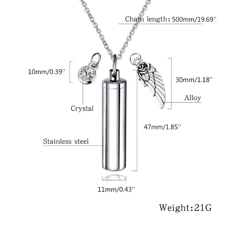 Stainless Steel Cremation Jewelry Cylinder Pet Memorial Urn Necklace Wing and high Features: high stainless steel, highly-polished surface, hypoallergenic, sturdy and durable. Never rust, corrode, fade or stain. Last forever just like the memory it represents. Use as Pendant Necklace or Keychain.High polished Surface, Smooth and Comfortable to Wear. A lovely necklace to remember a special and keep them close to your heart at all times. This could be used for Cremation Jewelry,Urn Jewelry, Cremation Urn, Necklaces for Ashes, Urns for Ashes. Specification: Stainless Steel Color: Metal 1 2#; 3#; 4# Size: Cylinder: 4.7x1.1cm(1.85inx0.4in); wing: 3cm(1.18in); adjustable chain length: 50cm(19.69in) Quantity: 1 Set Note:1.Please allow 1-3cm error due to manual measurement. pls make sure you do not mind before you bid. 2.Due to the difference between different monitors, the picture may not reflect the actual color of the item. Thank you! Package includes(without retail package): 1 Set x Pet Cremation Jewelry