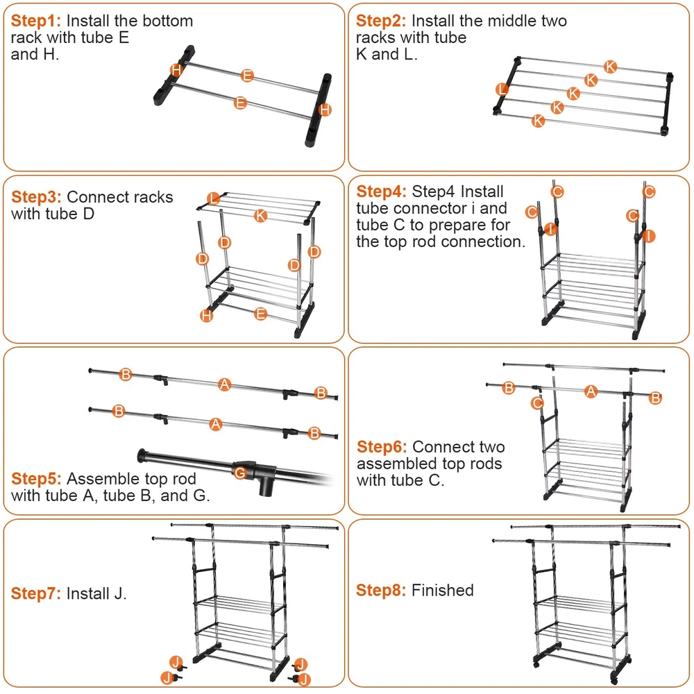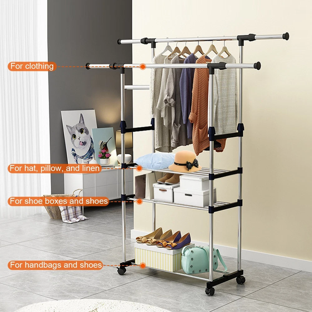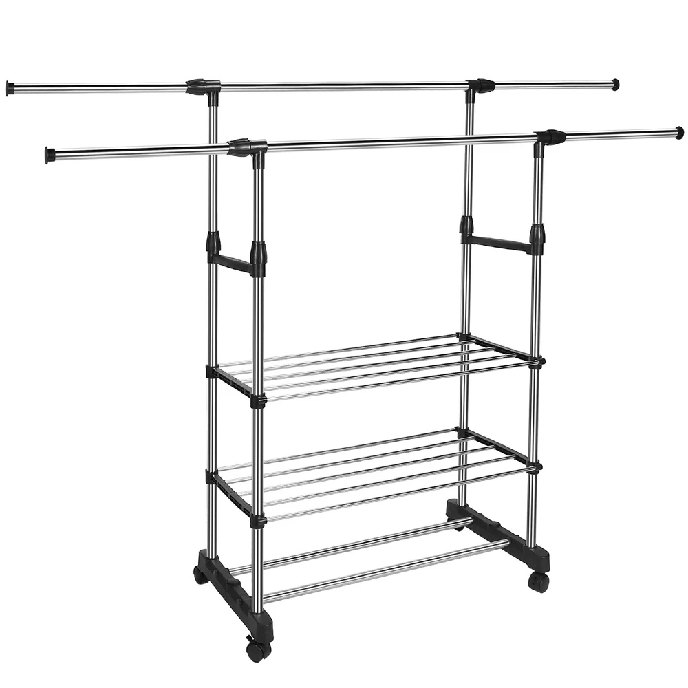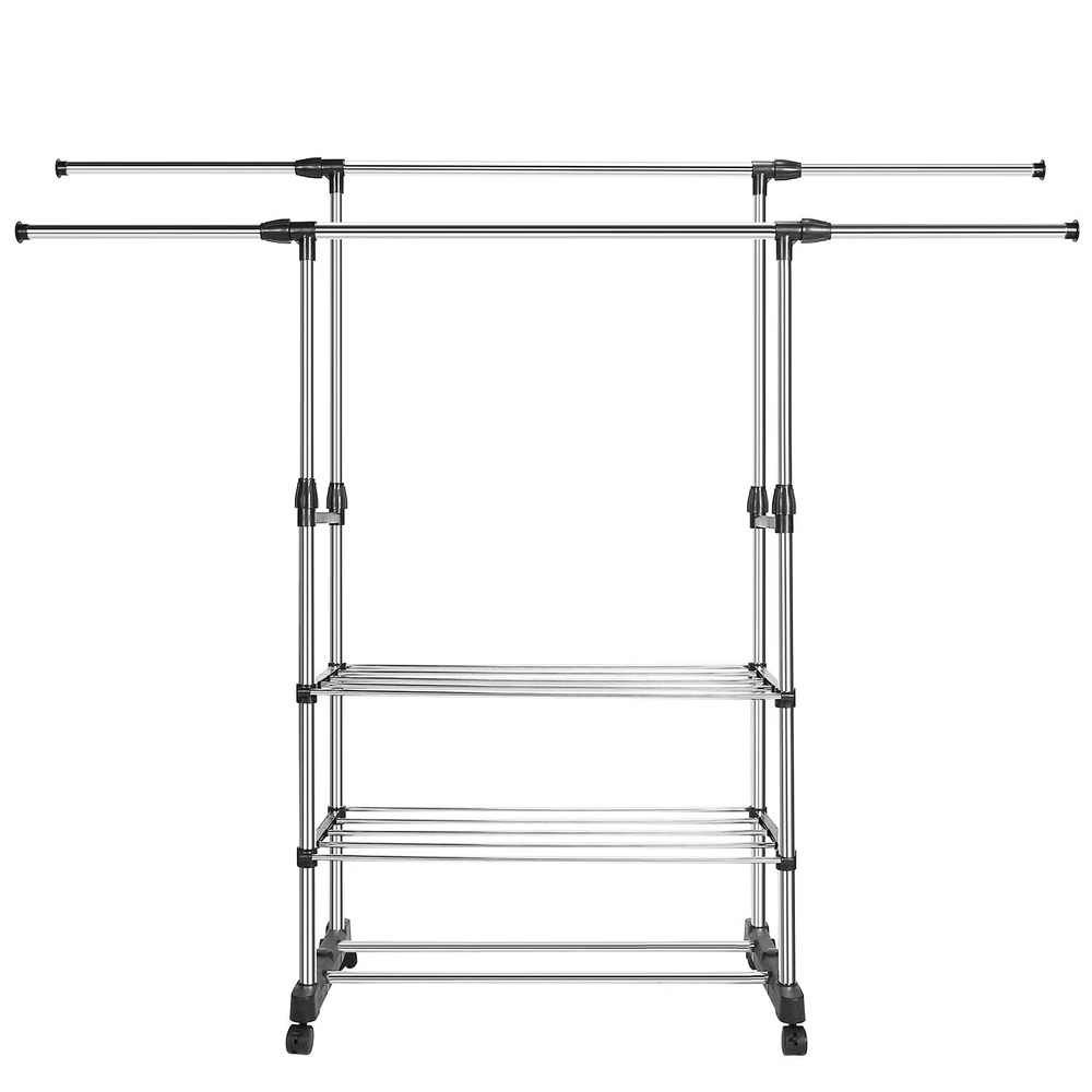 eBay Double Garment Hanging Rack Stainless Steel Clothing Hanging Display Organizer Featured Item Product Detail Image Gallery Product Description Overview: Are you bothered and need a simple clothing organizer rack to tidy up your clothes quickly? Perfect for expanding your wardrobe or using as a spare open closet that adds extra hanging storage space. It is great for laundry room, bedroom, even for display in a store or market. The extendable rods enable you to adjust the length and height according to space and the quantity of clothing. Come with smooth 360°wheels with brake switch at the bottom, it can be easily moved and locked to meet your needs. The grid shelf can hold your shoes and shoe boxes. Features: Perfect Closet Organizing System: This garment rack is great for creating storage space to organize your clothes and shoes in your laundry room and bedroom,and even for display in a store or market. Two clothes rails can accommodate double the amount of clothing,and the two-layer rack hold shoes and shoe boxes. Make your room tidy and organized with this rack. Adjustable Rods:Adjustable height range: 29.5-59.1in;adjustable width range:29.5-57.1in. A wide range for you to adjust the height and width freely according to space and clothing type. Anti-slip Design: On the top of each long hanging rail stand includes two stoppers to prevent hangers from falling. It can also serve as a hanger for your bag. Stainless Steel Material: Made of thickened stainless steel,corrosion-resistant and rustproof. It can also act as an indoor clothesline pole in rainy days. Mobile Rack: The four PP wheels at the bottom allow flexible movement without damaging the floor. Allows you to move the clothes rack from laundry room to your bedroom. The brake switch at wheels can prevent the rack from sliding,stable and safe. Specifications: Brand: NewHome Product Type: Garment Hanging Rack Color: Silver Material: Stainless Steel Overall Weight Capacity: 35kg/77lbs Shoe Rack Weight Capacity: 2kg/4.4lbs Garment Rack Size(Extended): 145x150x41cm/57.1x59.1x16.1in Garment Rack Weight Capacity: 3kg/6.6lbs Garment Rack Weight: 2.4kg/5.3lbs Package Size: 78x16x8cm/30.7x6.3x3.1in Package Weight: 2.6kg/5.7lbs Package Contents: 1 x Garment Rack(disassembled) 1 x Instruction Terms & Conditions Thank you for your business !