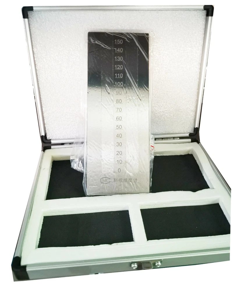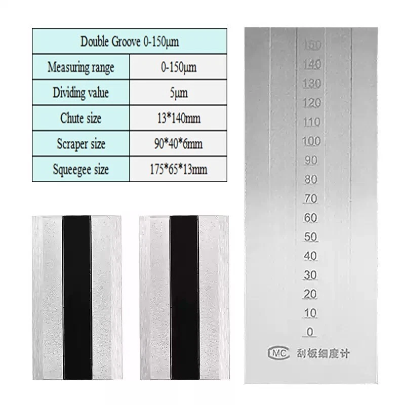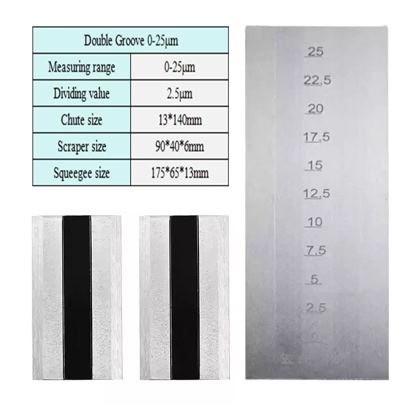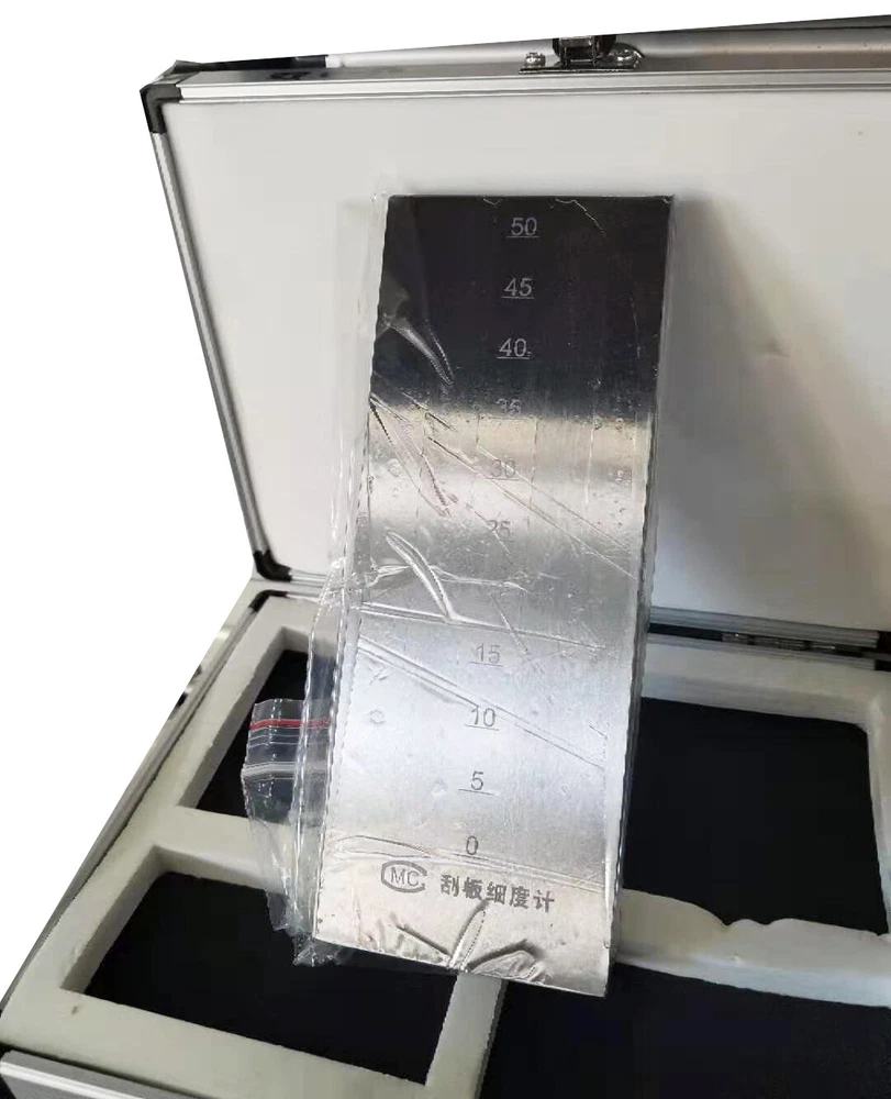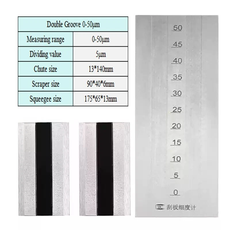 Double Groove Grindometer Fineness Meter Grind Gauge Stainless Steel Scraper Description scraper fineness meter: Technical Parameters: The implementation of standards; GB/T1724-89 Range: 0-25, 0-50, 0-100, 0-150 Minimum division value: (2.5, 5, 10, 10)mm Structure size: QXD scraper 155 * 50 * 12mm Material: stainless steel Product Introduction: Fineness board for the production, storage and application of dispersed products in the process of fineness testing, such as applied to: paint, plastic, paint, printing ink, paper, ceramics, medicine, food, etc.. purpose Fineness dispersion meter using the national steel (molybdenum vanadium) specified this product with stainless steel, used for the determination of pigment and impurity particles coating, paint paste, ink and other liquid and slurry size and dispersion degree, so as to control the quality of the products should be dispersed in the production, storage and use, such as paint, plastic, paint, printing ink, paper, ceramics, medicine, food and other fields. Operation Method: The test details refer to the current version of the British standard BS3900C6, the international standard ISO1524, the ASTM-D 1210 standard and some other domestic standards. The term "grinding fineness" is defined as the reading on the fineness plate under certain test conditions, which indicates the depth of the abrasive particles dispersed in the case of the solid particles. The abrasive particles used must be clean and dry, placed on the flat surface. The test activities as a test material is poured into the bottom of the groove, the hands holding the blade by the right angle, speed and smooth vertical pressure to the fineness of plate blade with enough downward pressure to clean the surface of grinding the particles at the same time, the groove is filled with particles. Through the observation of the fineness of plate, at the right angle and scraping angle, the determination of fineness of grind down immediately. Note that when the raw material grooves along the first time showed a significant surface punctate moment, down in the groove width of 3mm, the number of particles in the scale between 5 and 10. The high degree of numerical moment as grinding fineness, regardless of when the spots began to appear on the surface, scattered spots in any zone the clean immediately after the fineness of plate. Repair and Maintenance: The scraper surface and scraper crossing shall not bump. After the use of washed and coated with anti rust oil. A year, regularly check the scraper blade straightness, does not meet the standards should be timely repair. The instrument is applicable to room temperature 22 + 1℃, the relative humidity of 70% conditions to ensure accuracy.