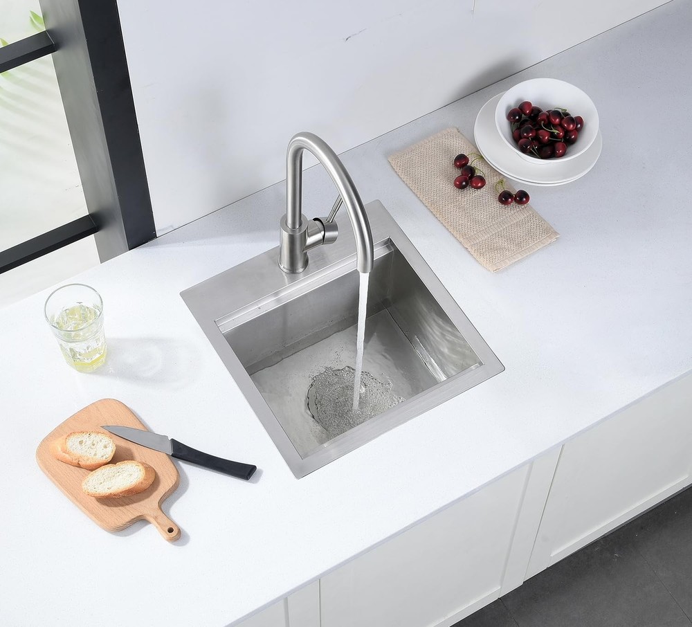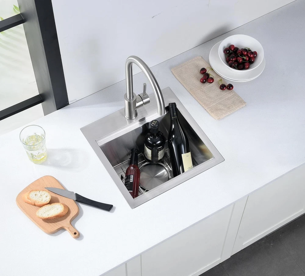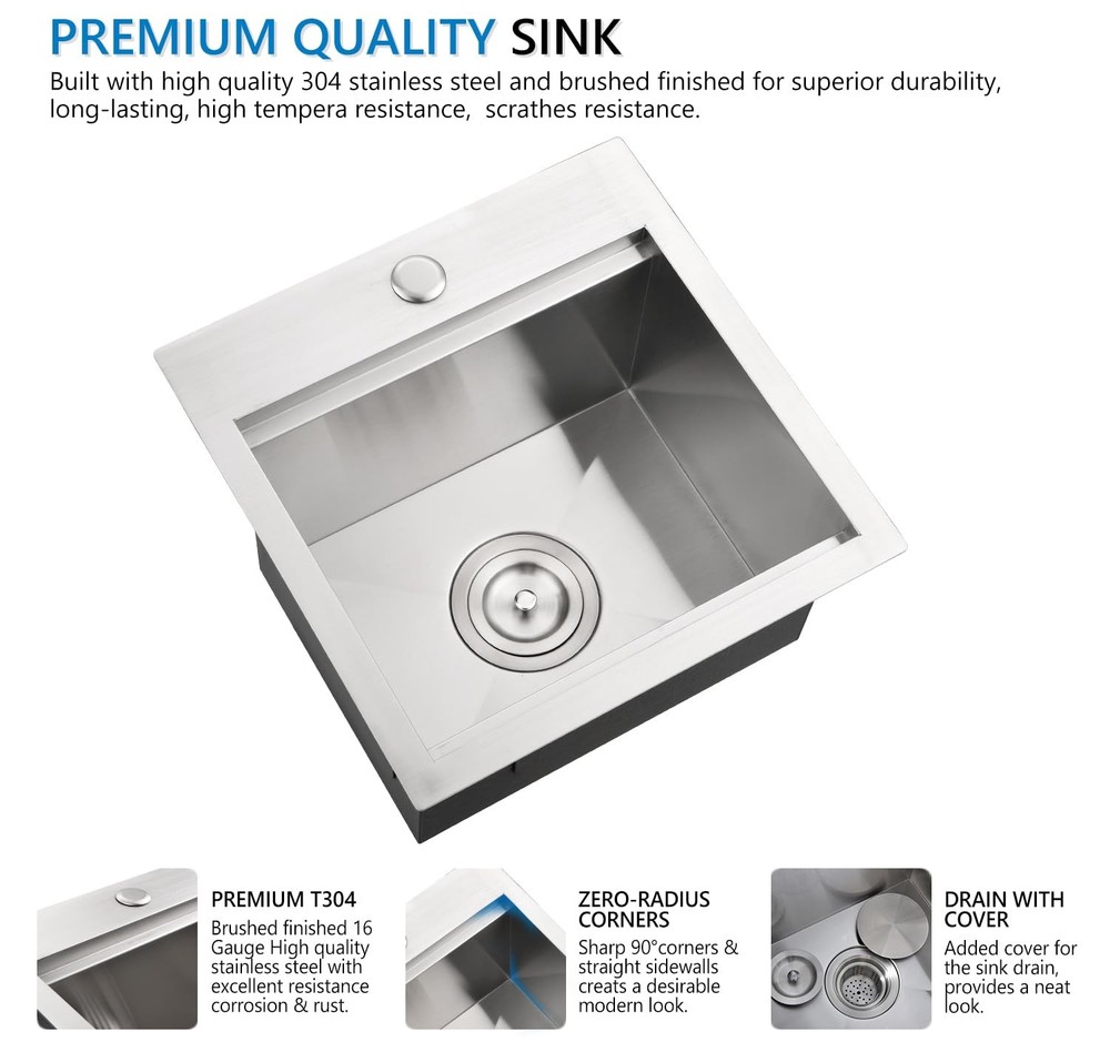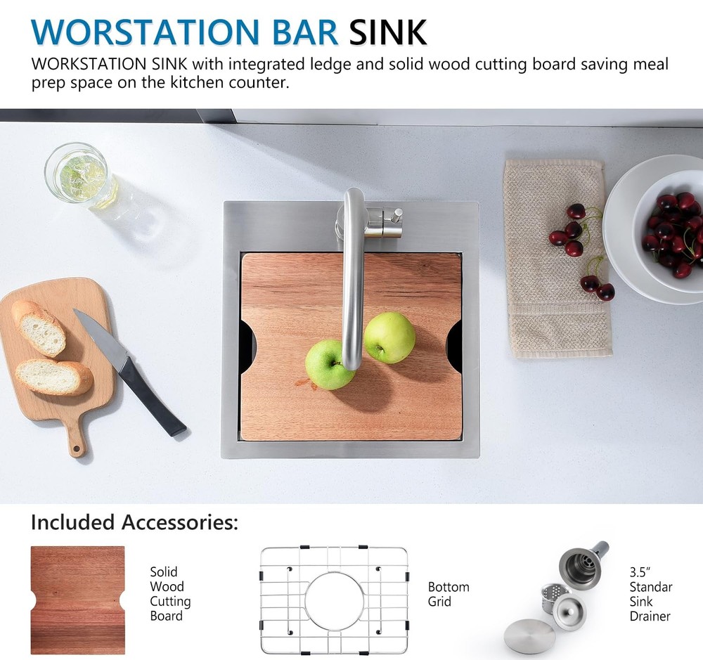 FEATURES T-304 16 gauge stainless steel with brushed finish, durable and corrosion resistance. 3mm thickened edge plate, thicker than other 2mm sinks, more sturdy and durable. Built with an integral ledge that accommodates the added workstation wood cutting board. Kitchen bar sink accessories included - Food Preparation Board, Sink Grid, Drain Strainer Assembly with Cover Anti-condensation coating prevents water accumulation in the bottom of sink X water guideline drainage ensures rapid and fluent drainage, keep your cabinet dry, low maintenance needed. Specifications: Material: Stainless Steel 16 Gauge Installation Type: Drop in Exterior Dimension: 15" x 15" x 9" Interior Dimension: 13" x 11" x 9" Minimum Cabinet Size: 18" Drain Opening: 3.5" Package Including: 1 X 15 Inch Kitchen Bar Sink 1 X Stainless Steel Sink Grid 1 X Solid Cutting Board 1 X Basket Drain Assembly with Cover Stainless Steel Construction with Brushed Finish: The stainless steel sinks can integrate beautifully into any kitchen. Made from premium quality 304 series, 16-gauge stainless steel, the drop in bar sinks has 1.2mm thickness for the gauge of the metal, resistant to heat, and calcium deposits and will keep their brilliance for decades Small Kitchen Bar Sink: Single bowl, drop in installation. Exterior dimensions: 15“ x 15" x 9", Interior Dimensions: 13" x 11” x 9", Minimum Cabinet Size: 18". The bar & prep sink is capable of holding more than enough water, great for preparing drinks, washing glasses, and cleaning small items Workstation Sink with Extra Accessories: The workstation kitchen sink built with an integral ledge that accommodates the added workstation wood cutting board. Kitchen sink accessories included - Food Preparation Board, Sink Grid, Drain Strainer Assembly with Cover, you'll be receiving if you choose to buy this bar sink X Draining Grooves and Thickened Sound-deadening Pad: The bar sink designed with bottom slope and X wire water guide liner, ensuring a complete drainage and preventing water from pooling in the sink. Sound-deadening pads minimizes sound and vibration for a quieter time at the sink Covered by Factory Warranty: products are manufactured to the high standards, we offer a 1 Year Limited Warranty. If you have any issue with the kitchen bar sink, like missing accessories, defective product, don’t hesitate to contact us, we will offer you a solution within 24 hours