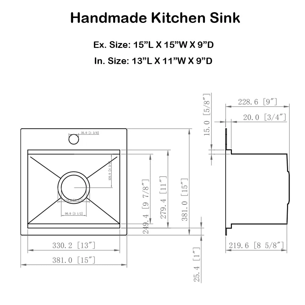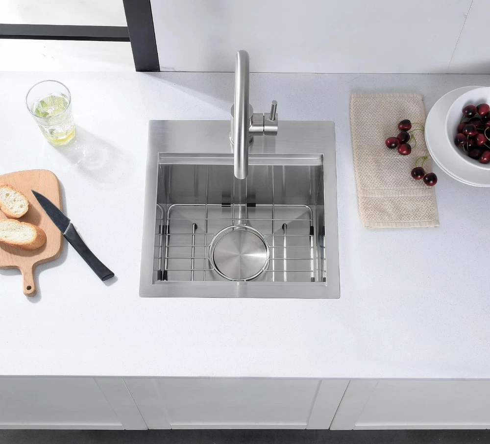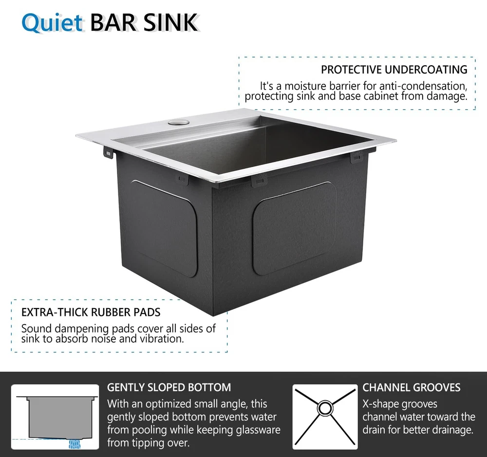 FEATURES T-304 16 gauge stainless steel with brushed finish, durable and corrosion resistance. 3mm thickened edge plate, thicker than other 2mm sinks, more sturdy and durable. Built with an integral ledge that accommodates the added workstation wood cutting board. Kitchen bar sink accessories included - Food Preparation Board, Sink Grid, Drain Strainer Assembly with Cover Anti-condensation coating prevents water accumulation in the bottom of sink X water guideline drainage ensures rapid and fluent drainage, keep your cabinet dry, low maintenance needed. Specifications: Material: Stainless Steel 16 Gauge Installation Type: Drop in Exterior Dimension: 15" x 15" x 9" Interior Dimension: 13" x 11" x 9" Minimum Cabinet Size: 18" Drain Opening: 3.5" Package Including: 1 X 15 Inch Kitchen Bar Sink 1 X Stainless Steel Sink Grid 1 X Solid Cutting Board 1 X Basket Drain Assembly with Cover Stainless Steel Construction with Brushed Finish: The stainless steel sinks can integrate beautifully into any kitchen. Made from premium quality 304 series, 16-gauge stainless steel, the drop in bar sinks has 1.2mm thickness for the gauge of the metal, resistant to heat, and calcium deposits and will keep their brilliance for decades Small Kitchen Bar Sink: Single bowl, drop in installation. Exterior dimensions: 15“ x 15" x 9", Interior Dimensions: 13" x 11” x 9", Minimum Cabinet Size: 18". The bar & prep sink is capable of holding more than enough water, great for preparing drinks, washing glasses, and cleaning small items Workstation Sink with Extra Accessories: The workstation kitchen sink built with an integral ledge that accommodates the added workstation wood cutting board. Kitchen sink accessories included - Food Preparation Board, Sink Grid, Drain Strainer Assembly with Cover, you'll be receiving if you choose to buy this bar sink X Draining Grooves and Thickened Sound-deadening Pad: The bar sink designed with bottom slope and X wire water guide liner, ensuring a complete drainage and preventing water from pooling in the sink. Sound-deadening pads minimizes sound and vibration for a quieter time at the sink Covered by Factory Warranty: products are manufactured to the high standards, we offer a 1 Year Limited Warranty. If you have any issue with the kitchen bar sink, like missing accessories, defective product, don’t hesitate to contact us, we will offer you a solution within 24 hours