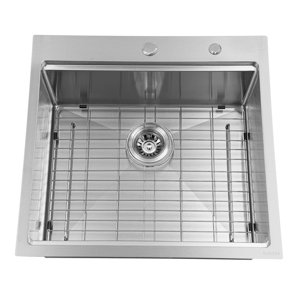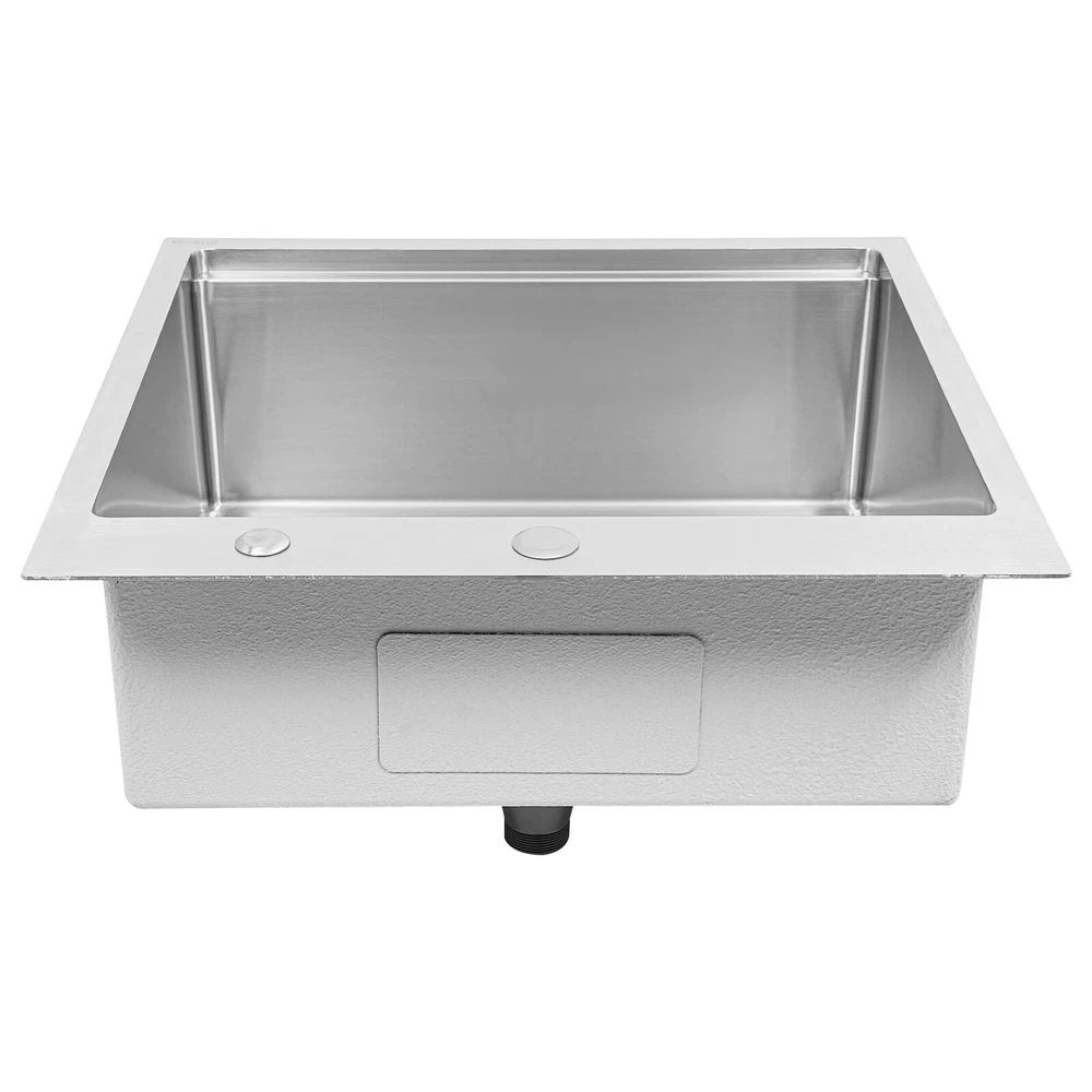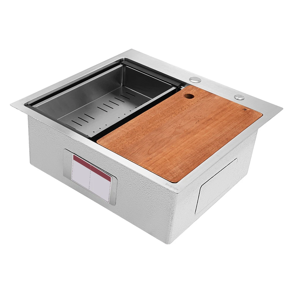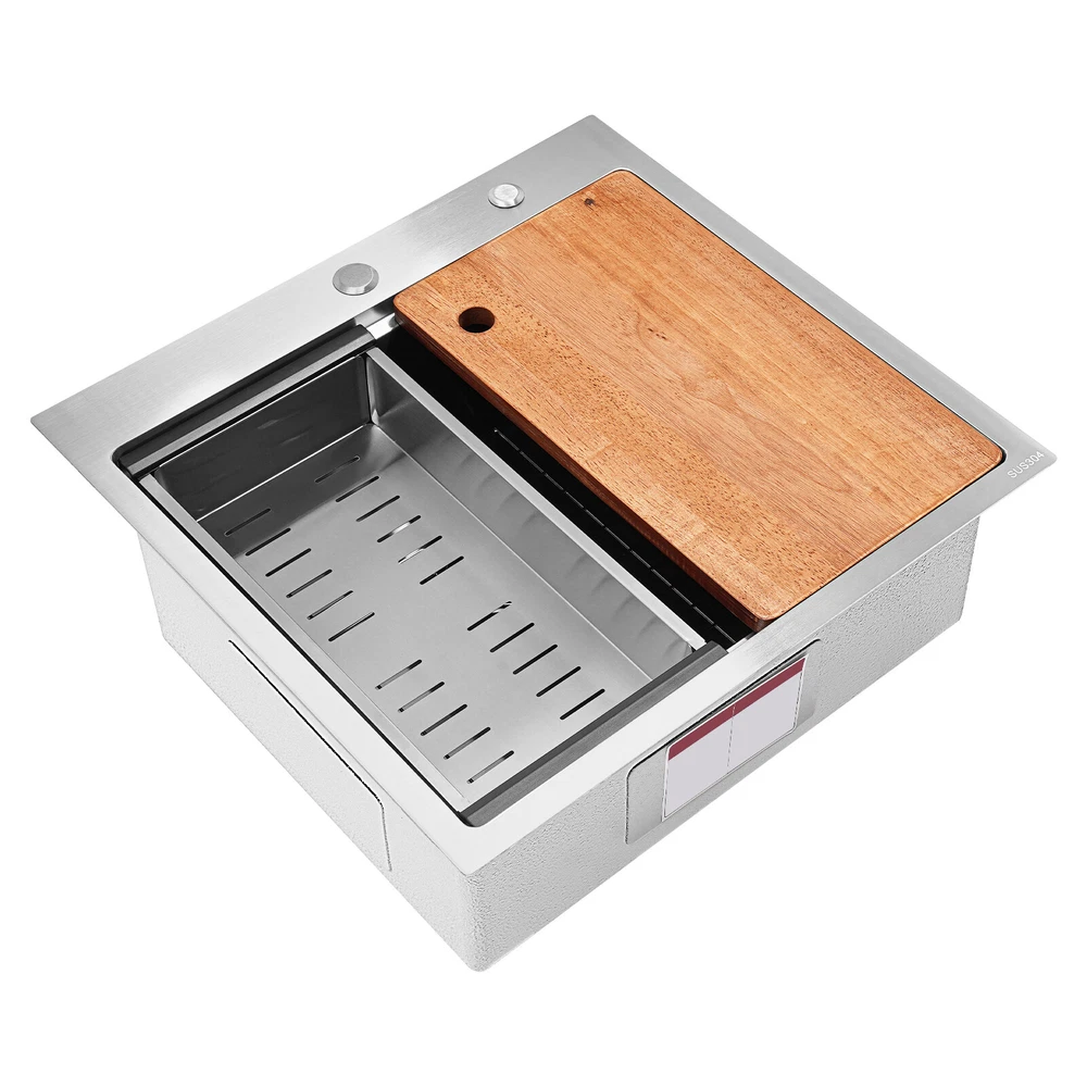 Kitchen Sink Drop-in Bar Sink Stainless Steel Topmount Kitchen Sink 23 x 22 Inch Description Made of high-quality 304 stainless steel, this kitchen sink is exquisitely crafted, wear- resistant , and corrosion- resistant . Its enlarged and deepened sink not only alleviates the splashing problem but also increases space utilization for cleaning numerous cookwares. The design with a cutting board, bottom rinse grid, roll-up dish drying rack and drainage frame allows you to wash and cut fruits and vegetables simultaneously, with which you can enjoy a more convenient life. Key Features Strong and Durable: Made of premium 304 stainless steel through the brushed process, it is corrosion and heat- resistant and will remain as good as new for a long time, even in the face of frequent daily use and all kinds of kitchen utensils collision. Space Optimization: The workstation sink is designed to hold the cutting board and drainage frame on a single track, maximizing the available space on the countertop. Large Capacity: Its large size ( 23*22in ) allows you to clean large amounts of plates, dishes, and pots, and wash fruits, and vegetables at one time without splashing, saving time. Life Assistant: This sink with a cutting board, bottom rinse grid, roll-up dish drying rack and drainage frame cleverly combines washing and meal preparation functions, allowing you to enjoy a convenient life. Invisible and Beautiful: It supports three mount types: top mount, flush mount, and under mount, which will not affect the aesthetics when the sink is flush with the countertop, and the smooth lines and low-key silver-colored appearance can also add a touch of simplicity and elegance to the kitchen. Hassle-free Cleaning: The brushed surface is not easy to leave marks, you can remove surface dust and grease by wiping with a damp cloth and detergent (not included). User Friendly: The rubber mute mat can effectively reduce the noise generated by the faucet water release and the collision of dishes, creating a quiet kitchen environment. The anti-condensation coating effectively prevents excessive temperature differences and protects the cabinet from moisture. Rapid Drainage: The X-shaped water guidelines and enlarged 3.5-inch drain hole help drain water quickly. The equipped drainage frame also ensures that the kitchen is dry and hygienic. Customer Service: We aim to provide quality products and services. If you have any problems, please feel free to contact us. We will reply to you and solve the problem for you as soon as possible. Details Rounded Corners: They are not easy to leave hygiene blind spots, making it convenient for you to clean the sink. Bottom Rinse Grid: With protective covers, it can prevent scratches on the kitchen utensils and sink. Utensils can be placed on the rinse grid for fast drainage. Roll-up Dish Drying Rack: It facilitates you to quickly clean your cookware and drain the bowl quickly to prevent bacteria growth. Hanging Hole: It is convenient for you to hang the cutting board freely in your kitchen after use to keep it dry and hygienic. Application It can be widely used in homes, restaurants, laundries, basements, bars, kitchens, food trucks, dessert stores, coffee shops, hotels, garages, gardens, etc. for washing dishes and cutting vegetables and fruits. Specification Material: 304 Stainless Steel Color: Silver Style: Modern Process: Brushed Shape: Rectangular Mount Type: Topmount, Undermount, Flushmount Assembly Required: Yes Thickness: 100mm/0.39in Drain Hole Diameter: 8.9cm/3.5in Cutting Board Size: 45*25cm/17.7*10in Drainage Frame Size: 45*24*6cm/17.7*9.4*2.4in Product Size: 58.4*55.8*22cm/23*22*8.7in Package Size: 63*50*28cm/24.8*19.69*11.02in Gross Weight: 11kg/24.25lbs Net Weight: 10.2kg/22.49lbs Package Included 1* Stainless Steel Kitchen Sink 1* Cutting Board 1* Bottom Rinse Grid 1* Strainer 1* Drainage Frame 1* Roll-up Dish Drying Rack All Accessories for Use Notes Please check the style and size before purchasing. Please do not scratch its surface with sharp objects to prolong its service life. If you want to get a better installation effect, we suggest you ask professional workers to install it. Please allow the slight color difference caused by the shooting light and 1-3cm error due to manual measurement and make sure you do not mind before ordering. Payment Delivery details Terms of sales About us Contact us Payment We accept ebay payment 。 Fees such as import duties, taxes are not included in the item price or shipping costs. These charges are the buyer's responsibility. Delivery details Shipping: 2-9 working days to: USA Terms of sales We maintain high standards of excellence and strive for hundred percent customer satisfaction. Feedback is very important to us. We hope that you contact us immediately before you give neutral or negative feedback, so that we can address your concerns. It is impossible to address issues if we do not know about them! About us Your satis faction is our ultimate goal. We work hard to earn your trust and future business. Our certified technicians have tested each item before shipping. The unit comes with 1 year limited warranty on all manufacturing defects. a) If you receive a defective item, you may return it or ask for a discount. Please contact us within 14 days after you receive the package. b) What you returned must be intact and in its original packaging as re? u. Customer is responsible for shipping costs of the returned item. c) We will cover the cost of shipping back t with the shipping rate indicated in the registration page. We will send you a new unit or refund the full payment you paid. Thank you. Contact us Business Hour Business Hour: Monday To Friday: 8:30 AM to 5:00 PM (Beijing China time) Due to time zones, our reply to your questions may not be immediately. But within above working time, we will reply your email within 24 hours. If it's non-workdays, please kindly be patient and wait till Monday. Please contact us with ebay mes