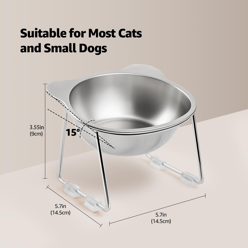 Elevate Your Cat's Dining Experience with Premium Comfort & Hygiene! Give your feline friend a healthy, stress-free eating experience with our stainless steel elevated cat bowl. Designed for both comfort and practicality, this elevated feeder promotes proper posture and joints while your cat eats, making it ideal for cats. Reduces Neck Strain: The stainless steel elevated cat bowl is designed to promote better posture, aid digestion, reduce neck strain, and enhance feeding comfort. Prevents Whisker Fatigue: The wide and shallow design prevents whisker fatigue, while the cat food bowl non-slip base ensures the bowl stays in place during feeding. Durable and Hypoallergenic: Made from food-grade SUS304 stainless steel, this raised cat food bowls prevents chin allergies is resistant to breaking. Practical and Easy to Clean: With its smooth stainless steel surface, this elevated cat bowl is both functional and easy to clean. It is dishwasher-safe and built to last. Perfect for Indoor Cats: Measuring 5.9 inches in diameter and 4.7 inches in height, this cat elevated food bowl is ideal for indoor cats. It helps keep the feeding area clean and tidy, making it a perfect choice for any home.