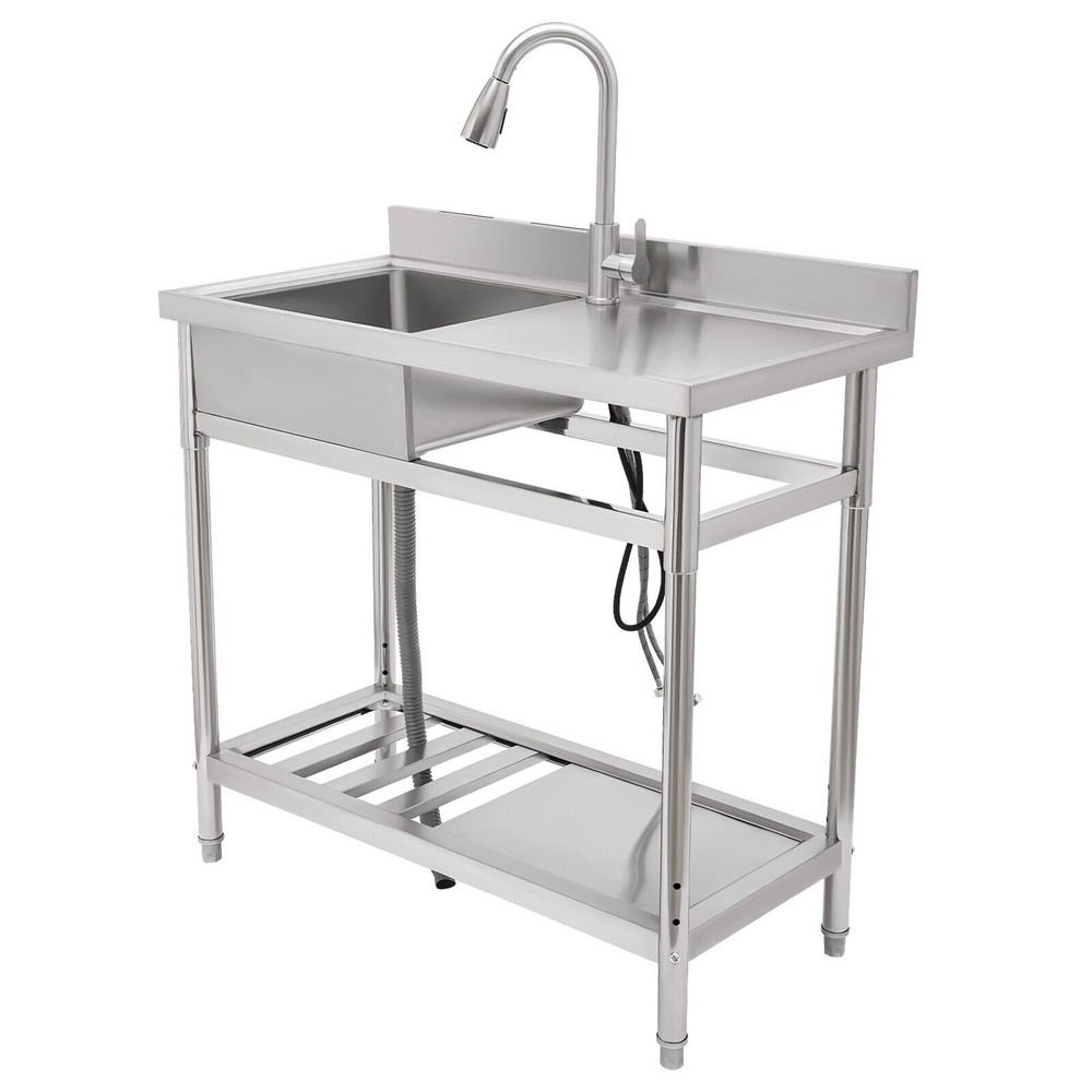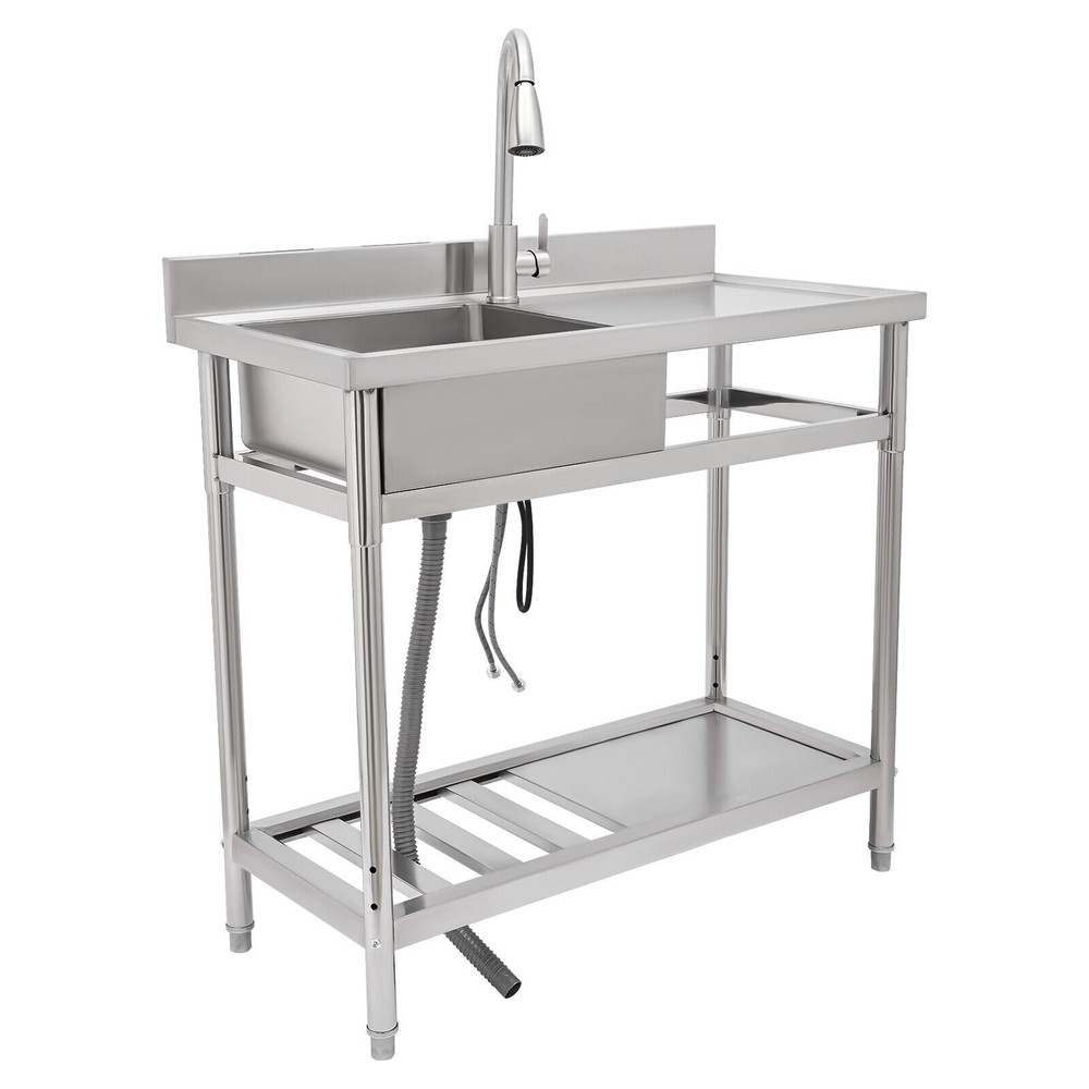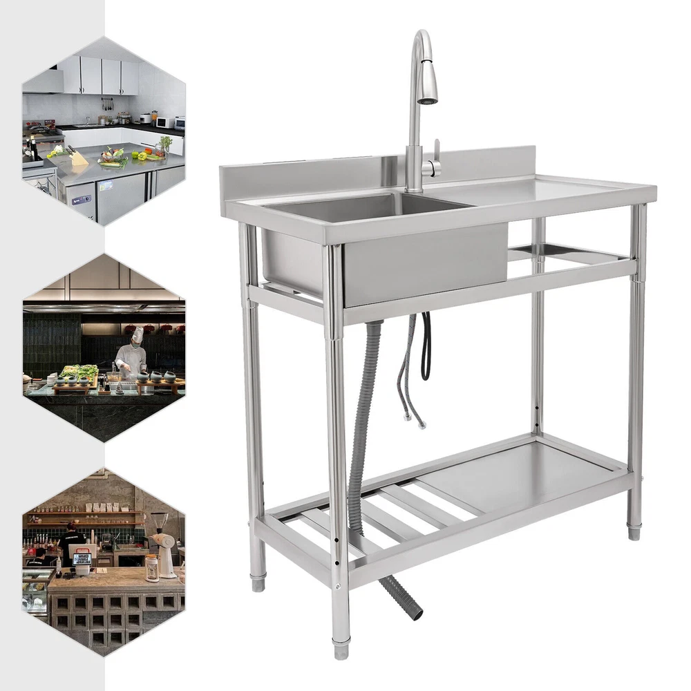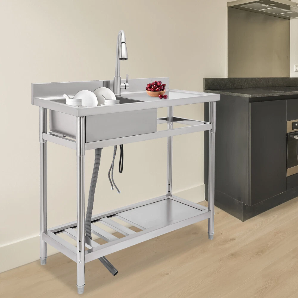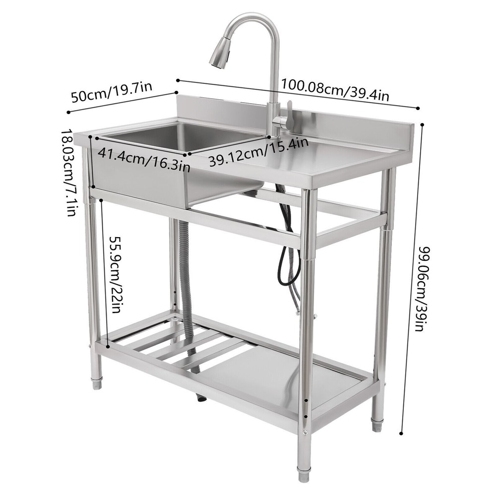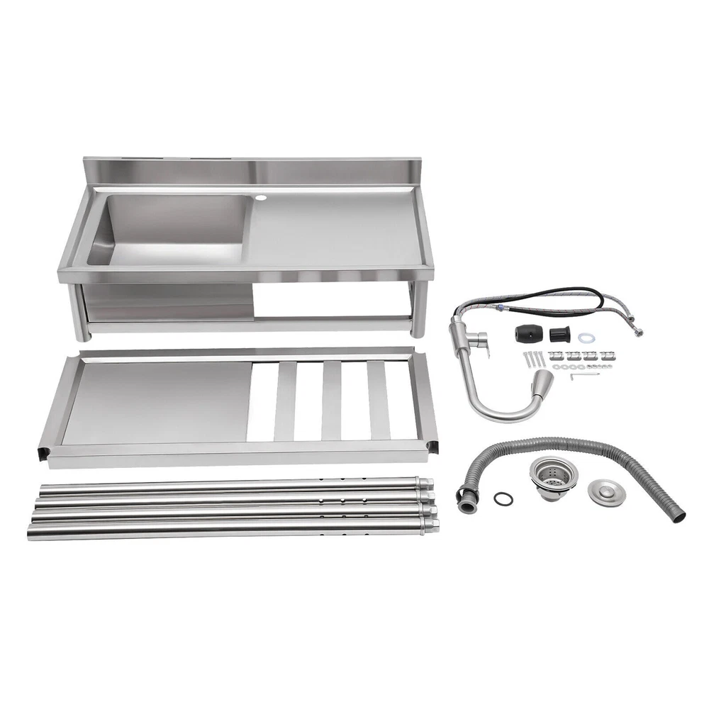 Stainless Steel Freestanding Kitchen Restaurant Sink Set with Workbench LeftBowl Description This stainless steel commercial kitchen sink with multi-functionality will be a great storage and cleaning helper for your kitchen. The stainless steel material has a smooth and shiny exterior while being strong and durable, making it both beautiful and functional. In addition, it comes with a single sink, pull-out faucet, large shelving platform, and under-mount storage platform, which not only makes cleaning easy and flexible but also gives you enough space for chopping and shelving, making it ideal for both commercial and domestic use. Key Features Build to Last: The product is made of 201 stainless steel with wire drawing and laminating processes and has a clean and shiny appearance, high strength, high hardness, good rust resistance, and long service life. Two-tier Design: It comes with a countertop to hold cooking ingredients or kitchen supplies like cutting board, and has a large lower space to store cleaning supplies and accessories, saving space in the kitchen. You can also hang towels on the crossbars for easy access. Large Single Bowl: The 16.3*15.4*7.1 inches large bowl provides you with a large place to wash and clean cooking ingredients while effectively preventing splashing water and overflow. Convenient Faucet: The faucet comes with a pull-out design that can be stretched to make the washing and cleaning work easier and more flexible in the kitchen. It also has a switch on the faucet that allows you to quickly stop the water. Equipped with dual water pipes, you can adjust the water temperature through the handle to ensure that items can be cleaned more appropriately in different scenarios. Thoughtful Design: The elevated back panel can block splashing water droplets, and prevent the wall from getting wet, moldy, and blistering off to some extent. The knife holders allow you to store your knives(not included) conveniently for easy access. Easy Maintenance: This product features streamlined rounded corners and edges, making everyday cleaning a breeze. You can wash it with mild soap, clean water, and a soft cloth for a long-lasting gloss. Protective Package: To prevent the product from being damaged during transportation, we packed it with foam and bubble bags to protect your products to the maximum extent possible. Customer Service: We aim to provide quality products and services. If you have any problems, please feel free to contact us. We will reply and solve the problem for you as soon as possible. Details Sturdy Feet: They elevate the bottom surface to keep the lower tier and the items above it away from the ground, water, and contamination while ensuring stable support for the sink. Filtration Basket: It can block large solids and residues to prevent them from going down the drain and causing clogs. Gravity Ball: It allows the faucet to retract automatically under gravity without consuming any power, which is very convenient. Application It is suitable for the kitchen, milk tea shop, dessert shop, pet shop, restaurant, hotel, cafe, bar, laundry, and other domestic or commercial places. Specifications Color: Silver Style: Modern Shape: Rectangular Material: 201 Stainless Steel Process: Wire Drawing, Laminating Mount Type: Free Standing Assembly Required: Yes Sink Placement: Left Faucet Pull-out Length: 33cm/13inch Outlet Pipe Length: 70cm/27.56inch Inlet Pipe Length: 60cm/23.62inch Outlet Pipe Interface Diameter: 3cm/1.18inch Inlet Pipe Interface Diameter: 2cm/0.79inch Thickness: 0.6mm/0.024inch Lower-tier Height: 56cm/22inch Bowl Size: 41.4*39*18cm/16.3*15.4*7.1inch Product Size: 100*50*99cm/39.4*19.7*39inch Packaging Size: 106*56*32cm/41.73*22*12.6inch Gross Weight: 19.5kg/42.99lbs Package Included 1*Commercial Kitchen Sink 1*Pull-out Faucet Other Needed Accessories Notes Please check the size carefully before ordering. Please do not clean it with hard tools like steel wire balls for a longer service life. If you want to get a better installation result, we recommend that you hire a professional plumber to install it. Please allow the slight color difference caused by the shooting light and 1-3cm error due to manual measurement, and make sure you do not mind before you order. Brand GDRASUYA10 Feature 1 Compact Design,Unique Appearance,high reliability * Feature * Nice and Practical, High Quality Packaging Features: Fast shipping from US Warehouse Installation Type Freestanding Process Wire Drawing, Laminating Assembly Required Yes Sink Placement Left Faucet Pull-out Length 33cm/13inch Outlet Pipe Length 70cm/27.56inch Inlet Pipe Length 60cm/23.62inch Outlet Pipe Interface Diameter 3cm/1.18inch Inlet Pipe Interface Diameter 2cm/0.79inch Thickness 0.6mm/0.024inch Lower-tier Height 56cm/22inch Bowl Size 41.4*39*18cm/16.3*15.4*7.1inch Product Size 100*50*99cm/39.4*19.7*39inch Type Kitchen Sink Item Height 99cm Item Length 100cm Item Width 50cm Material 201 Stainless Steel Color Silver Shape Rectangular On Nov 19, 2025 at 01:43:14 PST, seller added the following information: On Dec 10, 2025 at 23:25:00 PST, seller added the following information: