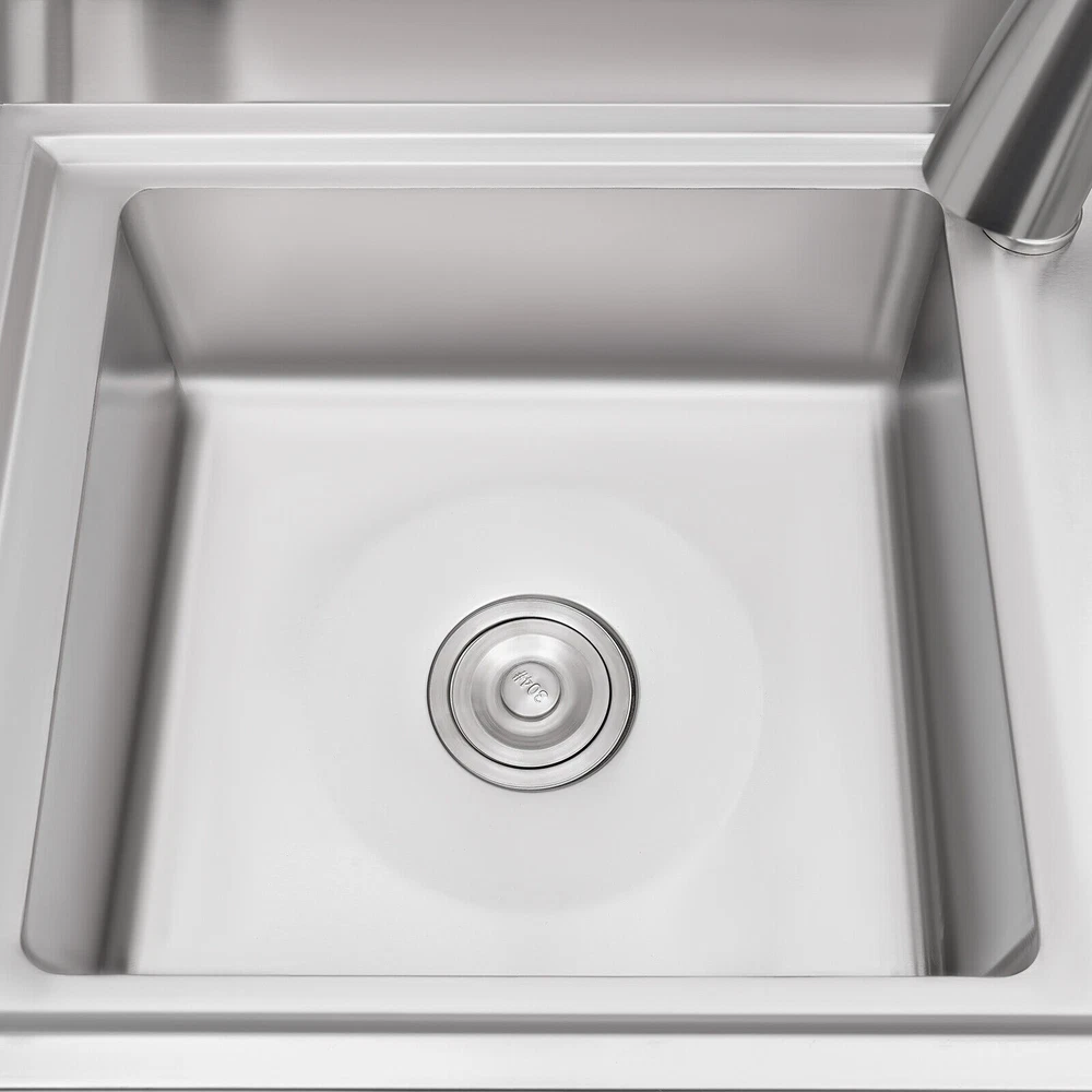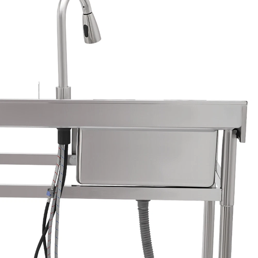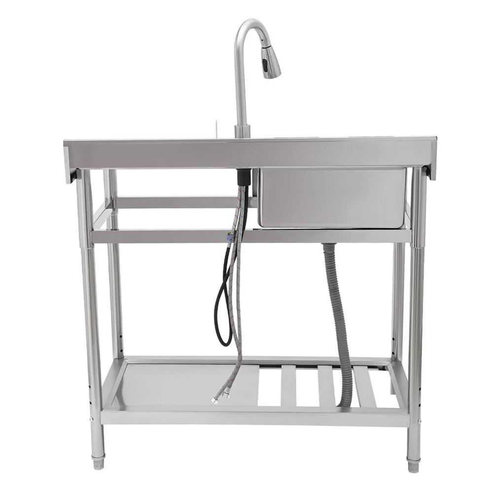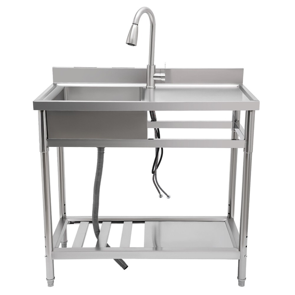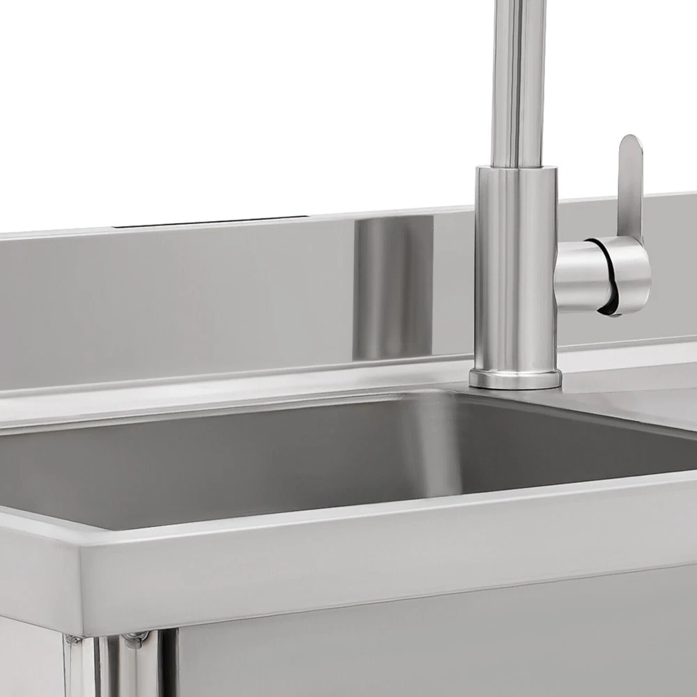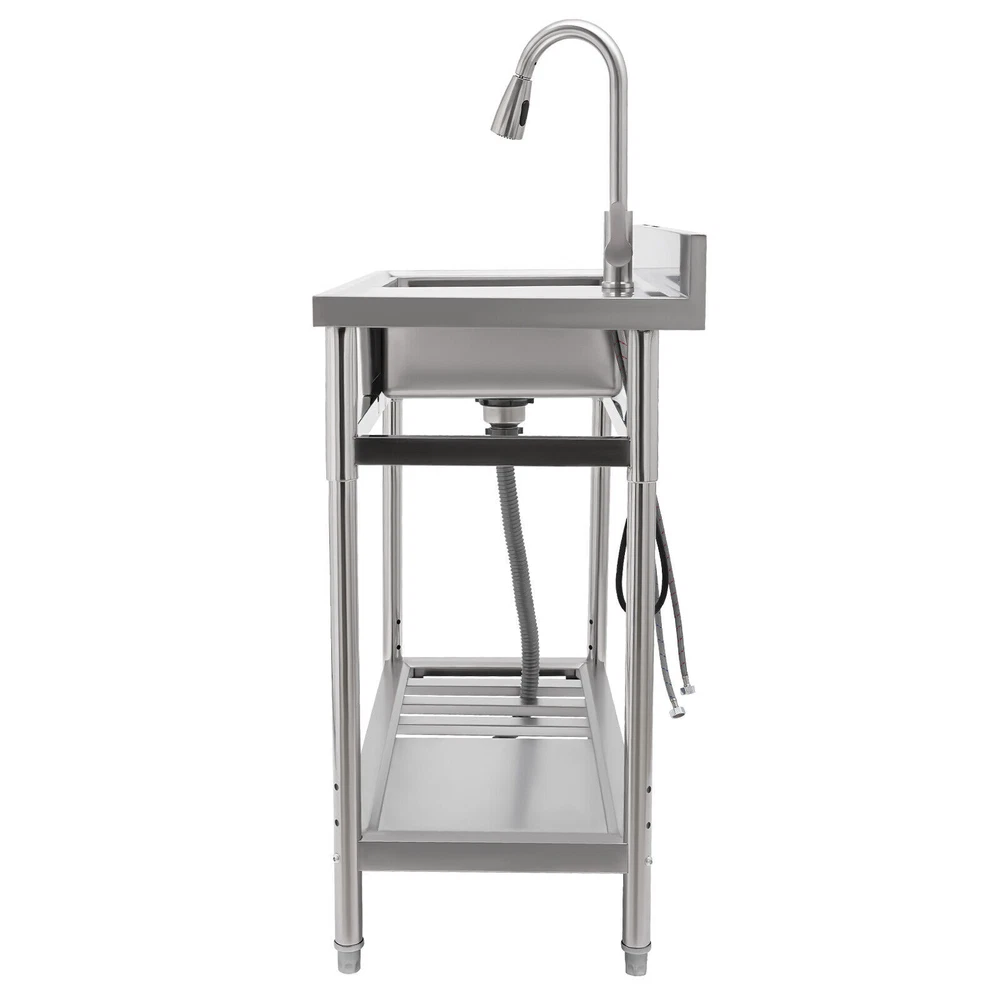 Stainless Steel Freestanding Kitchen Restaurant Sink Set with Workbench LeftBowl Description This stainless steel commercial kitchen sink with multi-functionality will be a great storage and cleaning helper for your kitchen. The stainless steel material has a smooth and shiny exterior while being strong and durable, making it both beautiful and functional. In addition, it comes with a single sink, pull-out faucet, large shelving platform, and under-mount storage platform, which not only makes cleaning easy and flexible but also gives you enough space for chopping and shelving, making it ideal for both commercial and domestic use. Key Features Build to Last: The product is made of 201 stainless steel with wire drawing and laminating processes and has a clean and shiny appearance, high strength, high hardness, good rust resistance, and long service life. Two-tier Design: It comes with a countertop to hold cooking ingredients or kitchen supplies like cutting board, and has a large lower space to store cleaning supplies and accessories, saving space in the kitchen. You can also hang towels on the crossbars for easy access. Large Single Bowl: The 16.3*15.4*7.1 inches large bowl provides you with a large place to wash and clean cooking ingredients while effectively preventing splashing water and overflow. Convenient Faucet: The faucet comes with a pull-out design that can be stretched to make the washing and cleaning work easier and more flexible in the kitchen. It also has a switch on the faucet that allows you to quickly stop the water. Equipped with dual water pipes, you can adjust the water temperature through the handle to ensure that items can be cleaned more appropriately in different scenarios. Thoughtful Design: The elevated back panel can block splashing water droplets, and prevent the wall from getting wet, moldy, and blistering off to some extent. The knife holders allow you to store your knives(not included) conveniently for easy access. Easy Maintenance: This product features streamlined rounded corners and edges, making everyday cleaning a breeze. You can wash it with mild soap, clean water, and a soft cloth for a long-lasting gloss. Protective Package: To prevent the product from being damaged during transportation, we packed it with foam and bubble bags to protect your products to the maximum extent possible. Customer Service: We aim to provide quality products and services. If you have any problems, please feel free to contact us. We will reply and solve the problem for you as soon as possible. Details Sturdy Feet: They elevate the bottom surface to keep the lower tier and the items above it away from the ground, water, and contamination while ensuring stable support for the sink. Filtration Basket: It can block large solids and residues to prevent them from going down the drain and causing clogs. Gravity Ball: It allows the faucet to retract automatically under gravity without consuming any power, which is very convenient. Application It is suitable for the kitchen, milk tea shop, dessert shop, pet shop, restaurant, hotel, cafe, bar, laundry, and other domestic or commercial places. Specifications Color: Silver Style: Modern Shape: Rectangular Material: 201 Stainless Steel Process: Wire Drawing, Laminating Mount Type: Free Standing Assembly Required: Yes Sink Placement: Left Faucet Pull-out Length: 33cm/13inch Outlet Pipe Length: 70cm/27.56inch Inlet Pipe Length: 60cm/23.62inch Outlet Pipe Interface Diameter: 3cm/1.18inch Inlet Pipe Interface Diameter: 2cm/0.79inch Thickness: 0.6mm/0.024inch Lower-tier Height: 56cm/22inch Bowl Size: 41.4*39*18cm/16.3*15.4*7.1inch Product Size: 100*50*99cm/39.4*19.7*39inch Packaging Size: 106*56*32cm/41.73*22*12.6inch Gross Weight: 19.5kg/42.99lbs Package Included 1*Commercial Kitchen Sink 1*Pull-out Faucet Other Needed Accessories Notes Please check the size carefully before ordering. Please do not clean it with hard tools like steel wire balls for a longer service life. If you want to get a better installation result, we recommend that you hire a professional plumber to install it. Please allow the slight color difference caused by the shooting light and 1-3cm error due to manual measurement, and make sure you do not mind before you order. Brand GDRASUYA10 Feature 1 Compact Design,Unique Appearance,high reliability * Feature * Nice and Practical, High Quality Packaging Features: Fast shipping from US Warehouse Installation Type Freestanding Process Wire Drawing, Laminating Assembly Required Yes Sink Placement Left Faucet Pull-out Length 33cm/13inch Outlet Pipe Length 70cm/27.56inch Inlet Pipe Length 60cm/23.62inch Outlet Pipe Interface Diameter 3cm/1.18inch Inlet Pipe Interface Diameter 2cm/0.79inch Thickness 0.6mm/0.024inch Lower-tier Height 56cm/22inch Bowl Size 41.4*39*18cm/16.3*15.4*7.1inch Product Size 100*50*99cm/39.4*19.7*39inch Type Kitchen Sink Item Height 99cm Item Length 100cm Item Width 50cm Material 201 Stainless Steel Color Silver Shape Rectangular On Nov 19, 2025 at 01:43:14 PST, seller added the following information: On Dec 10, 2025 at 23:25:00 PST, seller added the following information: