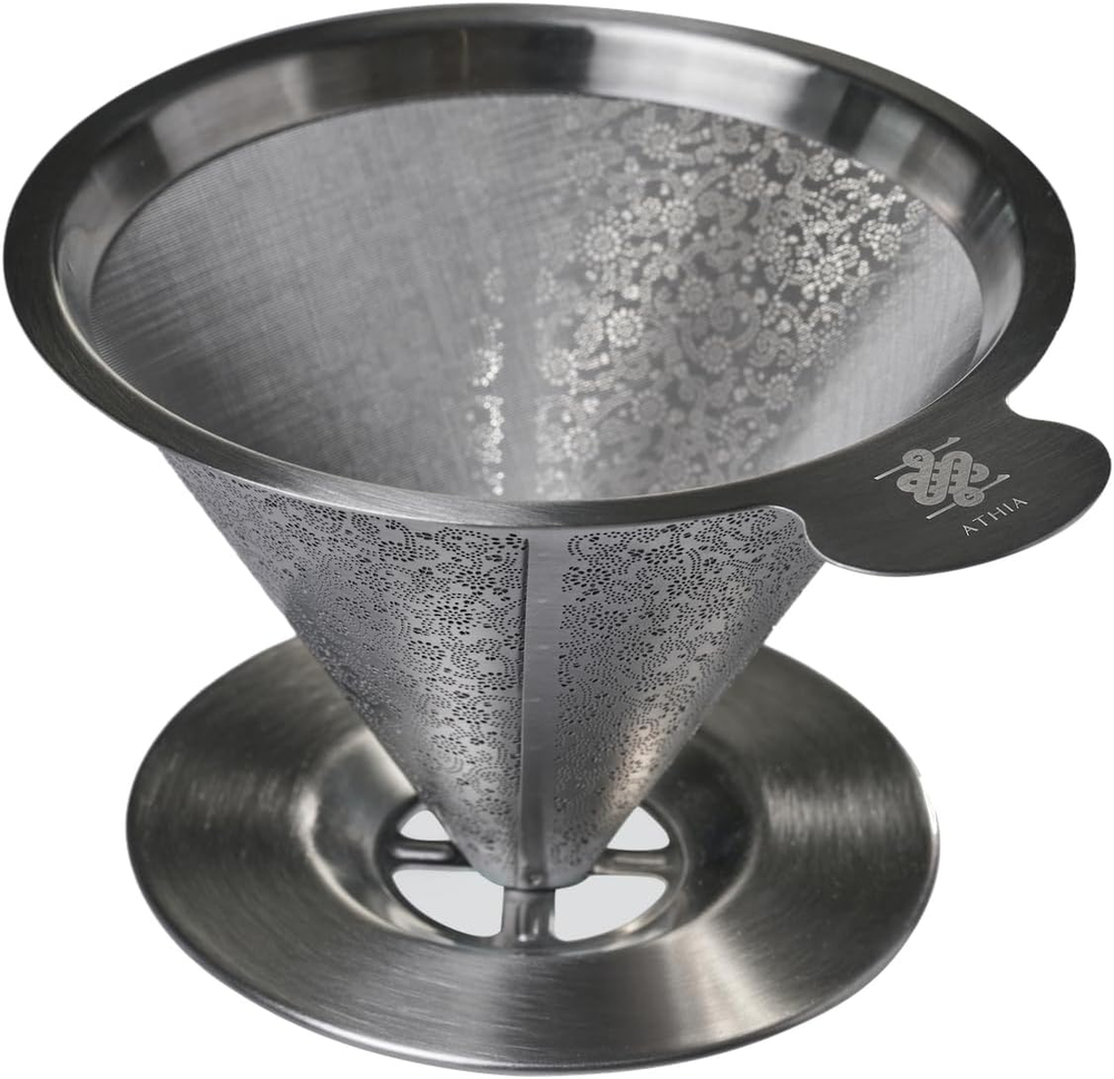 COMPATIBLE WITH MOST COFFEE MAKERS--ATHIA Golden Coffee Dripper is designed to fit Hario V60 02 and 03 drippers, as well as most standard coffee makers, coffee pots and mugs. RETAIN COFFEE AROMA--ATHIA Golden Coffee Dripper allows natural coffee bean oils and nutrients to filter through to your cup while eliminating the paper taste from traditional filters. Comparing with paper filters, the flavor becomes milder but deeper, and the aroma becomes more mellow by using ATHIA Golden Dripper. EASY to CLEAN-- After use, simply empty your coffee grounds and rinse ATHIA Golden Dripper under warm running water. We also recommend descaling your pour over filter every 2-3 weeks. Dishwasher safe. REUSE and SAVE MONEY-- ATHIA Golden Dripper allow you to use repeatedly. It provides with consistent results without sacrificing coffee quality. Your purchase may save 25,000 paper filters from heading to the landfill. By switching to ATHIA Golden coffee dripper, no more wasting money each month on paper filters. Eco-friendly Solution--ATHIA Golden Dripper provides an eco-friendly solution for pour-over coffee. To switch to ATHIA Golden Dripper today you’re helping save our planet tomorrow. Reduce, Reuse and Recycle! Product Description DOUBLE LAYERS 304 STAINLESS STEEL MADE COFFEE FILTERS Standard- Silver No more paper filters. Standard-Rose Golden No paper filter bleaching concern. Standard-Golden Not sticky powder and easy to clean. High quality coffee dripper It provides with consistent results without sacrificing coffee quality. It allows you to use repeatedly. RETAIN COFFEE AROMA milder but deeper ATHIA Golden Coffee Dripper allows natural coffee bean oils and nutrients to filter through to your cup while eliminating the paper taste from traditional filters. Comparing with paper filters, the flavor becomes milder but deeper, and the aroma becomes more mellow by using ATHIA Golden Dripper. ATHIA GOLDEN DRIPPER is made by double-layers 500 meshes with elaborated design ATHIA GOLDEN DRIPPER with elaborate carving-Rose Golden ATHIA GOLDEN DRIPPER with elaborate carving-silver ATHIA GOLDEN DRIPPER with elaborate carving-golden EASY to CLEAN After use, simply empty your coffee grounds and rinse ATHIA Golden Dripper under warm running water. We also recommend descaling your pour over filter every 2-3 weeks. Dishwasher safe. ATHIA GOLDEN DRIPPERs have cone shape design for your choice. Elaborate Golden and Rose golden are available. Eco choice ATHIA Golden Dripper provides high quality, delicate design and eco solution for pour-over coffee. Reuse and Save money Your purchase may save 25,000 paper filters from heading to the landfill. By switching to ATHIA Golden coffee dripper, no more wasting money each month on paper filters. upper view To switch to ATHIA Golden Dripper today you’re helping save our planet tomorrow. Reduce, Reuse and Recycle! Elaborate design golden rose golden rose golden Elaborate design to fit most coffee makers ATHIA Golden Coffee Dripper is designed to fit Hario V60 02 and 03 drippers, as well as most standard coffee makers, coffee pots and mugs.