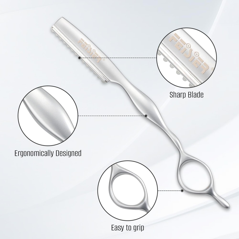 Stainless Steel Hair Thinning Styling Razors for Cutting Hair, Silver Product Details Product Dimensions : 7.28 x 0.98 x 0.28 inches; 4.16 ounces Manufacturer : FEISIER Brand: FEISIER Number of Blades: 10 Recommended Uses For Product: Hair Thinning Styling Age Range (Description): Adult Skin Type: Normal 【DURABLE MATERIAL】: The Hair thinning razor is made of stainless steel and inclued 10 replacement blades in a box. The quantity is enough to meet your daily use and replacement, and can provide you with long-lasting service. 【UNIQUE DESIGN】: The appearance of adopts matte finish,the frosted look more advanced. The handle is ergonomically designed and functional, reducing thumb and wrist hyperextension and relaxing elbows and wrists. 【EASY TO USE】: Hair thinning razor easy to install,quick blade insert and remove, thinning Razor is innovatively designed for smooth styling experience.Easy for anyone to use, suitable for salon, home and personal use, giving you a relaxing and shaving experience. 【SAFETY CUTTING HAIR】: Hair thinning knife with safety guard, better prevent skin from being scratched.Also note that it comes with sharp blades, should be handled with care. 【VARIOUS FUNCTION】: Slender razor edge can be used for thin bangs, shaving, trimming hair, etc, you can also use them to trim wigs and pet's bristle.Favorite hair thinning knife for stylists and barbers, suitable for all types of hair.