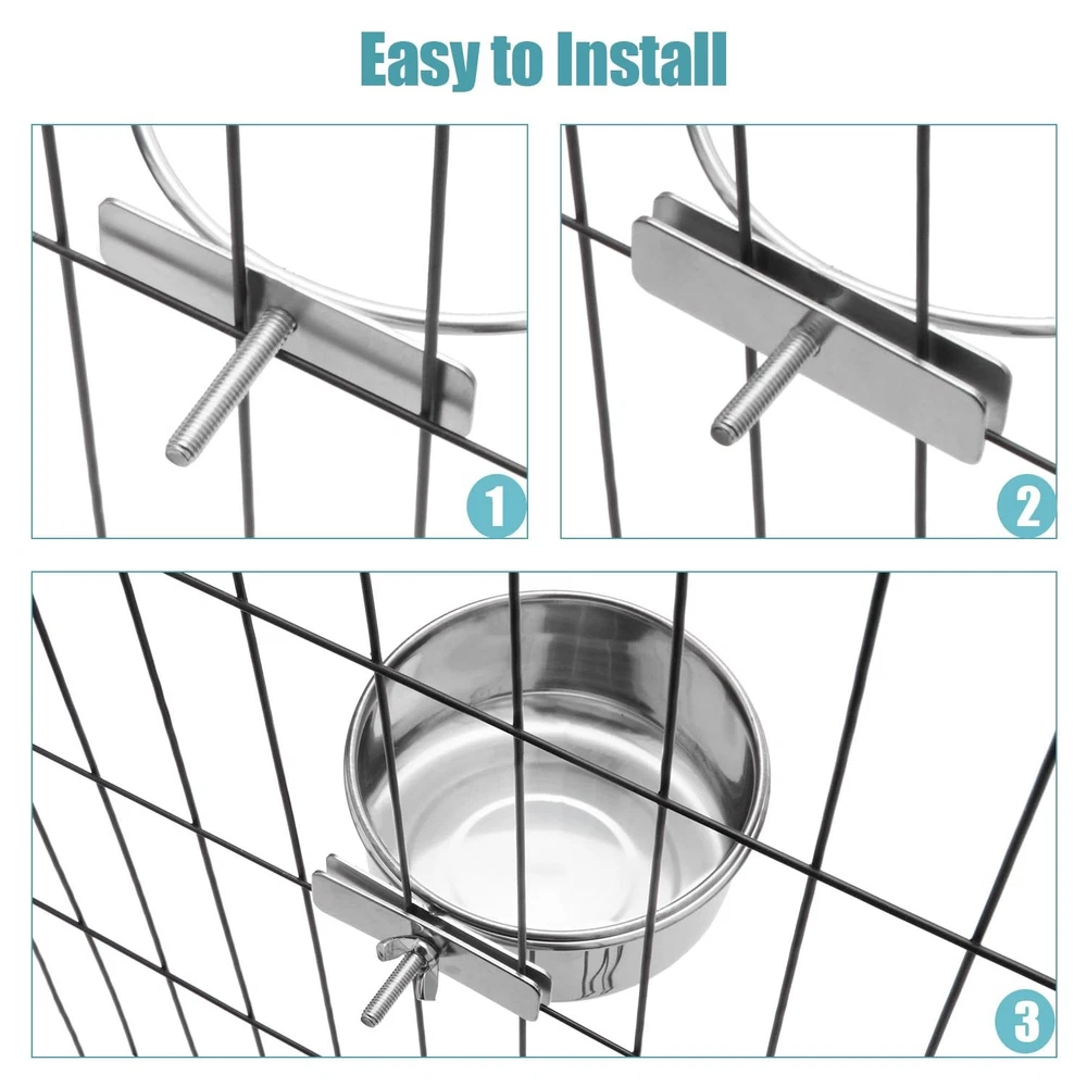 The pet bowl is made of stainless steel, durable and rust resistant, perfect for your pet's long lasting use. The pet bowl is made of stainless steel, durable and rust resistant, perfect for your pet's long lasting use Easy to install on the cage, the removable bracket holds the bowl tightly in place and helps reduce food and water spills Our feeding bowl is perfect for providing water or food for pets, easy to clean and keep the water fresh The stainless steel bowl is easily removed from the holder for cleaning and filling Not only for dogs and cats, but also for small animals such as budgies, cockatiels, african greys, rabbits, guinea pigs, etc