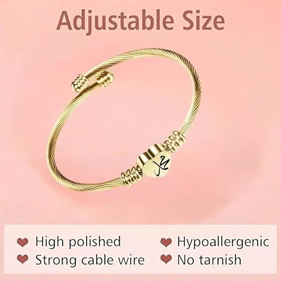 Elegant but cute bangle bracelet with heart charm, fashionable and perfect to bright up your overall outfit. This romantic heart design with adjustable size feature will make it great mother gift and best friend bracelet. Customizable: We can engrave some words on the heart charm for you. Size:The Letter Cuff Initial Bangle Bracelet is Expandable,You can use a soft ruler to measure the circumference of your wrist or ankle so that you can choose the product that suits you. Material: Alphabet Cuff Letter Initial Bangle Bracelet jewelry is made of high quality stainless steel which is 100% safe for sensitive skin ,and it has been electroplated so it will not fade,tarnish,rust or stain. This beautiful Letter Initial Alphabet cuff bangle bracelet can be as a fashion gift for mother or father or grandfather or grandmother or brother or sister or wife or husband or daughter or son and other loved ones.This charming anklet jewelry is suitable for all occasions, all kinds of anniversaries and all people like women,men,boys,girls,adults,elder people or children.For different people,it has different meanings and expresses different feeling. Packaging: We will carefully package the product, you don't have to worry about the jewelry charm being damaged. After-sales service: We sincerely serve you, if you have any other questions, you can contact us at any time, we are happy to serve you.