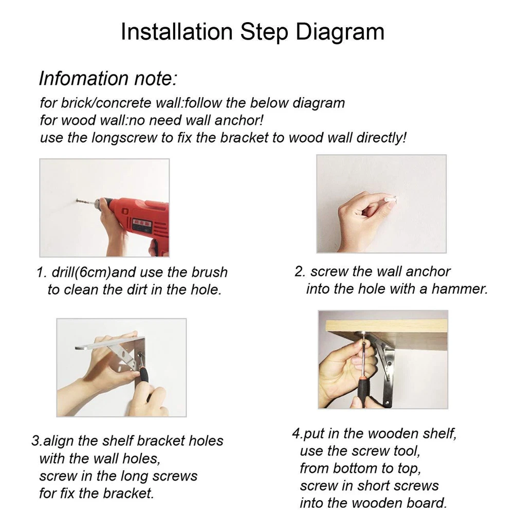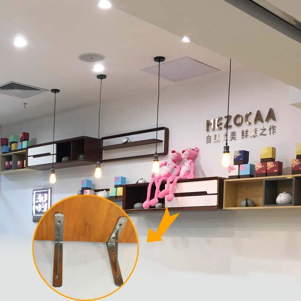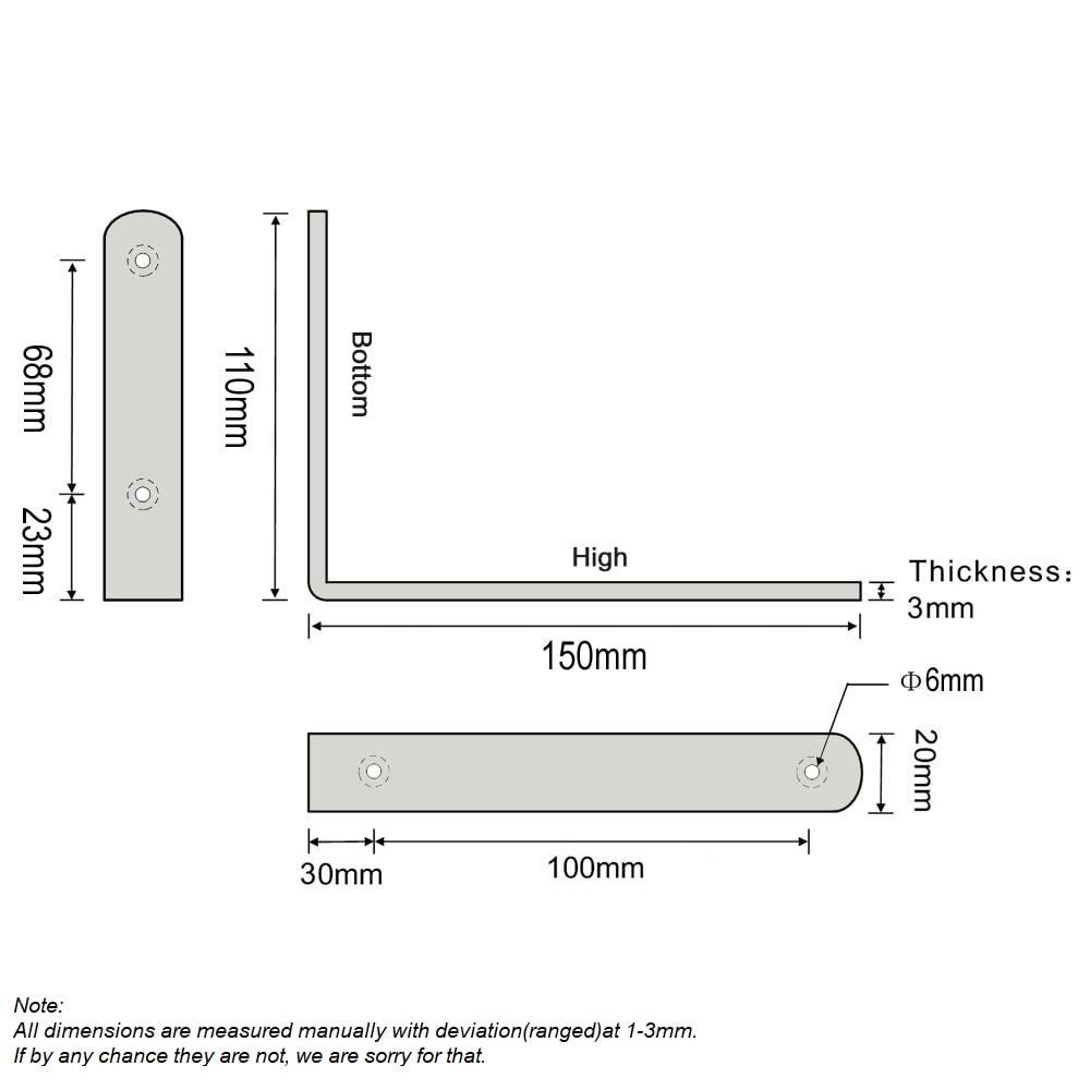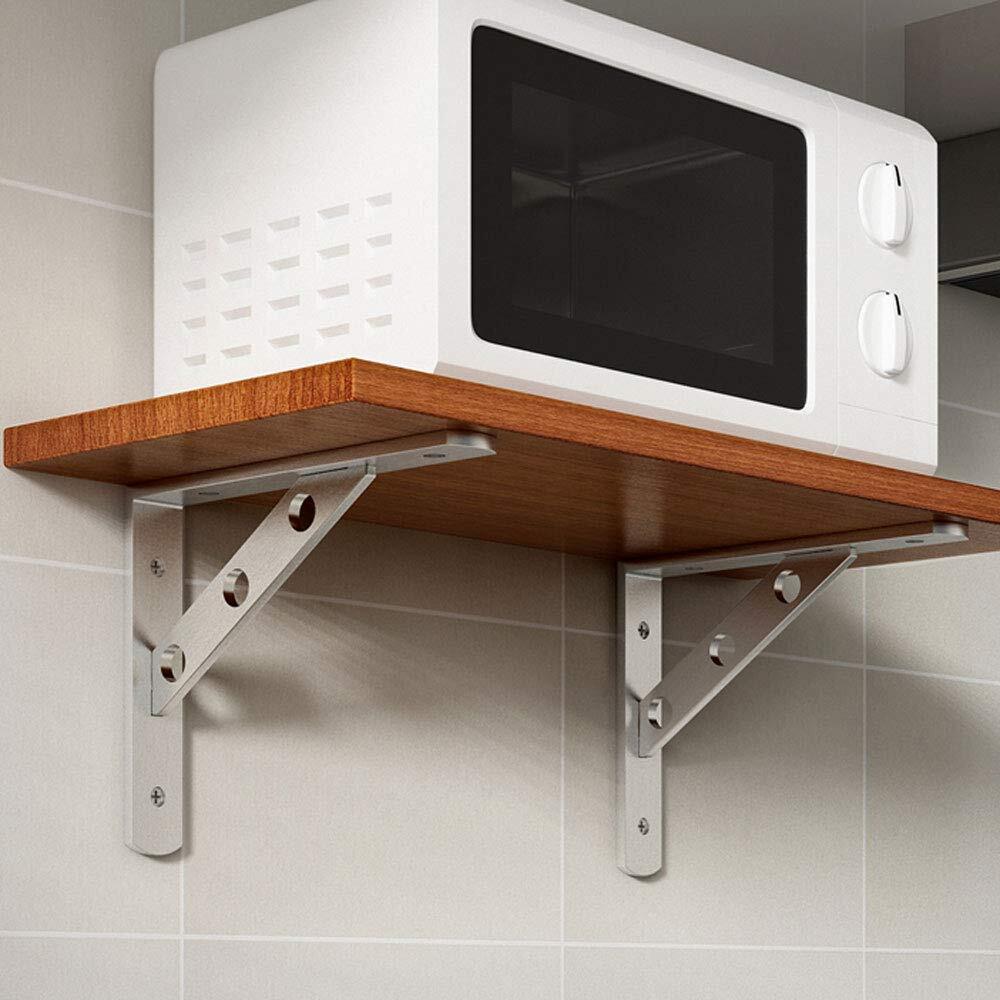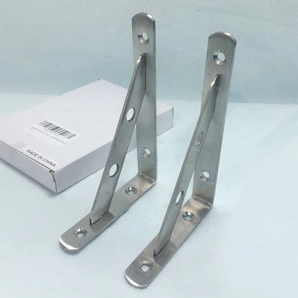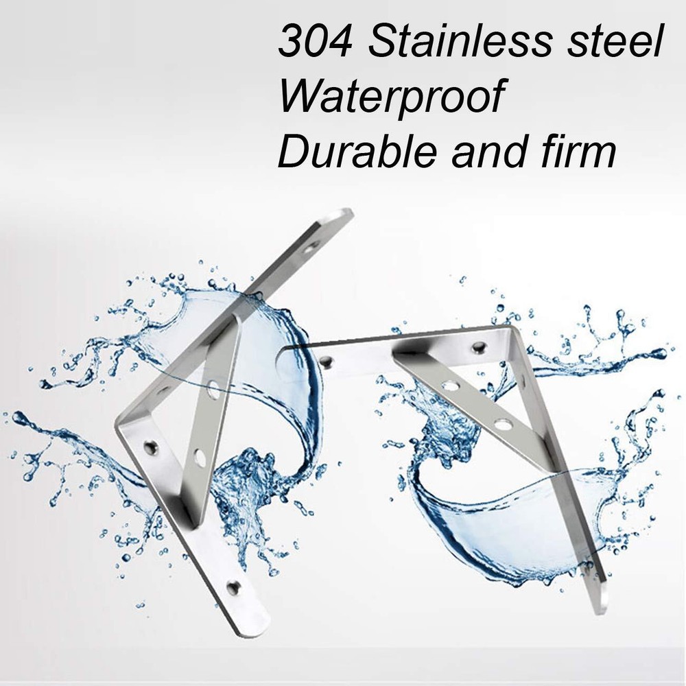 Color: Silver Tone Hole Quantity: 4 Holes Finish: Brushed Steel Installation Method: Screw Fixing Gross Weight: 0.57bl Or 260g Maximum Weight Capacity: 200bl Package Includes: 2 x Angle Brackets The screws are not included Solid Metal Construction, 3mm Thick, Heavy Duty Design Solid Stainless Steel Materials, Suitable For All Kinds Of Layer Board, Shelf, Glass, Marble, Fixed Support, A Must-Have In Good Diy Shelf. Bracket On The Wall, Just Put On A Board Shelf Can Become Beautiful And Generous. Is Often Used As Microwave Oven Racks, Shelves, Flower, Etc. Still Can Put The Computer In The Room, Cosmetics, Photos Etc 20-Days Return Guaranteed Note: ①the removable bridge in between is nice when installing as it gives you full access to the screw holes,so that's nice. but some customer don't love because the removable bridge will fall out of the slots with the upward force. If you need upward force,suggest to buy the welding product. ②Due to transportation,the crossbar falls out, you can squeeze it inward to make the angle less than 90 degrees (maybe 87 degrees or so), to ensure the support. ③All dimensions are measured manually with deviation(ranged)at 1-3 millimeter. If by any chance they are not, we are sorry for that. ①Constructed From High Quality Stainless Steel,Ensuring Quality And Longevity ②Product Name: Right Angle Brackets Or Heavy Duty Shelf Brackets Or Removable Brackets; Material: Stainless Steel ③Size: 15cmx11cmx2cm(L*W*H) / 6"x4"x0.79"(L*W*H);Thickness:3mm/0.12";Hole Dia.: 6mm/0.24" ④Package Content: 2 x Removable Brackets,the screws are not included,20-Days Return Guaranteed. ⑤Easy To Install: Sturdy And Durable.The Removable Bridge In Between Is Nice When Installing As It Gives You Full Access To The Screw Holes.