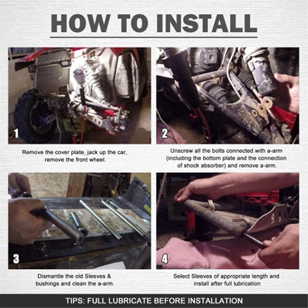 Store New Arrivals Add to Favorite View Feedback Contact Stainless Steel Heavy-Duty A-Arm Control Arm Bushings Kit Brake Suspension Compatible with Polaris Ranger XP 900 / Crew 2013-2021 (Front and Rear) Description Item Weight 0.035 ounces Manufacturer Part Number MB-ABK004 Package Dimensions 8.98 x 6.61 x 3.23 inches 【Compatible with】 Compatible with 2013+ Polaris Ranger XP 900, 2014+ Polaris Ranger XP 900 Crew. 【Easy to install】 Direct and easy installation. 【Function】ushings are suitable for front and rear A-arms, the number of bushings meets the needs of the entire suspension. Control arm bushings with heavy-duty material will provide better cushion performance for your vehicle, reducing the friction between different parts, and protect the front and rear suspension." 【Excellent Quality】using high-quality Iron and polypropylene as raw material. The raw materials meet the standards. 【Package Include】36× Plastic Bases, 18× Sleeves.(As the picture shows) Product Description Compatible with Compatible with 2013+ Polaris Ranger XP 900, 2014+ Polaris Ranger XP 900 Crew. Feature Function: Ushings are suitable for front and rear A-arms, the number of bushings meets the needs of the entire suspension. Control arm bushings with heavy-duty material will provide better cushion performance for your vehicle, reducing the friction between different parts, and protect the front and rear suspension." Excellent Quality: Using high-quality Iron and polypropylene as raw material. The raw materials meet the standards. What will you get Plastic Bases * 36 Sleeves * 18 Installation Step 1 Remove the cover plate, jack up the car, remove the front wheel. Step 2 Unscrew all the bolts connected with a-arm(including the bottom plate and the connection of shock absorber) and remove a-arm. Step 3 Dismantle the old sleeves & bushings and clean the a-arm. Step 4 Select sleeves of appropriate length and install after full lubrication. ABOUT US We offer the best prices around on high quality products. Our E-store includes media such as books, movies, music and games while offering electronics, toys, sporting apparel, clothing, tools, general home, garden items and more. SHIPPING We are always working hard to ensure your package arrives as soon as possible. Please understand that some factors like weather, high postal traffic, and the performance of shipping companies are outside of our control. We offer free shipping to the lower 48 states and ship within 2 business days of payment, usually sooner. We do not accept P.O. Boxes. Please provide a physical address. For shipping outside of the continental USA, we only use eBay's Global Shipping Program.The item is shipped to KY and then sent to the rest of the world. International customers are responsible for all duties and taxes. Continue to check out in order to calculate costs for shipping the item to your country. Messages regarding eBay's Global Shipping Program MUST be directed at eBay EXCLUSIVELY. RETURNS We offer a 30-Day Return Policy on items which you are not completely satisfied with. You have the option for a full-refund or an exchange of the item. No returns are available on items shipped outside of the USA. PAYMENT We accept PayPal. CONTACT US This page content is yet to come Please ad us to your favorite seller and visit again later Thank You CUSTOMER SATISFACTION We try our very best to make sure every customer is completely satisfied. If there's a problem, message us! We're happy to help. WE ACCEPT Copyright © 2021 AutoDS. | All Rights Reserved