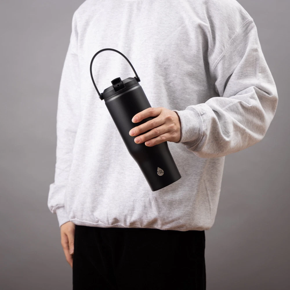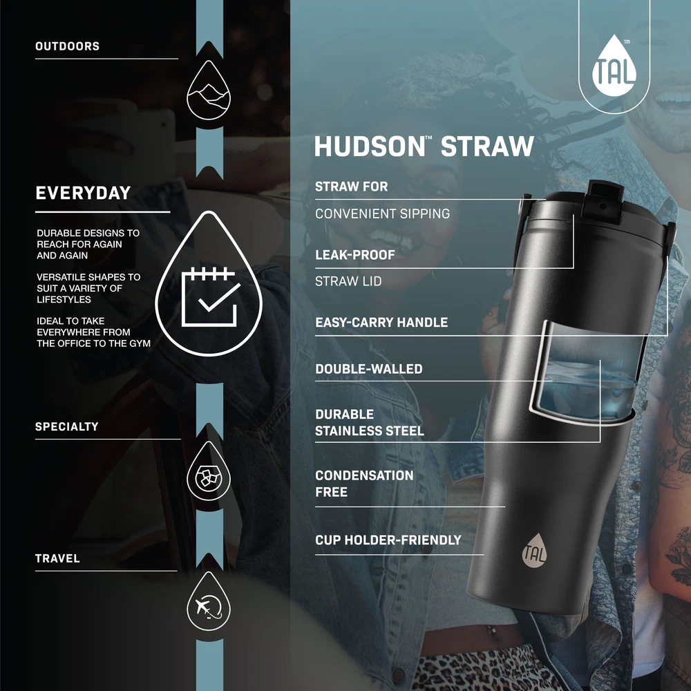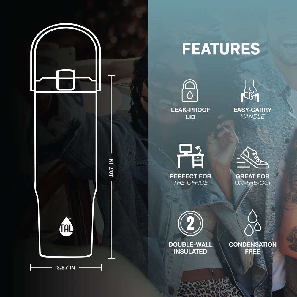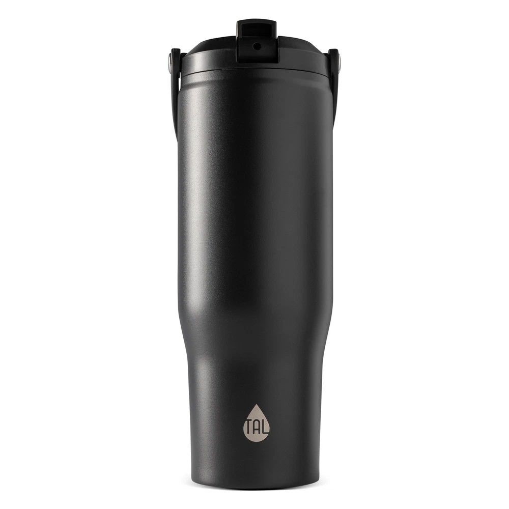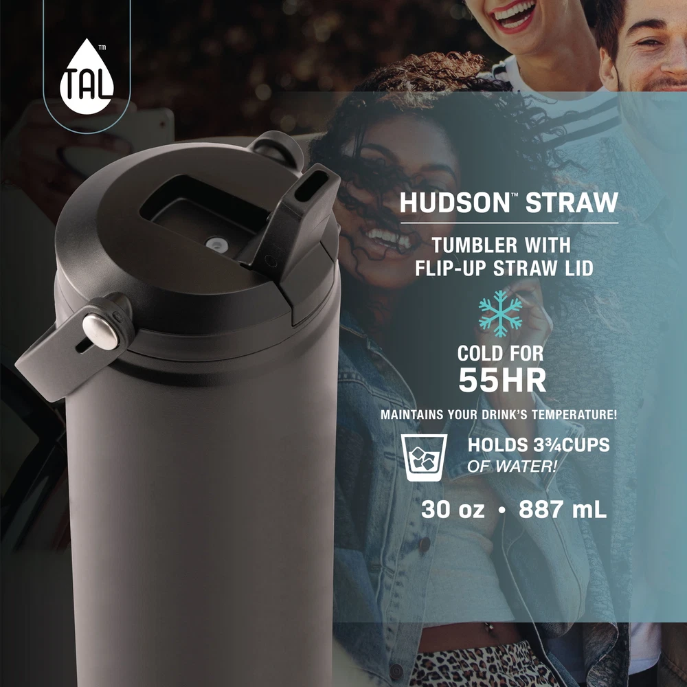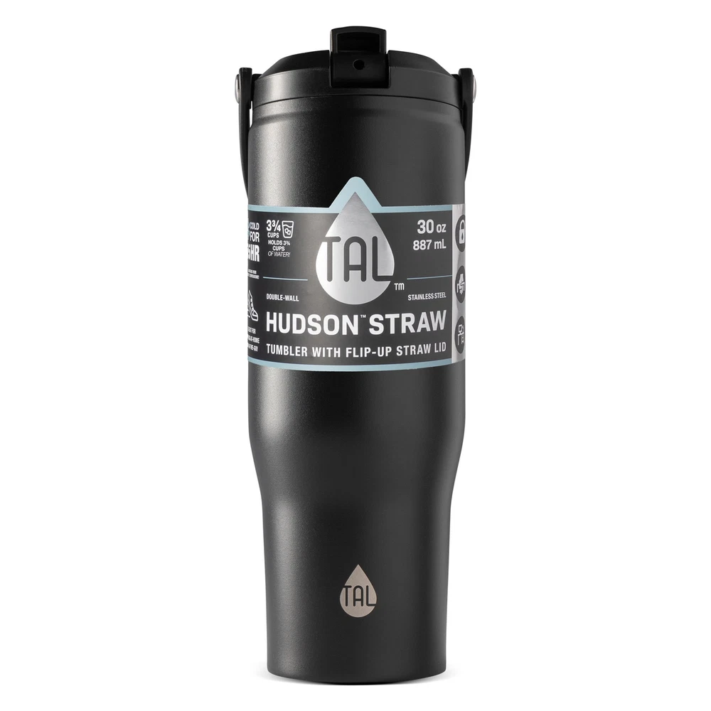 TAL Stainless Steel Hudson Tumbler with Flip-Up Straw 30oz, Black is your ultimate companion for convenient and stylish hydration. Crafted with precision from high-quality stainless steel, this tumbler ensures durability and a sleek design. The innovative flip-up straw design makes sipping a breeze, providing a spill-resistant and effortless way to enjoy your favorite beverages on the go. With an impressive 30 oz capacity, you'll have plenty of room to quench your thirst throughout the day. The double-wall vacuum insulation guarantees that your drinks stay at the perfect temperature, whether you're sipping on icy cold refreshments or warm beverages. Wherever your day takes you – from work to outdoor adventures – the TAL Stainless Steel Tumbler with Flip-Up Straw is the ideal blend of practicality and style, ensuring that every sip is a satisfying experience. For product's longevity, please hand wash. TAL Stainless Steel Hudson Tumbler with Flip-Up Straw 30oz, Black Leak-proof lid Easy-carry handle Fits in most cupholders Great for On-the-go