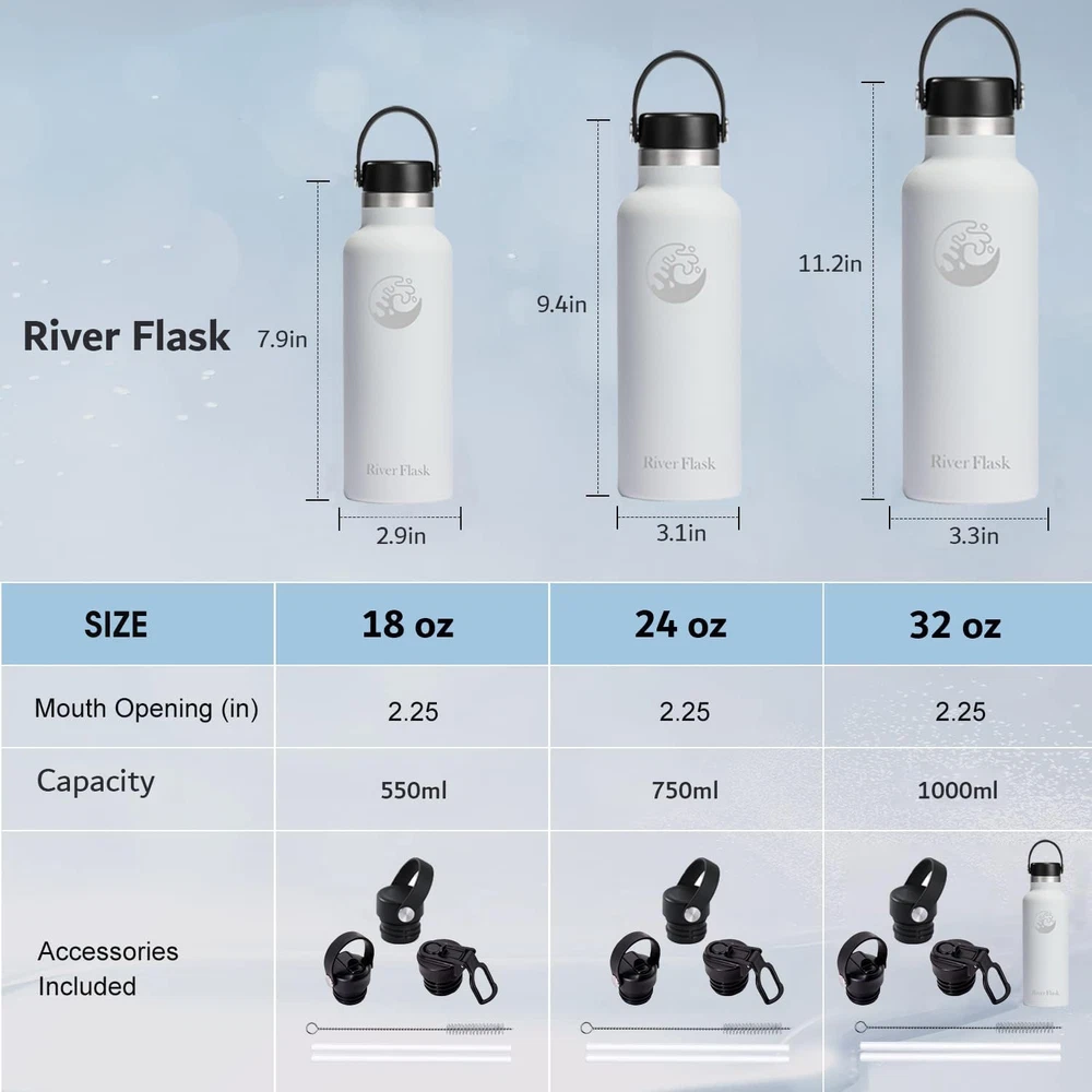 Store New Arrivals Add to Favorite View Feedback Contact Stainless Steel Insulated Water Bottle with 3 Lids,2 Straws,1 Straw Brush,Hot & Cold, Double-Wall Vacuum Insulation, Leak Proof, Bpa-Free Flask for Sports, Travel, Gym (White, 32 Oz) Description Age Range Description Adult Capacity 32 Fluid Ounces Number of Items 1 Color White Is the item dishwasher safe? Yes Material Type Stainless Steel Global Trade Identification Number 05419980408631 Theme Travel, School, Sport, Work, Outdoor With Lid Yes Model Name RF Standard Mouth Straw Recommended Uses For Product Hot & Cold Beverages (Coffee,Tea,Soup,Smoothies,Milkshakes,Water etc.) Item Dimensions W x H 1.18"W x 11.2"H Included Components Water Bottle , 3 Different Lids , 2 Straws, 1 Straw Brush Special Feature function(f) {var _np=(window.P._namespace("DetailPageProductOverviewTemplatesJava"));if(_np.guardFatal){_np.guardFatal(f)(_np);}else{f(_np);}}(function(P) { P.when('A').execute(function(A){ A.on('a:truncate:po-attribute-truncate-4:updated', function(data) { var isTruncated = !data.truncateInstance.getIfTextFits(); var seeMoreElement = document.getElementById('po-attribute-see-more-id-4'); if(seeMoreElement) { seeMoreElement.style.display = isTruncated ? '' : 'none'; } }) }); })); Leak Proof, Double Wall, BPA-Free, Sweat Resistant, Cold 24 Hours & Hot 12 Hours, Dishwasher Safe, 3 Types of Lids, Carrying Loop, Eco Friendly See more Special Features Leak Proof, Double Wall, BPA-Free, Sweat Resistant, Cold 24 Hours & Hot 12 Hours, Dishwasher Safe, 3 Types of Lids, Carrying Loop, Eco Friendly Product Care Instructions Dishwasher Safe Size 32 Oz βœ…πŸπŸ–/πŸ– ππ‘π„πŒπˆπ”πŒ π’π“π€πˆππ‹π„π’π’ 𝐒𝐓𝐄𝐄𝐋: The River Flask is made of food-grade 18/8 stainless steel that is BPA-free and non-toxic. It will never leave a metal taste or rust, the double walled insulated bottle keep your drinks hot for 12 hours and cold for 24 hours. Fill up your bottle with your favorite ice cold beverage and feel refreshed all day! βœ…πŸ‘ πƒπˆπ…π…π„π‘π„ππ“ π’π“π˜π‹π„ π‹πˆπƒπ’: Our drinking insulated water bottle comes with 3 individual lids, 2 straws, 1 Straw cleaning brush to serve all your needs. The two straw lids for cold beverages, and the removable wide mouth lid for drinks containing ice or fruit. All lids are BPA-free, leak-proof, and dust-proof, catering to your needs. βœ…π’π–π„π€π“-ππ‘πŽπŽπ… & 𝐃𝐔𝐑𝐀𝐁𝐋𝐄 πƒπ„π’πˆπ†π: This wide mouth water bottle is made to resist odors and stains, maintaining the freshness and cleanliness of the reusable water bottle over time. The metal thermos exterior is designed to resist condensation, ensuring that the outside of the bottle remains dry and easy to handle. βœ…π‚π€ππ€π‚πˆπ“π˜ & π’πˆπ™π„ πŽππ“πˆπŽππ’: The metal water bottle comes in various sizes, including 18 oz, 24oz, and 32 oz, with a range of colors to choose from according to your need. All sizes water bottles fit most cup holders. The insulated sports water bottle is ideal for outdoor activities, bike rides, camping trips, the gym, work, or indoor use. Carry this water bottle with you wherever you go and stay hydrated all day. It's safe in backpacks, beach bags, or on the edge of your countertop. Plus, it's dishwasher safe for easy cleaning. βœ…π‘πˆπ•π„π‘π’ π‡π„π€π‹π“π‡π˜ 𝐀𝐍𝐃 π„π‚πŽ-π…π‘πˆπ„ππƒπ‹π˜: Your purchase supports Rivers Projects all over the World. River Flask is a mission driven brand that provides environmental conscience products to drive change in less fortunate areas of the World. Make the switch from plastic to River Flask stainless-steel insulated reusable water bottle and protect the environment and your health. βœ…πŸπŸŽπŸŽ% π’π€π“πˆπ’π…π€π‚π“πˆπŽπ 𝐆𝐔𝐀𝐑𝐀𝐍𝐓𝐄𝐄𝐃: We assure you that the River Flask, known for its premium quality, is certain to meet your satisfaction. However, if you're not completely pleased with the River Flask for any reason, we offer an exchange. Product Description Waste Reduction & Sustainability The River Flask brand is committed to combating throwaway plastic bottles by offering superior stainless steel alternatives. Our commitment to sustainability drives us to provide reusable products that not only benefit the environment but also promote personal well-being Giving Back - 1% Promise Stainless Steel Insulated Water Bottle River Flask is dedicated to contributing 1% of its total revenue to local charities, initiatives, and water-focused projects worldwide. Our donations support water assistance in underprivileged nations, the construction of water wells abroad, and the cleanup of rivers from waste and chemical pollution. Additionally, we address issues such as drought and water scarcity, flooding, and habitat loss. ABOUT US We offer the best prices around on high quality products. Our E-store includes media such as books, movies, music and games while offering electronics, toys, sporting apparel, clothing, tools, general home, garden items and more. SHIPPING We are always working hard to ensure your package arrives as soon as possible. Please understand that some factors like weather, high postal traffic, and the performance of shipping companies are outside of our control. We offer free shipping to the