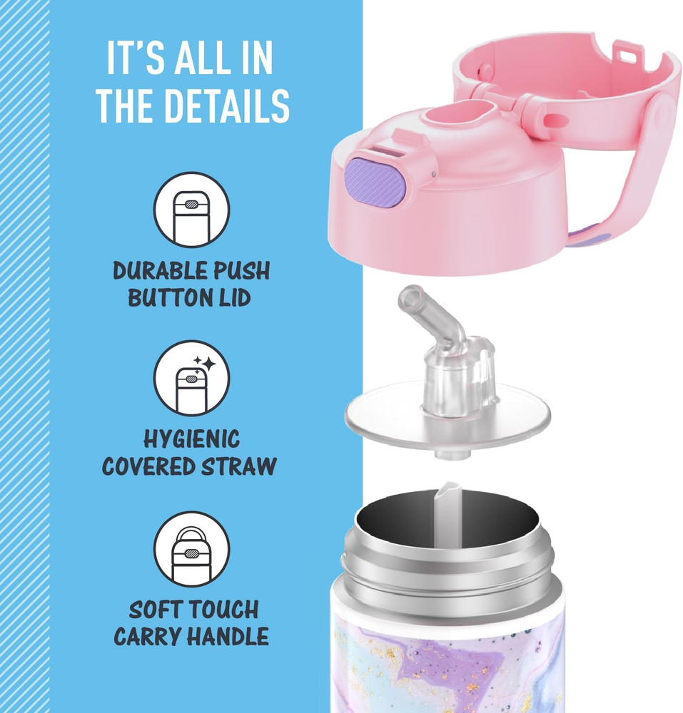 Stays cold: THERMOS vacuum insulation technology keeps drinks cold for up to 12 hours. Our stainless steel water bottles are built so their drinks are as cool on the inside as they look on the outside. Not for hot liquids Kid-friendly design: This reusable metal water bottle is lightweight and compact with a push button lid so it’s easy to carry and open. The integrated carry handle features a soft touch grip Daily durability: Perfect kids water bottle for school and daily use. Made with high-quality 18/8 stainless steel construction to handle drops, dings and provide everyday durability and reliability. Comes in a variety of fun colors and patterns Easy care and cleaning: Help keep germs away with a hygienically covered pop-up straw that’s also removable for easy cleaning. This kids water bottle is dishwasher safe, though washing by hand is recommended Protect what you love: With 120 years of heritage, Thermos Brand food and beverage containers keep things fresh, sealed and protected. Trusted since 1904 because our products help make everyday life a little better, every time The FUNtainer 12oz Vacuum Insulated Stainless Steel Water Bottle with Straw keeps drinks cold for up to 12 hours. Our kids water bottles are built so their drinks are as cool on the inside as they look on the outside. Kids stay hydrated and parents stay happy. The double wall stainless steel construction is built to handle drops, dings and assorted roughhousing. Includes an integrated carry handle with soft-touch grip, making it easy for kids to carry with them throughout the day. Help keep germs away with the hygienically covered silicone straw which is removable for easy cleaning. To clean, you can pop your FUNtainer water bottle in the dishwasher; however hand washing is recommended. Not for use with hot liquids.