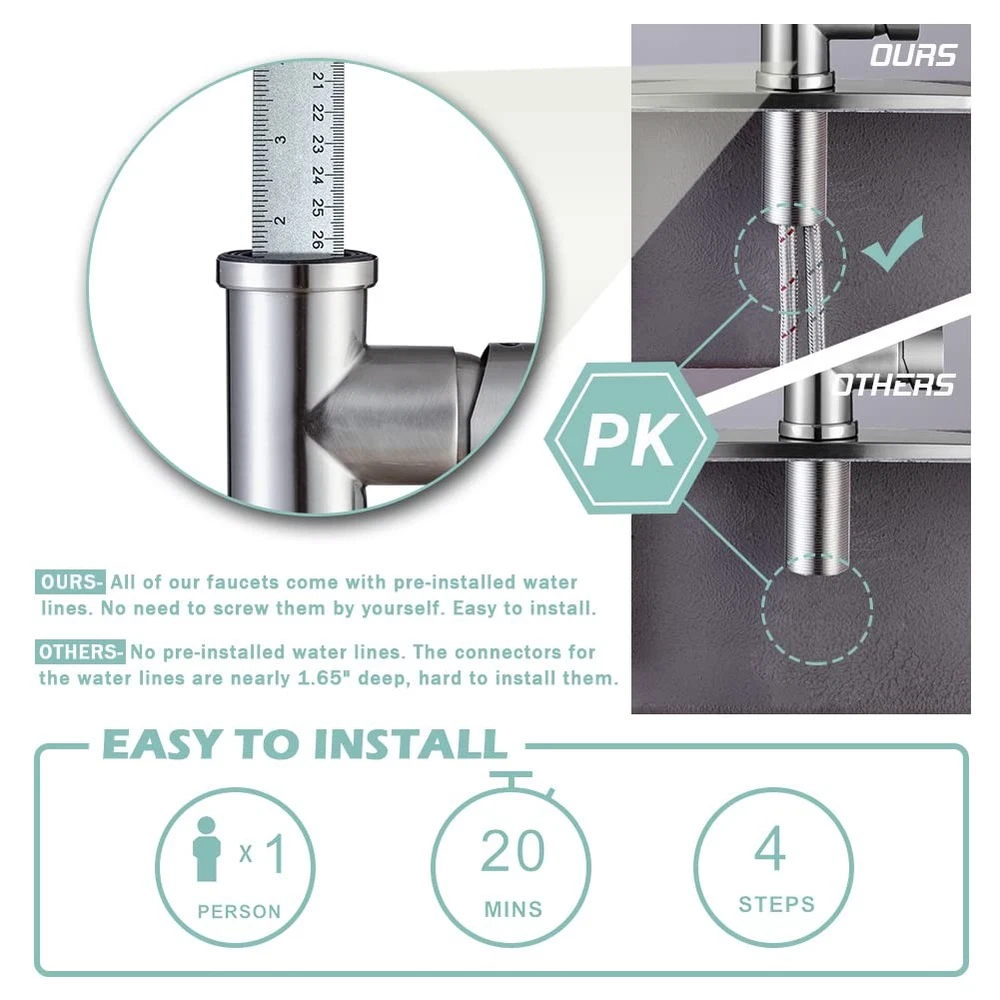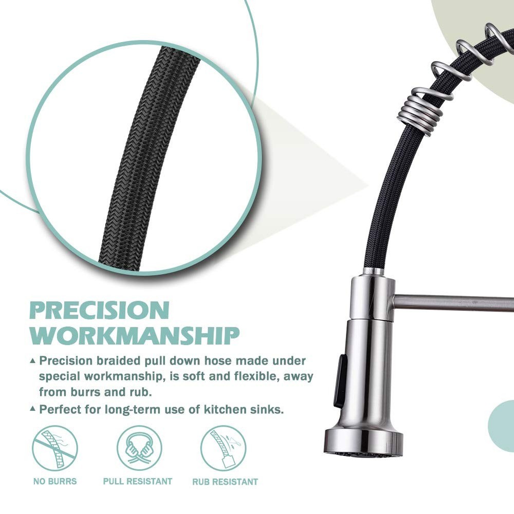 ★100% Perfectly Safe Purchase:Guarantee of 5 years warranty. ★Easy Installation: Contains complete kit for easy installation; simple DIY. ★ENVIRONMENT FRIENDLY and HEALTHY Easy to match- Your kitchen sink faucets features a heavy-duty commercial sink faucet open spring design, easily matches all decorating style. This modern kitchen faucet can be used for farmhouse kitchen faucet, rv kitchen faucet, camper kitchen faucet, laundry faucet. Dual mode setting- Your kitchen faucets with pull down sprayer features a dual mode setting, to easily switch from non-splash stream to powerful rinse. The stainless steel sink faucet with 360 rotating nozzle, offers a more ergonomic usage, the utility sink faucet with sprayer provides different user experience. Easy to maintain- Your sus304 stainless steel kitchen faucet is made of eco-friendly stainless steel, and treated with 7 layers finish processing, this high quality kitchen sink faucet brushed nickel prevents dirt and dust, requires less cleaning. Having more fun time with your family due to this fantastic utility sink faucet. Easy to use- Your kitchen sink faucets with pullout sprayer is equipped with precision utility faucet black hose, which is soft and flexible, has no worry of burrs and rub, easy to use. The kitchen faucet brushed nickel with the high quality pull out kitchen faucet hose, is perfect for long-term use. Easy to install- The kitchen faucet with sprayer comes with all the parts needed. A DIY installation for this water faucet can be finished within 20 minutes. You will be amazed at this super easy-installed stainless kitchen faucet. Deck plate included, one hole kitchen faucet or 3 hole kitchen faucet installation as you like.