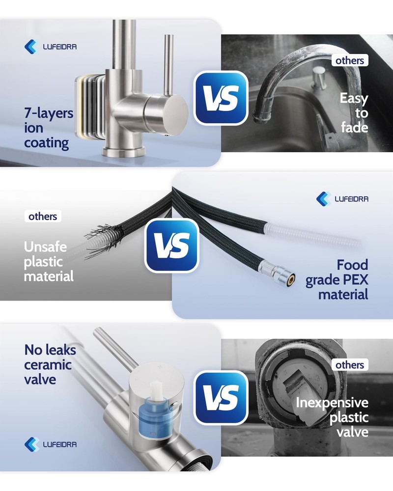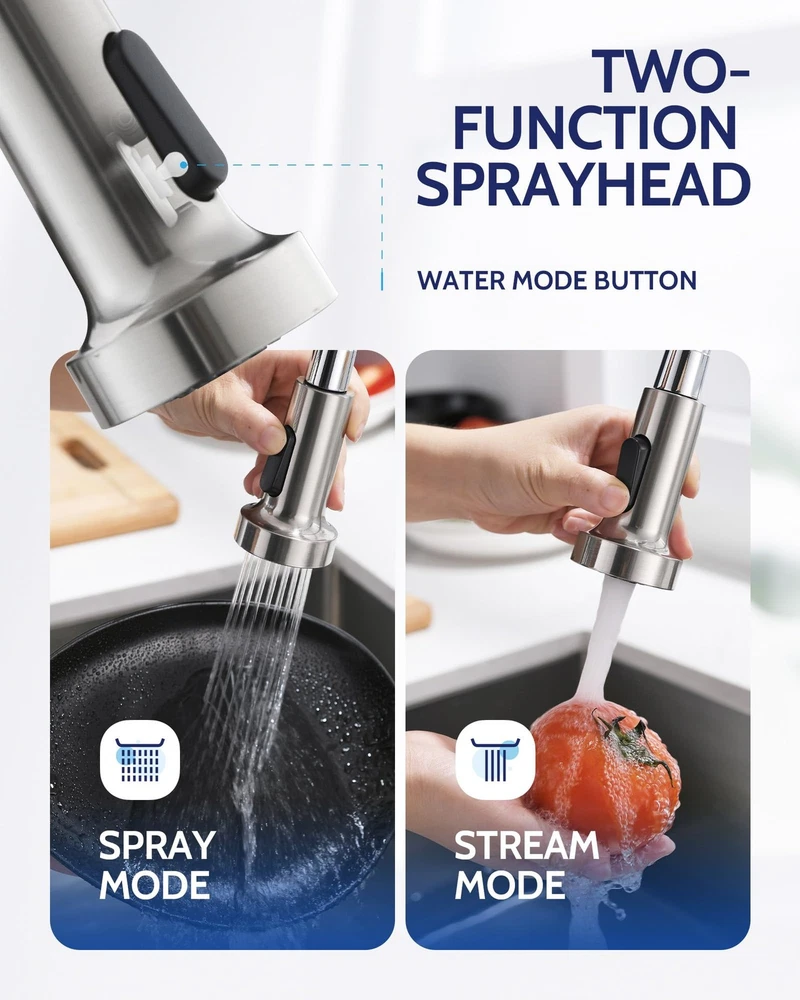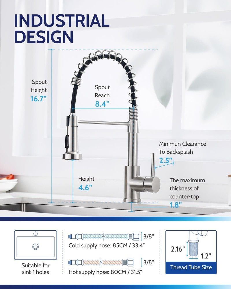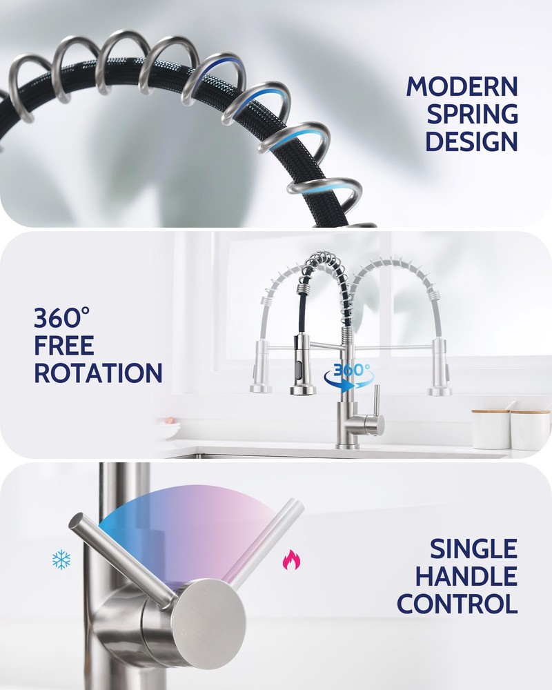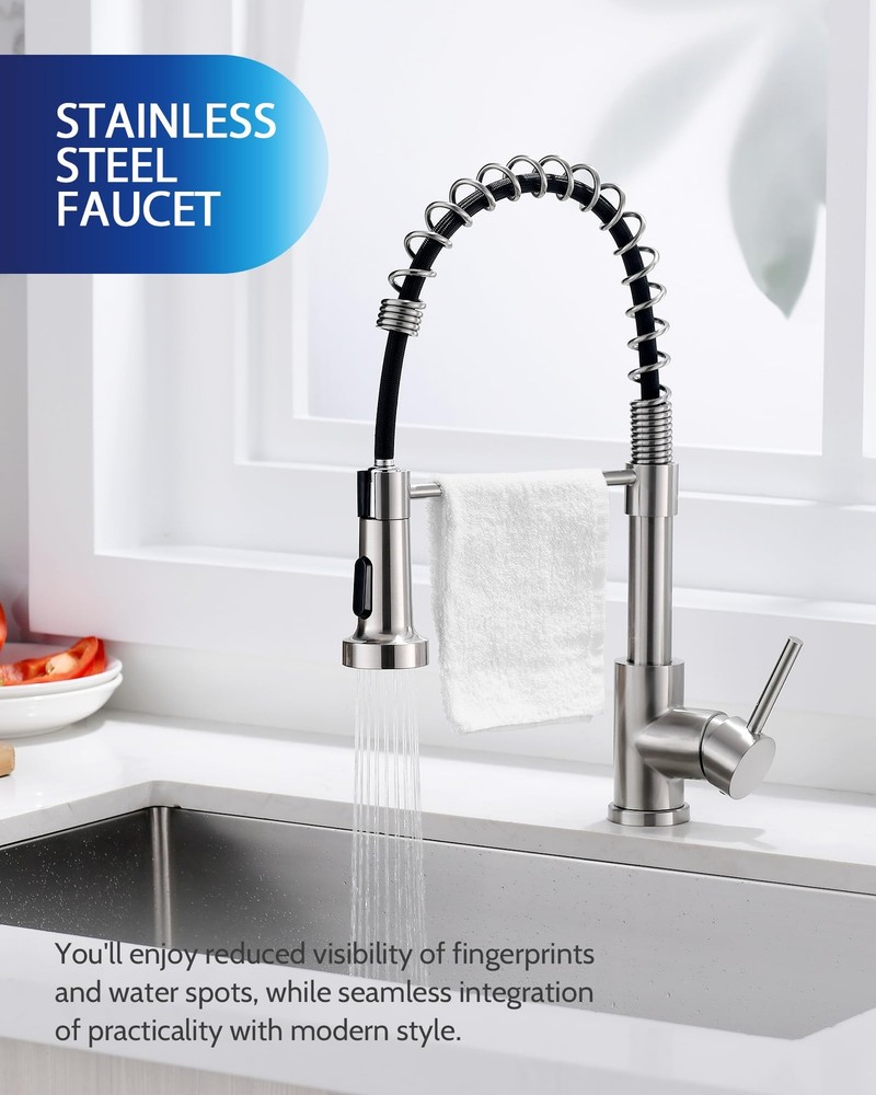 Kitchen Sink Faucets with Sprayer - High Arc Spring Design Single hanlde Single Hole Kitchen Faucet with Dual Function Sprayer for RV Kitchen Bathroom Camper ๐—™๐—น๐—ฒ๐˜…๐—ถ๐—ฏ๐—น๐—ฒ ๐—ฆ๐˜„๐—ถ๐˜ƒ๐—ฒ๐—น - This stainless steel kitchen faucet features flexible swivel functionality that prevents splashing and meets a wide range of cleaning requirements. Using it for cleaning will save you time and effort, allowing you to enjoy more of life. ๐—ฃ๐—ฒ๐—ฟ๐—ณ๐—ฒ๐—ฐ๐˜ ๐— ๐—ฎ๐˜๐—ฐ๐—ต - After extensive testing and investigation, our spring kitchen faucet has been designed with the most suitable single-hole size for comfortable washing. Its appearance and usability are both flawless for washing vegetables, fruits and dishes. ๐——๐—ผ๐˜‚๐—ฏ๐—น๐—ฒ ๐—™๐˜‚๐—ป๐—ฐ๐˜๐—ถ๐—ผ๐—ป๐˜€ - Our sink faucet with sprayer has two water functions - sprayer and steam mode - making it ideal for multitasking and making cleaning easier. It can truly serve as one of your best kitchen assistants and it is available in farmhouse or modern styles to decorate your kitchen. ๐—˜๐—ฎ๐˜€๐˜† ๐—–๐—น๐—ฒ๐—ฎ๐—ป๐—ถ๐—ป๐—ด - Our brushed nickel faucet for kitchen is of high quality and requires low maintenance. It also features a fingerprint-resistant function that effectively prevents dust, tarnishes, and watermarks. You won't need to spend more time cleaning - just wipe it down with a cloth. ๐—˜๐—ฎ๐˜€๐˜† ๐—œ๐—ป๐˜€๐˜๐—ฎ๐—น๐—น๐—ฎ๐˜๐—ถ๐—ผ๐—ป - This single-handle sink faucet is easy to install with its hand-twist installation method. It's as simple as installing a light bulb in your home without a plumber or any special tools. It truly offers the best bang for your buck and we also provide you with detailed instructions/videos to help you install and use it faster.