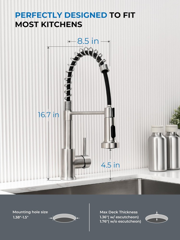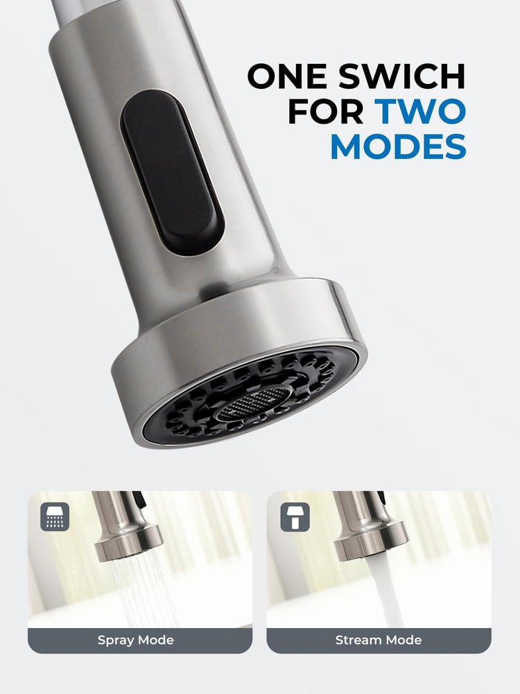 This kitchen faucet is a game-changer! The pull-down sprayer makes cleaning a breeze, reaching up to 23.6 inches for extra flexibility. The 360° swivel spout smoothly covers every corner of my double sink, and the dual water modes—stream and spray—handle any task effortlessly. The sleek stainless steel design adds a modern touch, and installation was surprisingly simple. No more struggling with hard-to-reach spots—this faucet makes kitchen work so much easier!