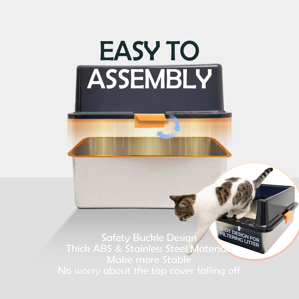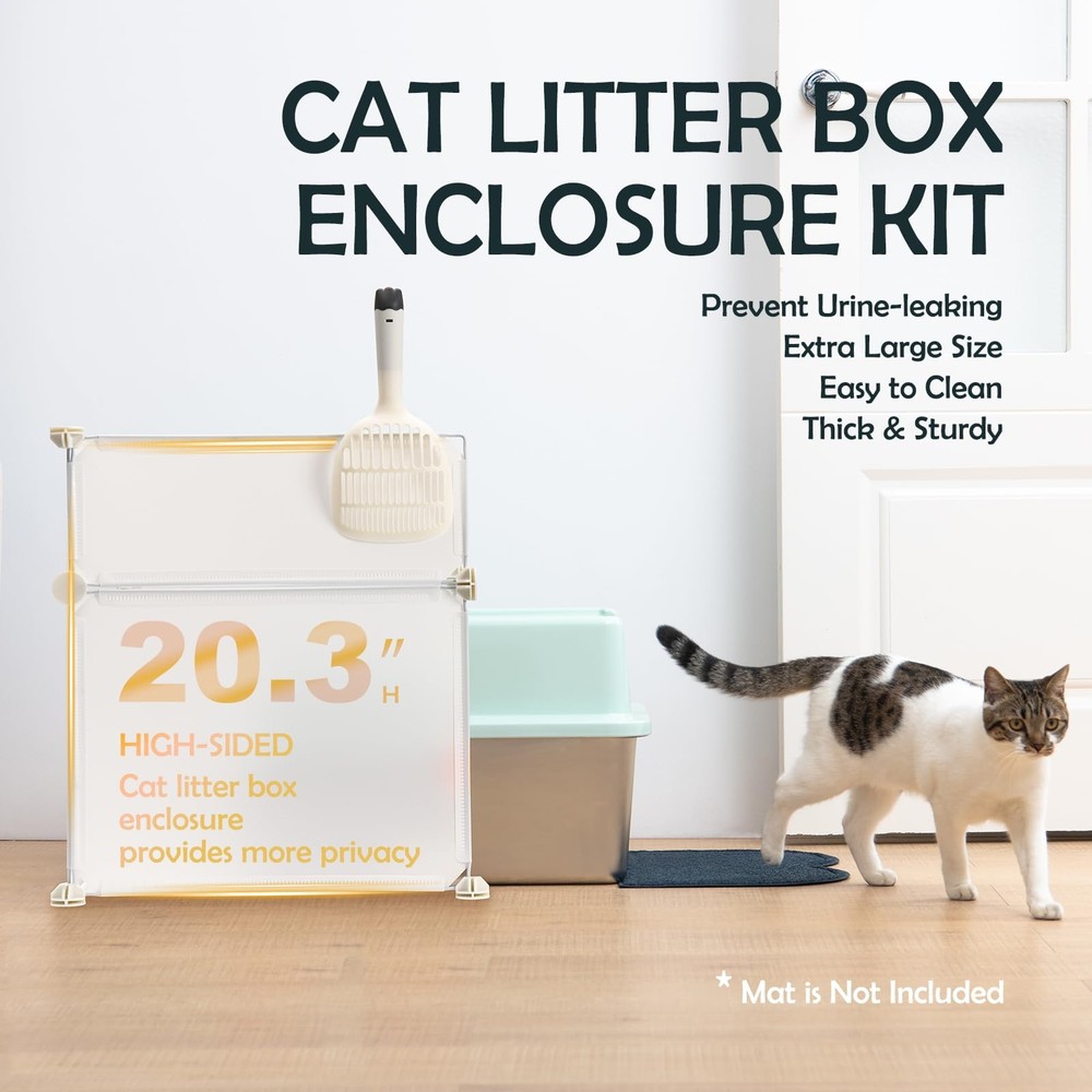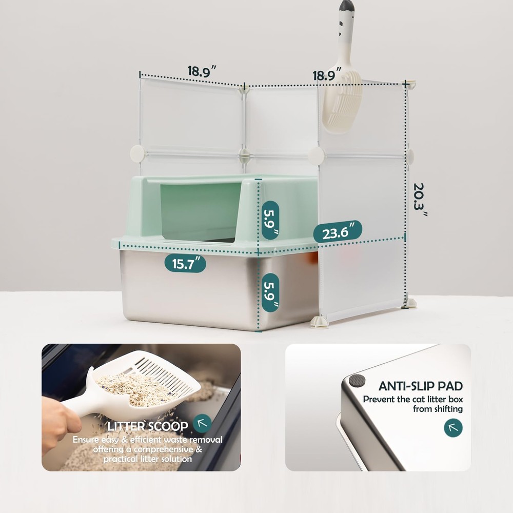 Pakage List : 1) Cat litter scoop 2) XXL Stainless steel cat litter box with lid 3)Cat litter box enclosure high side 【Extra Large Size Cat Litter box for Big Cats】XXL stainless steel cat litter box measures 23.6''x 15.7''x 11.8'', providing a comfortable space for cats of all breeds. The large litter pan of 20 liters capacity reduces the need for frequent cleaning and allowing you to leave home with peace of mind for up to 30 days. 【High-Sided Stainless Steel Cat Litter Box for High Peeing Cat 】 The metal cat litter box with high wall sides enclosure, with a 6'' plastic top cover overlapping the 6'' high jumbo cat litter box and special buckle design, keep the urine in the box instead of seeping through the seam, effectively preventing overflow and splashing. The high-sided covered cat litter box also provides more privacy space for cats. 【DIY Cat Litter Box Enclosure High Wall】 L18.9”×W18.9”×H20.3” inches (Hand measurement will have discrepancy of about 1/2" ), large DIY enclosure high side lead your cats to enter and exit from the passage and prevent cat litter from spilling on the floor, save litter and keep clean. You could DIY the splash guard shape and size according to the size of your cat litter box. 【Sturdy Stainless Steel Box】Made of ABS enclosed high wall enclosure and thick stainless steel, the enclosed stainless steel litter box is sturdy and resistant to rust and wear. 【Easy Cleaning and Doesn't Absorb Odor】It is easy to clean the stainless steel enclosed litter box of non-stick surface, leaving no lingering odors behind. Unlike plastic litter box, the stainless steel box does not absorb stains or odors.