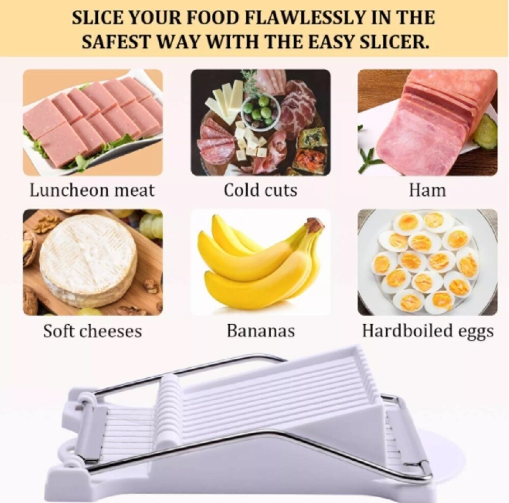 šš„ Stainless Steel Luncheon Meat Slicer - Easy Kitchen Cutter This slicer gets you even slices of luncheon meat, ham, cheese, bananas, or hardboiled eggs in seconds! š„Ŗš Specs : About 8.74ā long, 5ā wide, with stainless steel wires spaced 0.3ā apart. Lightweight (7.05 oz). Material : Food-grade PP/ABS plastic (base) + sharp stainless steel wires (durable & safe). ⨠How to Use : Put food (like luncheon meat) on the base, press the wire frame down. Done! š Uses : Works efficiently on luncheon meat, cold cuts, ham, soft cheeses (like brie), bananas, and hardboiled eggs. Perfect for creating neatly sliced ingredients for snacks, meals, or party platters.šāļø