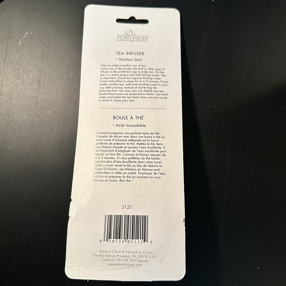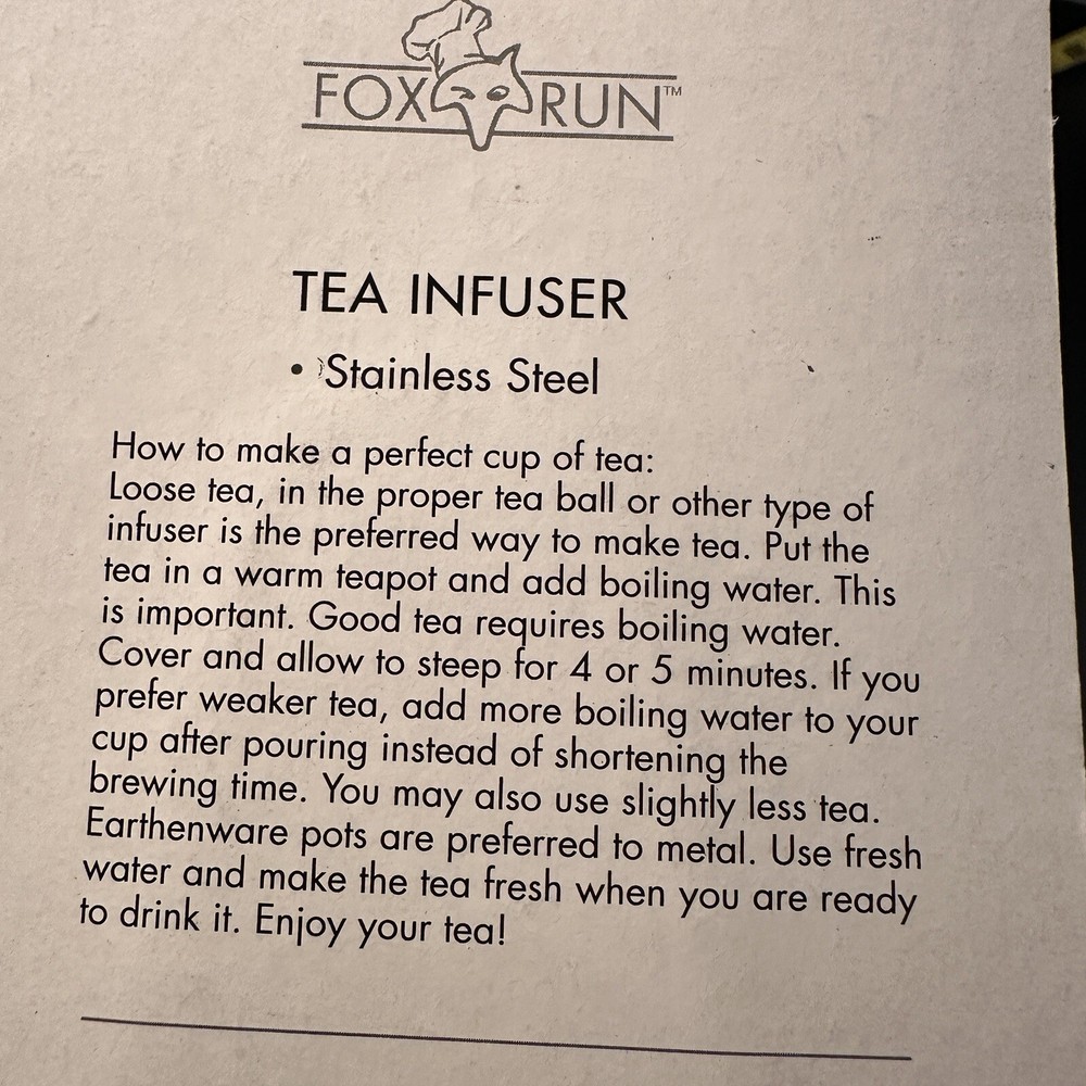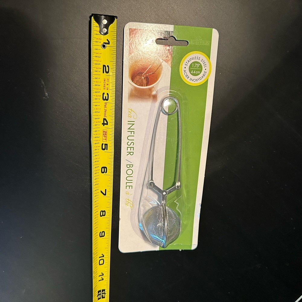 Fox Run Stainless Steel Snap Mesh Ball Tea Infuser Loose Leaf Filter Strainer w/ Handle At the time of listing this, I am selling multiple quantities of these. One of the packages has a slight rip in the cardboard. I’m assuming you’re not buying this for the cardboard so if this is an issue, please let me know before buying. If you would like to see a photograph of it just message me and I will get that for you. The stainless steel infuser is still secured in the package. The package is the only thing that was torn.
