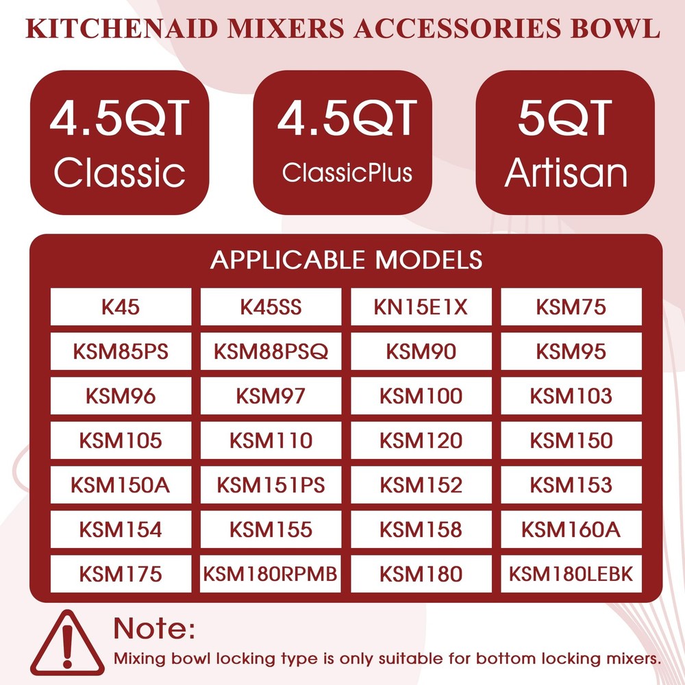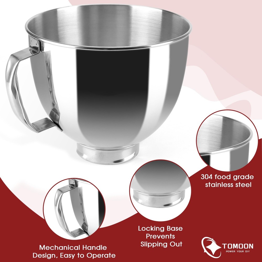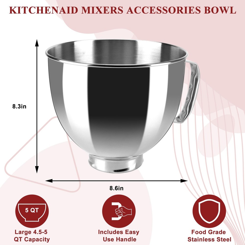 This stainless steel bowl,large bowl for kitchenaid mixer, is compatible with all 4.5 and 5 Quart KitchenAid tilt-head household Stand Mixers, includingKseries K45, K45SS, KN15E1X, KSM75, KSM85PS, KSM88PSQ and KSM series KSM90, KSM95, KSM96, KSM97, KSM100, KSM103, KSM105, KSM110 ,KSM120, KSM150, KSM150A, KSM151PS, KSM152, KSM153, KSM154, KSM155 KSM158, KSM160A, KSM175,KSM180RPMB ,KSM180, KSM180LEBK. This stainless steel stand mixer bowl for KitchenAid stand mixers,KitchenAid Mixer Accessories, is composed of premium quality 304 food-grade stainless Steel durable, scratch-resistant, and which assures endurance in a range of temperatures. Our stainless steel kitchen aid mixer bowl with handle boasts ample space to handle large quantities of dough or batter, making it the perfect solution for baking multiple loaves of bread, batches of cookies, or larger cakes with ease. Its spacious design lets you prepare up to 4-5 large loaves of bread or 3-4 cakes, guaranteeing convenience and efficiency in all your baking endeavors. Multi-Purposes--This kitchen aid mixer bowl for stand mixer can be used as original kitchenaid mixer bowl in both material and function. It's sturdy and durable. This kitchenaid mixer attachments bowl is your real kitchen friend which can aid you in mixing flours/icecream/ beating eggs and blending salads.It can be bought as a KitchenAid bowl who excels in the kitchen when it comes to baking tasks. Dishwasher Safe -- This mixer bowl can be washed in dishwasher and you can be carefree about stains left on it after using. KITCHEN AID ACCESSORIES: Compatible with 4.5QT and Artisan 5QT KitchenAid Tilt Stand Mixers with 5KSM125, 5KSM150, 5KSM175, 5KSM7580, KSM150, K45, K45SS, KSM75, KSM90, KSM95, KSM100, KSM103, KSM110, RRK150 and more. KSM110, RRK150 and more compatible (please check your mixer model) LARGE CAPACITY MIXING BOWL:Our KitchenAid bowls for stand mixer giving you plenty of room for mixing dough, batter, and more—no spills, no mess! The sturdy handle ensures a secure grip while pouring or transferring,ensuring smooth, efficient blending every time QUALITY STAINLESS STEEL:Stainless steel attachment for mixers bowls are made of high quality 304 stainless steel, food-grade, rust-proof, and won’t absorb stains or odors,does not attract odors or stains.Kitchen aid mixers accessories are suitable for a variety of kitchen baking DISHWASHER CLEAN: No scrubbing needed! This Kitchen Aid bowl for mixer is dishwasher-safe for quick cleanup—just toss it in or hand wash with warm soapy water. Spend less time cleaning and more time baking ABOUT :Unlike flimsy plastic bowls, our stainless steel KitchenAid mixing bowl is durable, scratch-resistant, and built for long-term use—perfect for home bakers and pros alike!We produce professional kitchen baking parts and accessories, if you have any dissatisfaction with our kitchen aid mixer bowl , please through , our team will be happy to help you